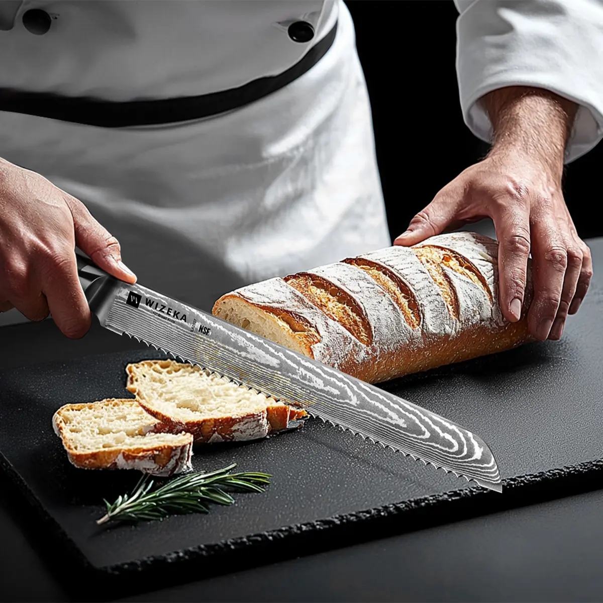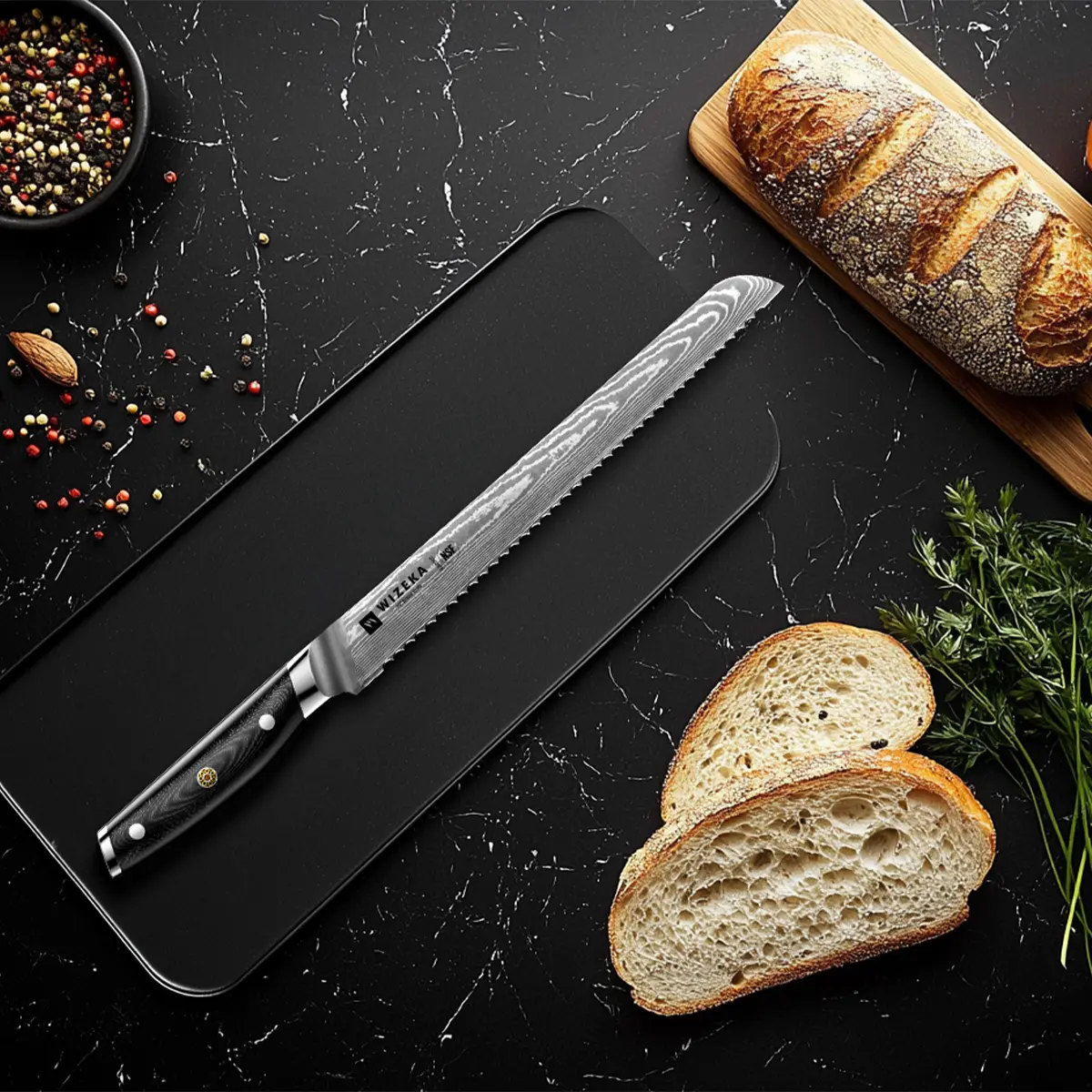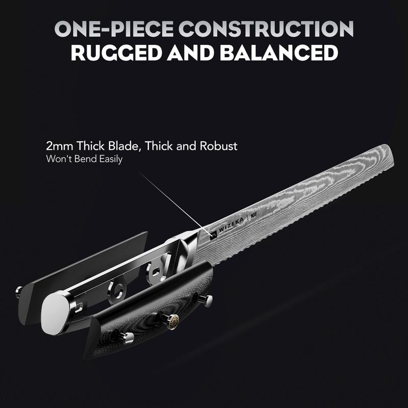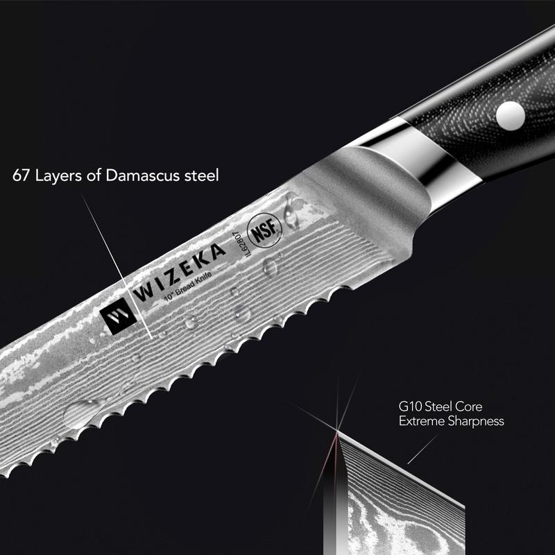 ·Damascus series bread knife is forged from 66 layers of damascus steel sandwiched with VG10 steel core. The steel has a unique and exquisite pattern of real Damascus. The hardness can reach 60 (with a tolerance of 2), making it easy to cut handmade hard bread.