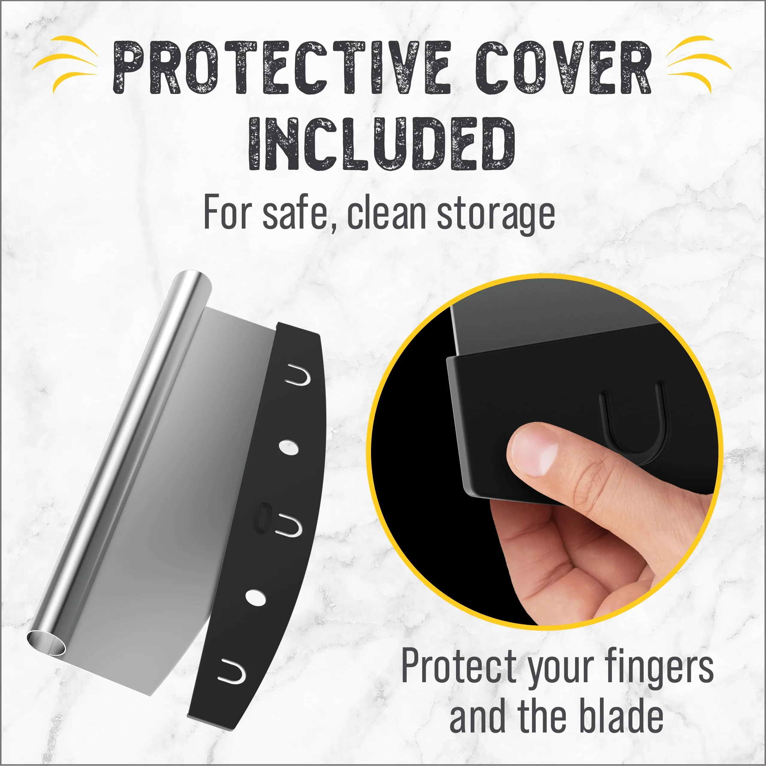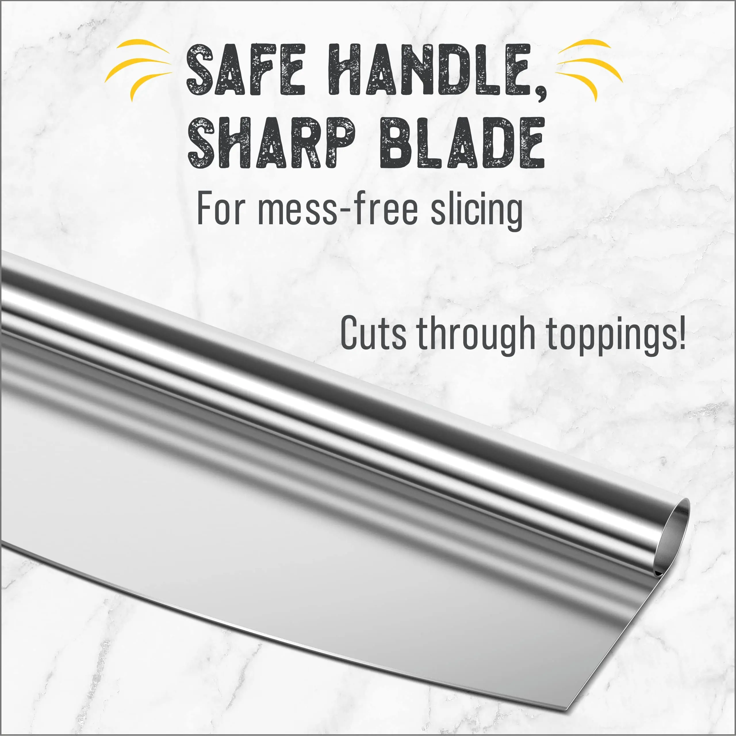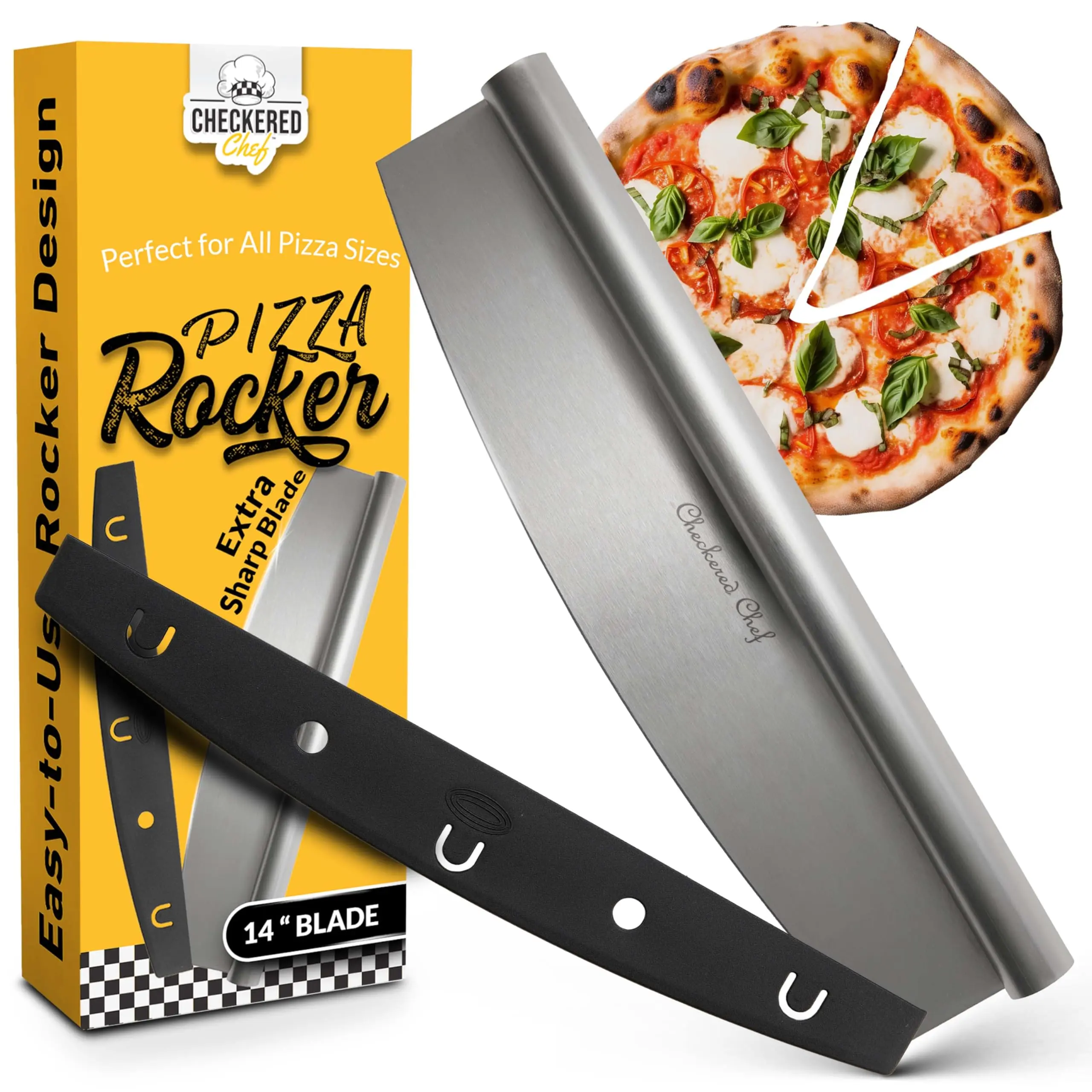 Your search for the perfect pizza cutter is finally over. Here are just some of the things you can look forward to when you purchase your pizza cutter today… You’ll finally have a safe way to store it! That’s right, ours is the only rocker style pizza knife cutter that comes with our uniquely designed protective sheath. So you can store it safely in the drawer without ever cutting your fingers on it and without worrying about damaging the blade. If you’ve never tried a rocker pizza cutter before you’ll be amazed at how quick and easy it is to cut up a pizza, you’ll be cutting pizzas like a pro in no time at all. Even if you’re an old hand at rocker cutters you’ll still be impressed by our super sharp blade - in four simple cuts you’ve got eight perfect pizza slices. Keep your toppings where you want them - on the pizza! Sick of pushing your pizza topping around with a roller cutter? Rocker style cutters are the perfect solution to keep pizza toppings in place and our super sharp blade means you can slice through toppings and base with ease. Clean up doesn’t get any easier - deliberately constructed from one solid piece of commercial quality 18/0 stainless steel with no wooden handle, so that you can simply throw it in the dishwasher when you’re done! You’ll be amazed at just how many uses you will find for your new pizza cutter, from pizzas to herbs and even bars and brownies the possibilities are endless. Backed by Checkered Chef’s satisfaction guarantee we just know you’re going to love having this tool in your kitchen. Add one to your cart today and start dreaming about that first pizza you’re going to slice!