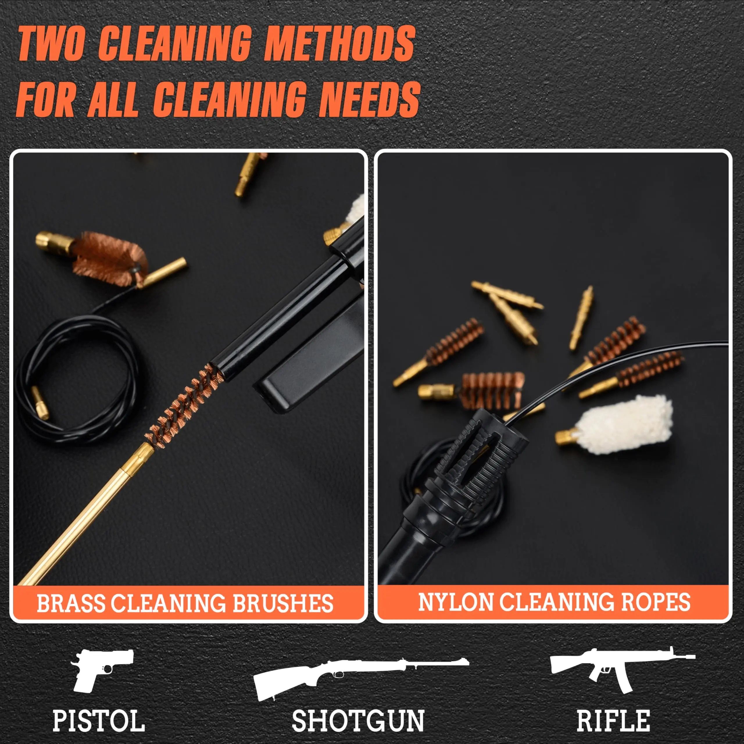 Ā·ćUniversal Cleaning KitćThis Cleaning Kit can be used to clean various types of gear. Multi-caliber accessories to meet all daily gun cleaning needs, you don't need a separate kit for each gun. All accessory and rods are made of high-quality brass which will prevent damage. No cheap plastic, surprised at their firmness and durability.