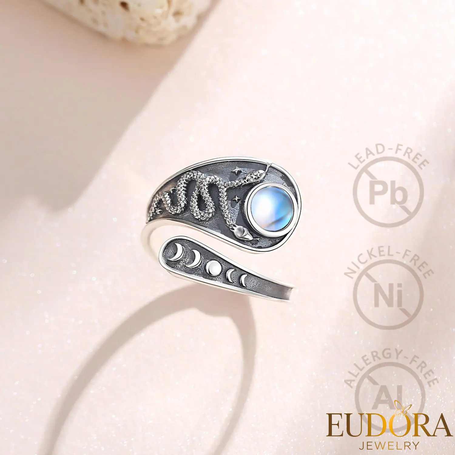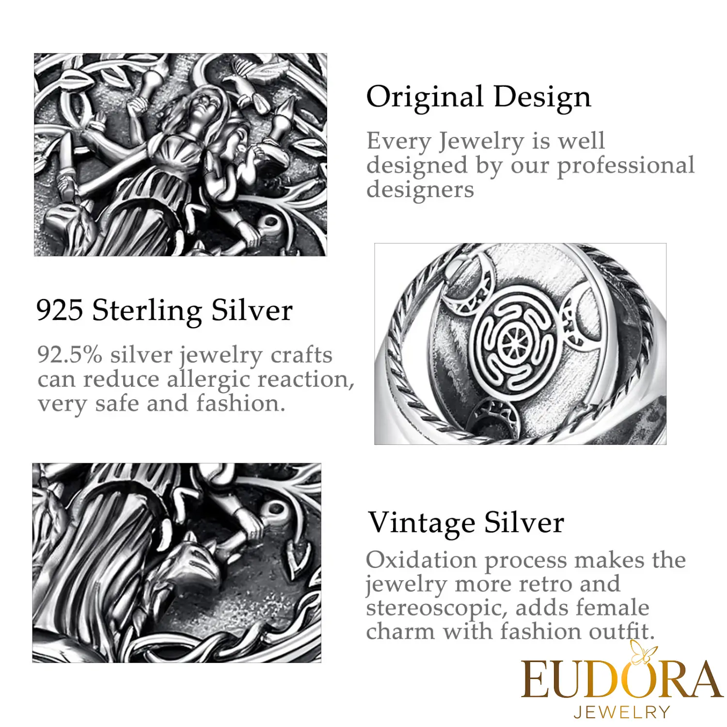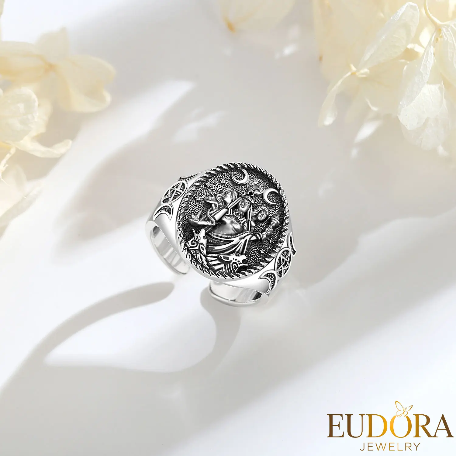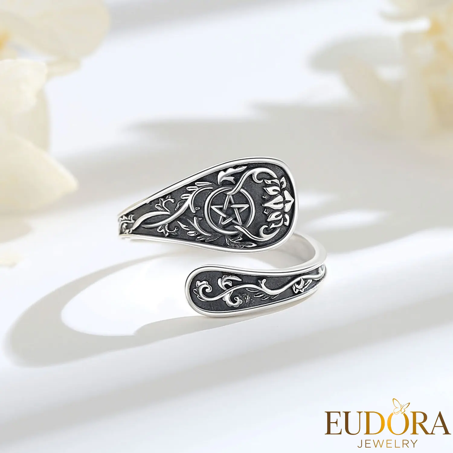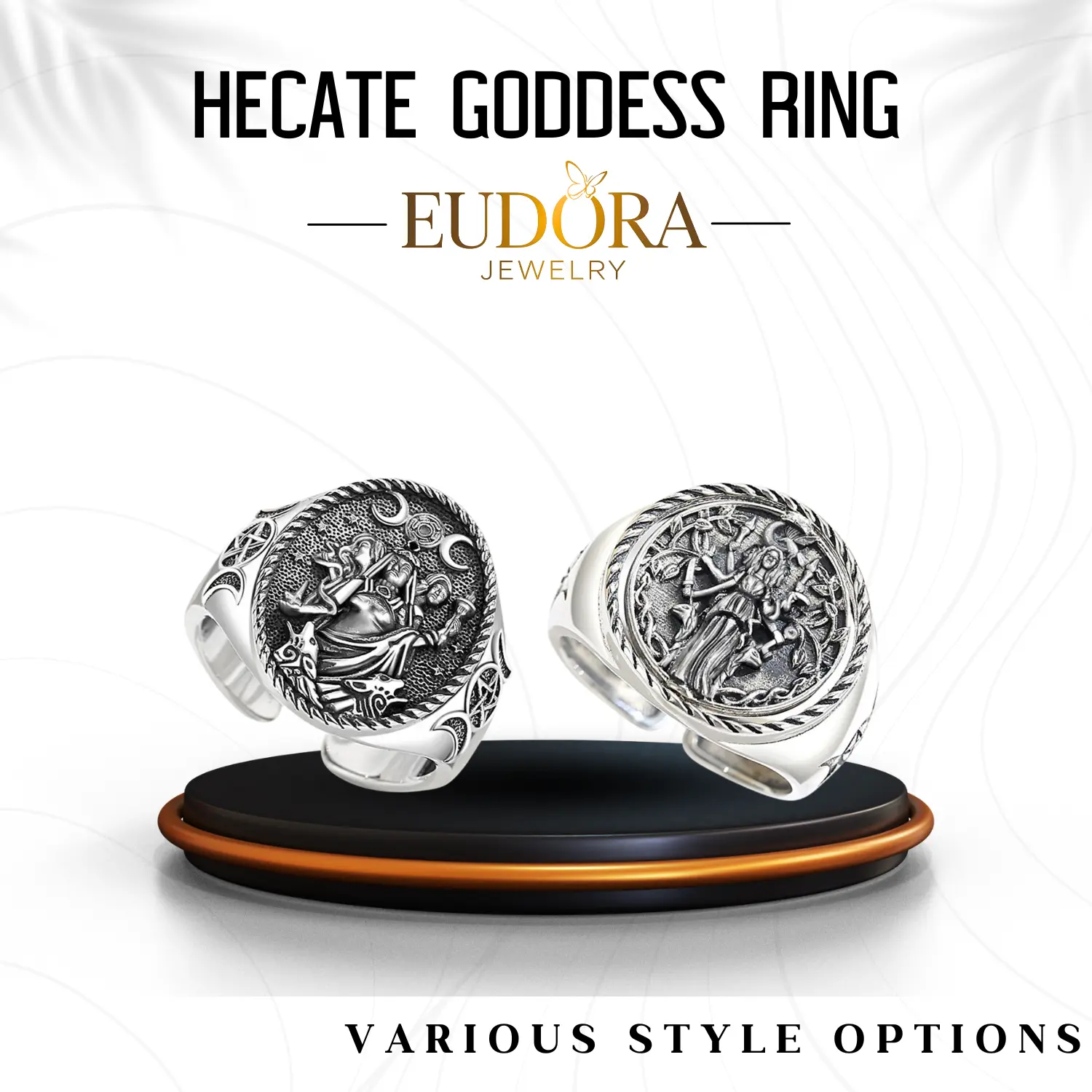 Unlock the mystical power of Hecate, the ancient Greek goddess of magic, the moon, and the underworld, with this adjustable sterling silver ring by EUDORA Jewelry.