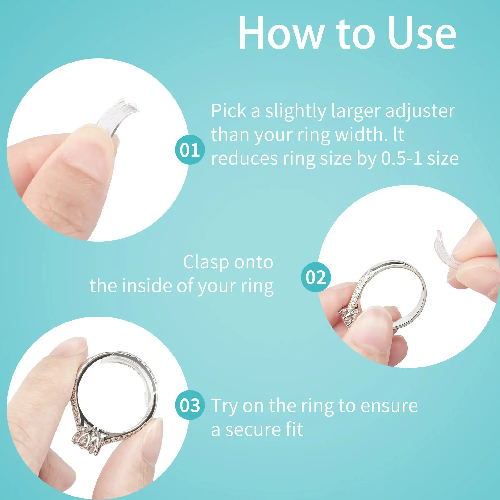 Ā·Ease of Use - Pick a ring size adjuster that is slightly larger than the width of the ring and snap it to the inside of the ring. Then try on the ring to make sure it fits. Easy to wear and adjust, can be used to fasten loose rings. Easily removes for cleaning and wipes away dirt with ease.