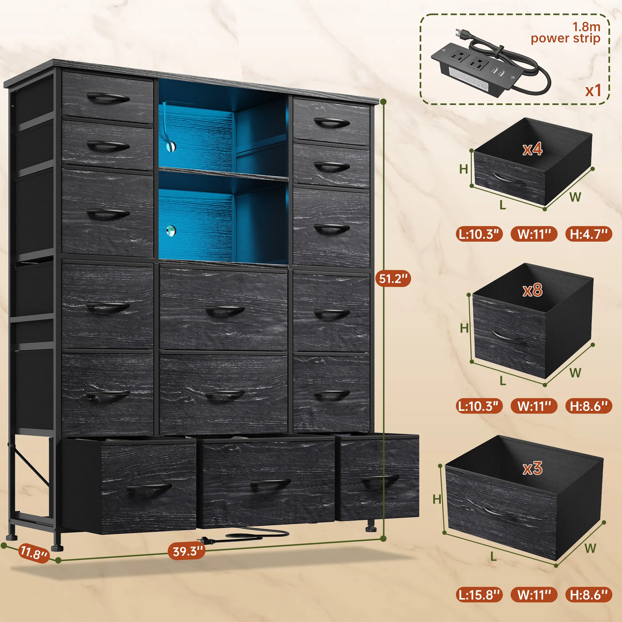 ·Remote-Controlled LED LightsSet the mood with a click. The included remote control lets you adjust the LED light colors and brightness. Whether you want a soft glow for a cozy night in or bright light for finding the perfect outfit, this dresser delivers a touch of romance and fun to your room.
