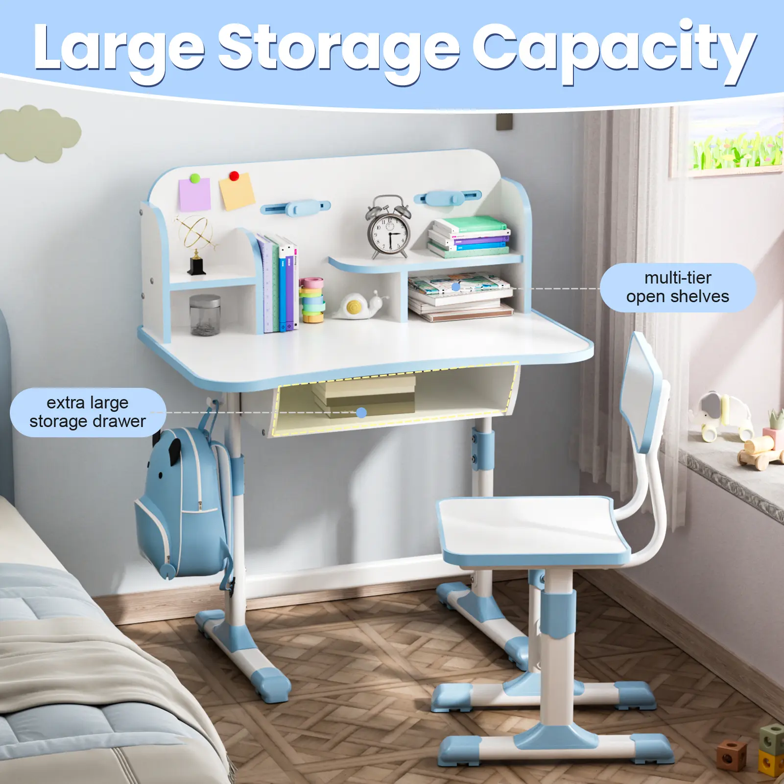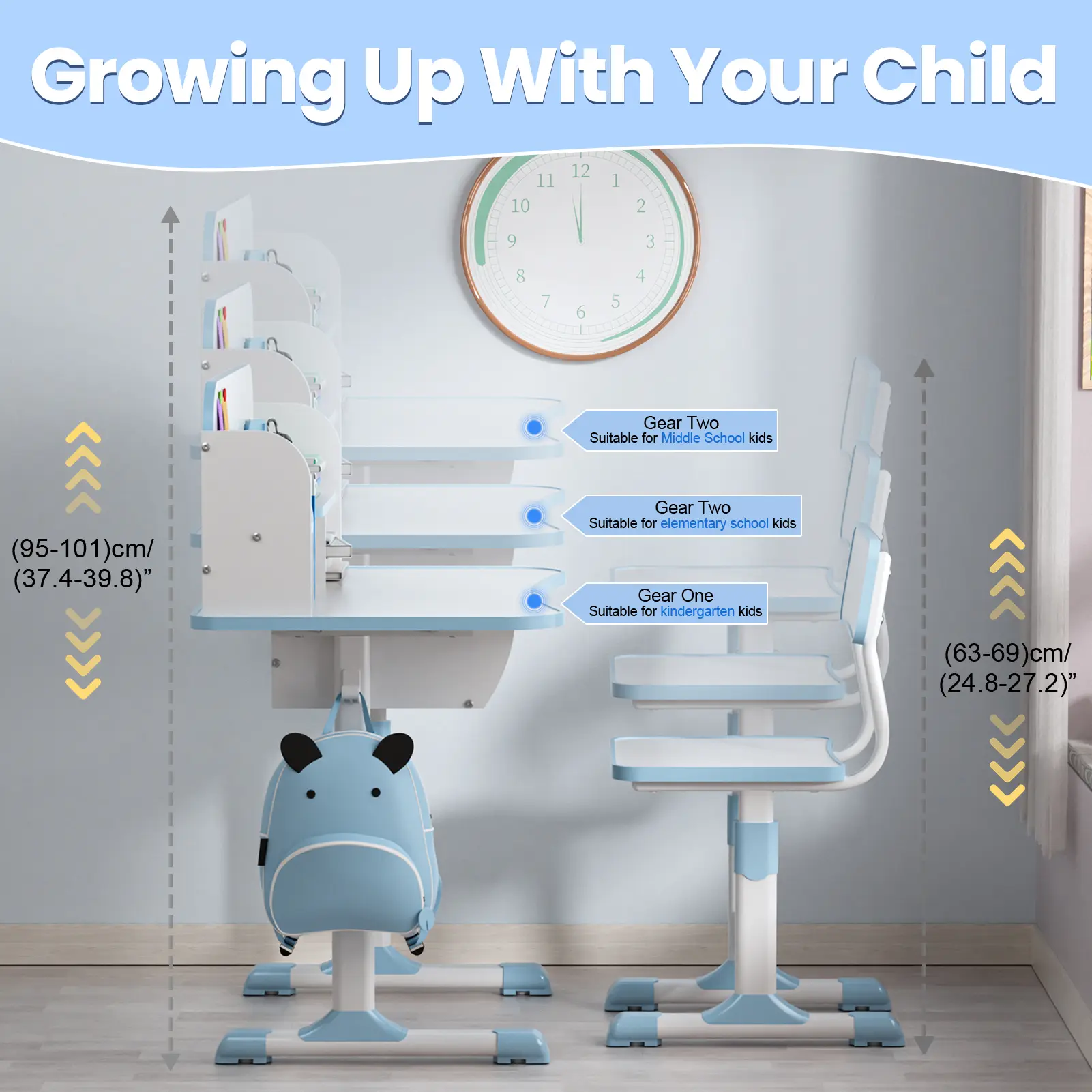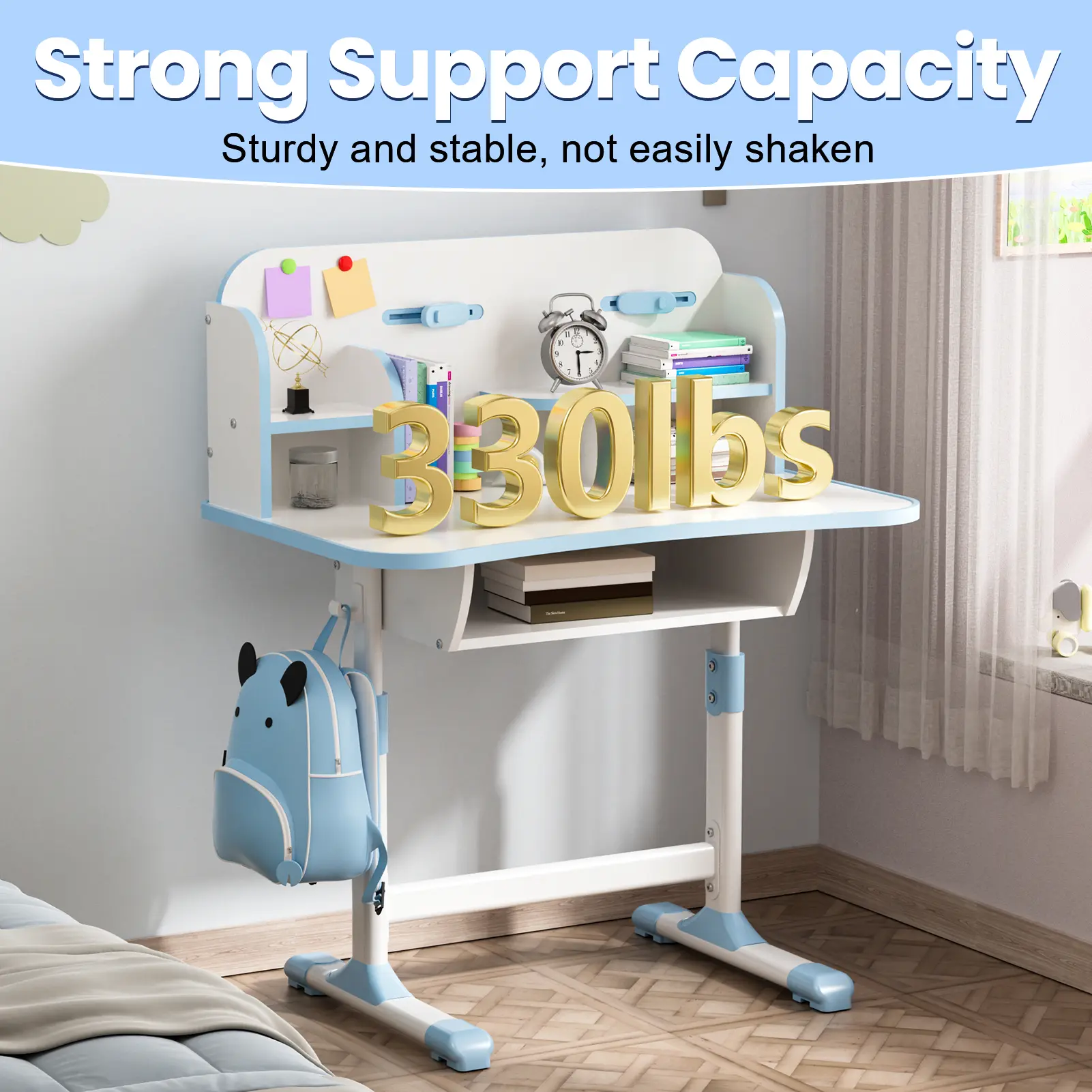 Golden Distance Design & Book Bucket Design: Golden distance design can keep your child upright sitting posture, protect children's vision. Spacious storage book bucket under the desktop to store school supplies.