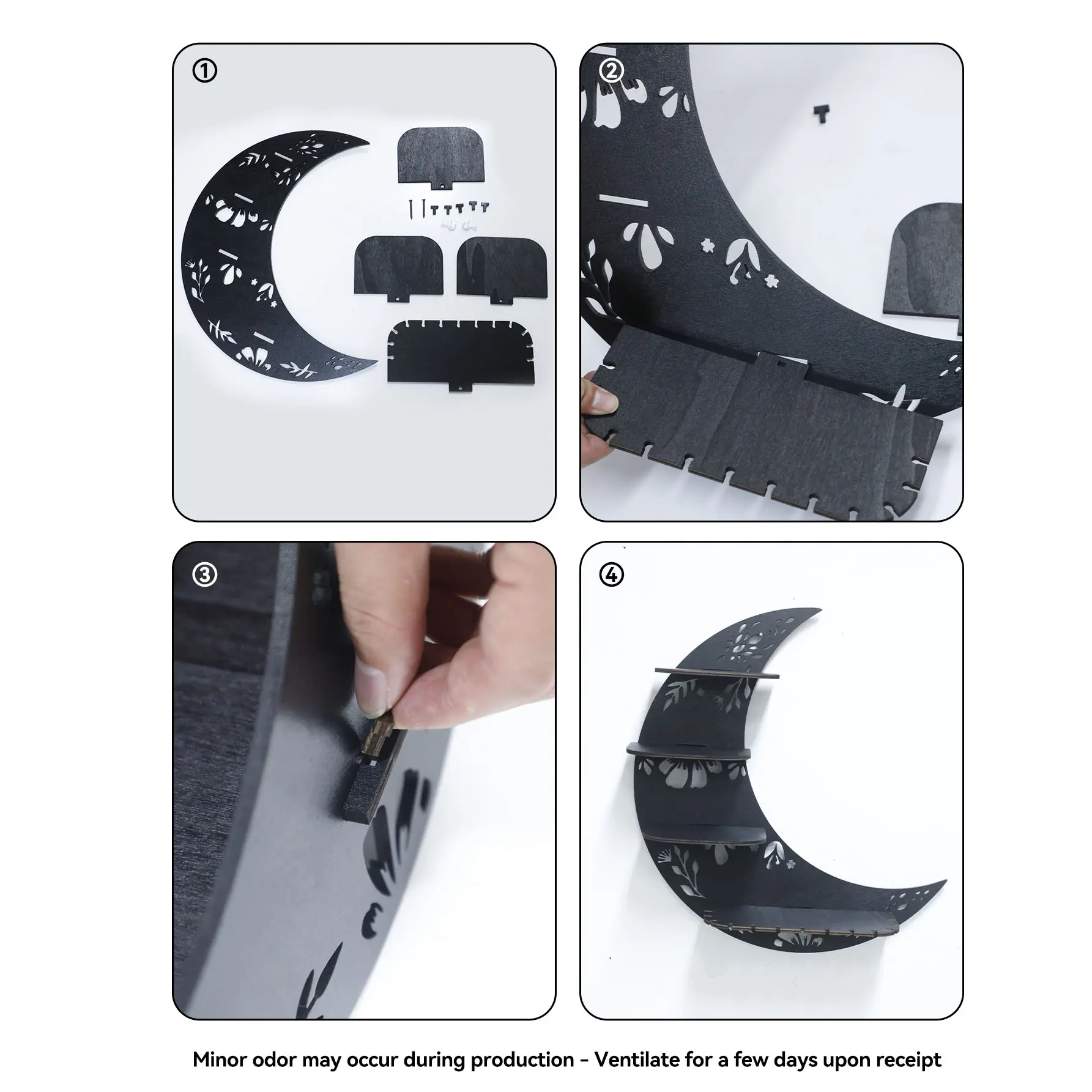 Product quality: I was deeply disappointed because my shelf arrived broken in 4 pieces and the quality of the shelving material was very thin and almost like the consistency of cardboard.