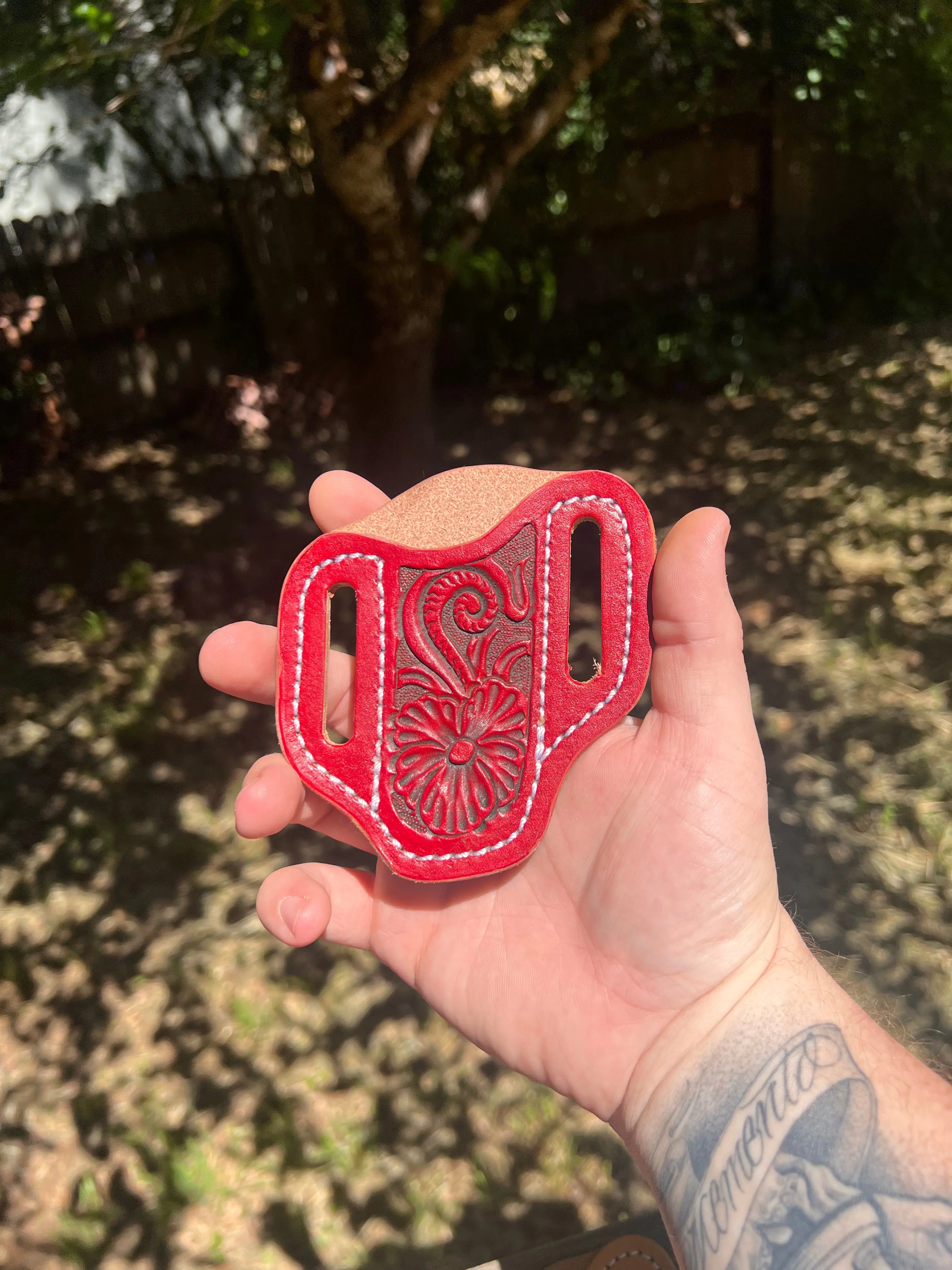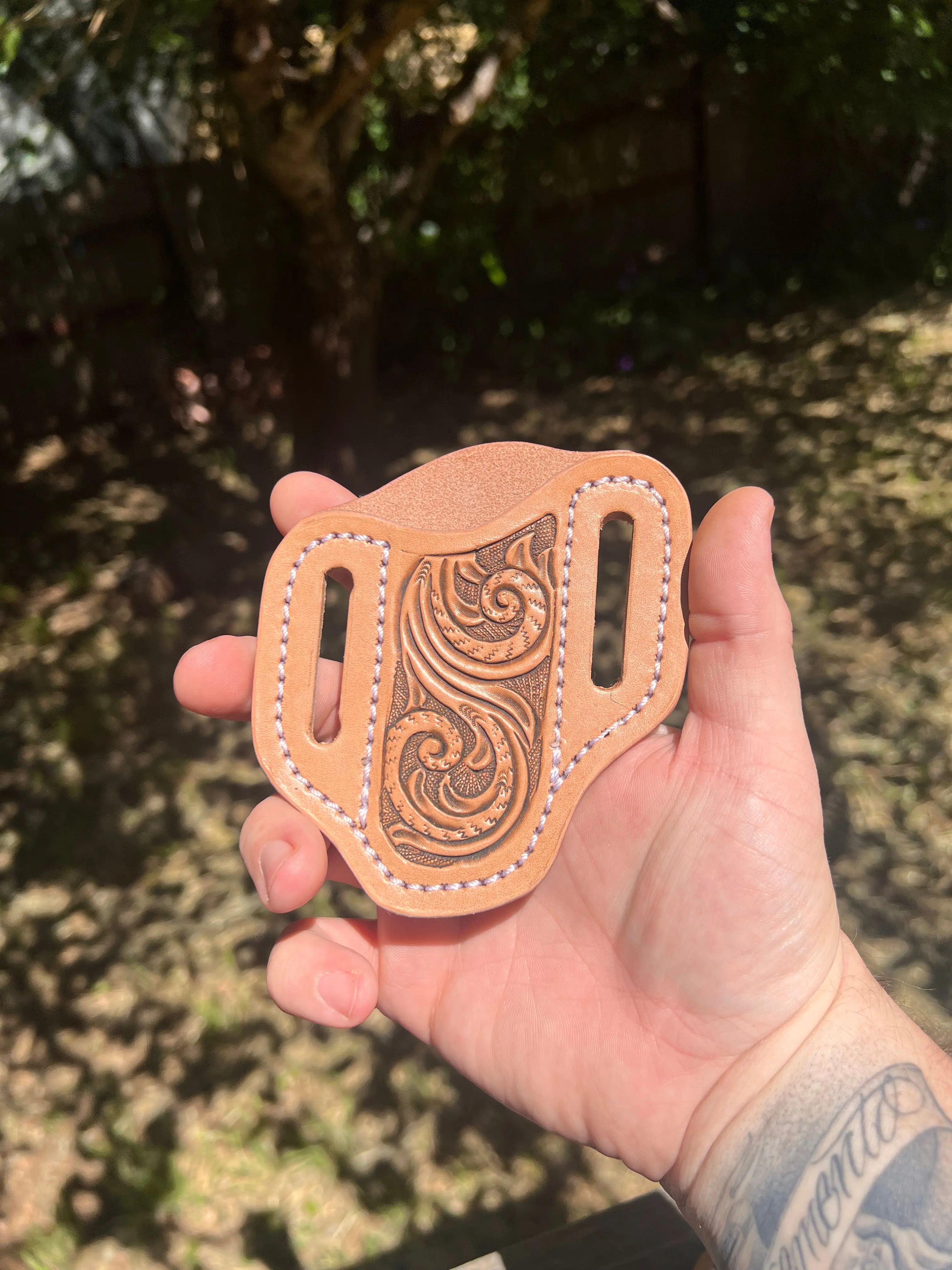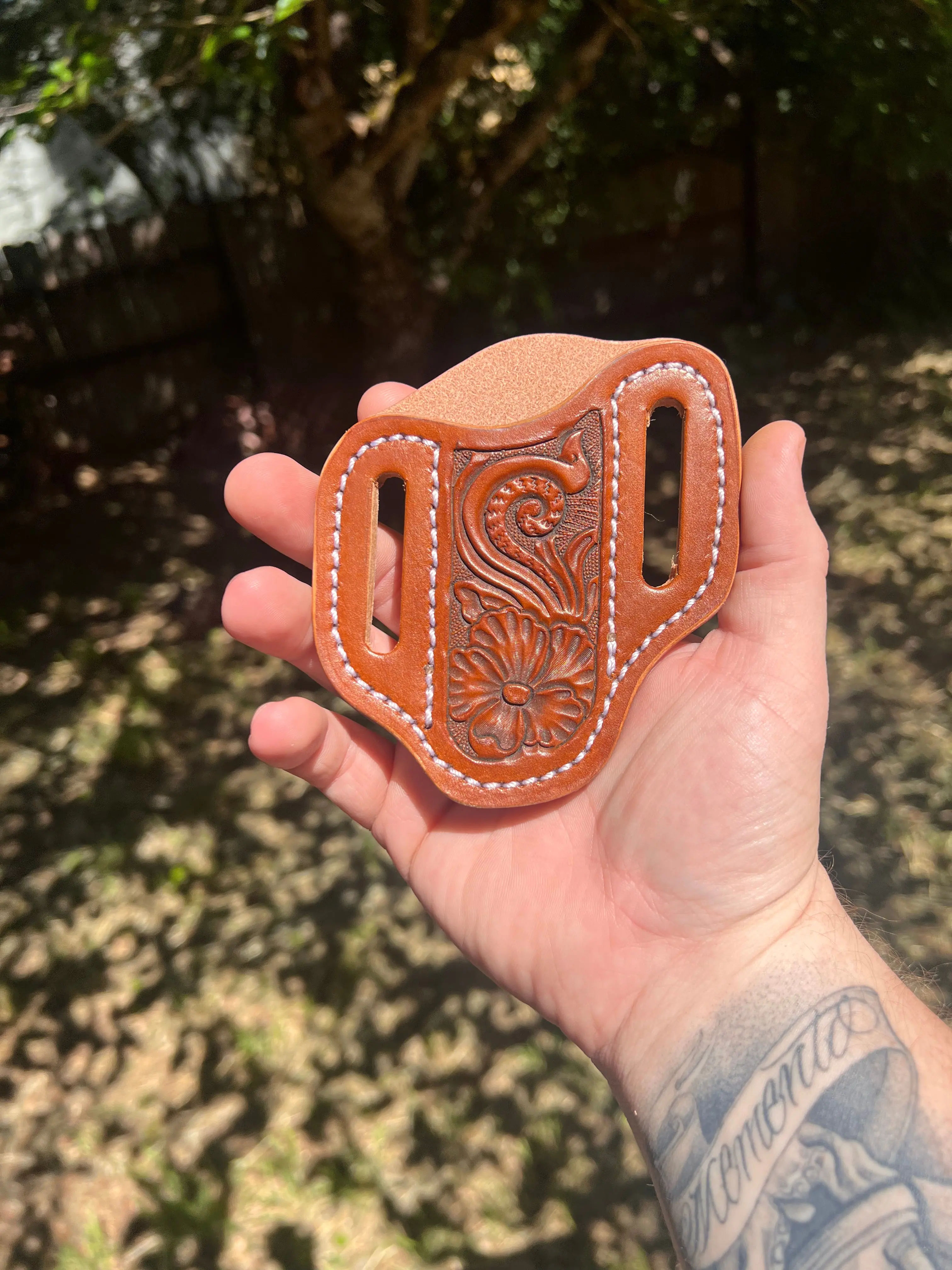 Tooled leather pancake style trapper knife sheaths made of full grain Hermann Oak leather featuring various floral/ tooled designs.