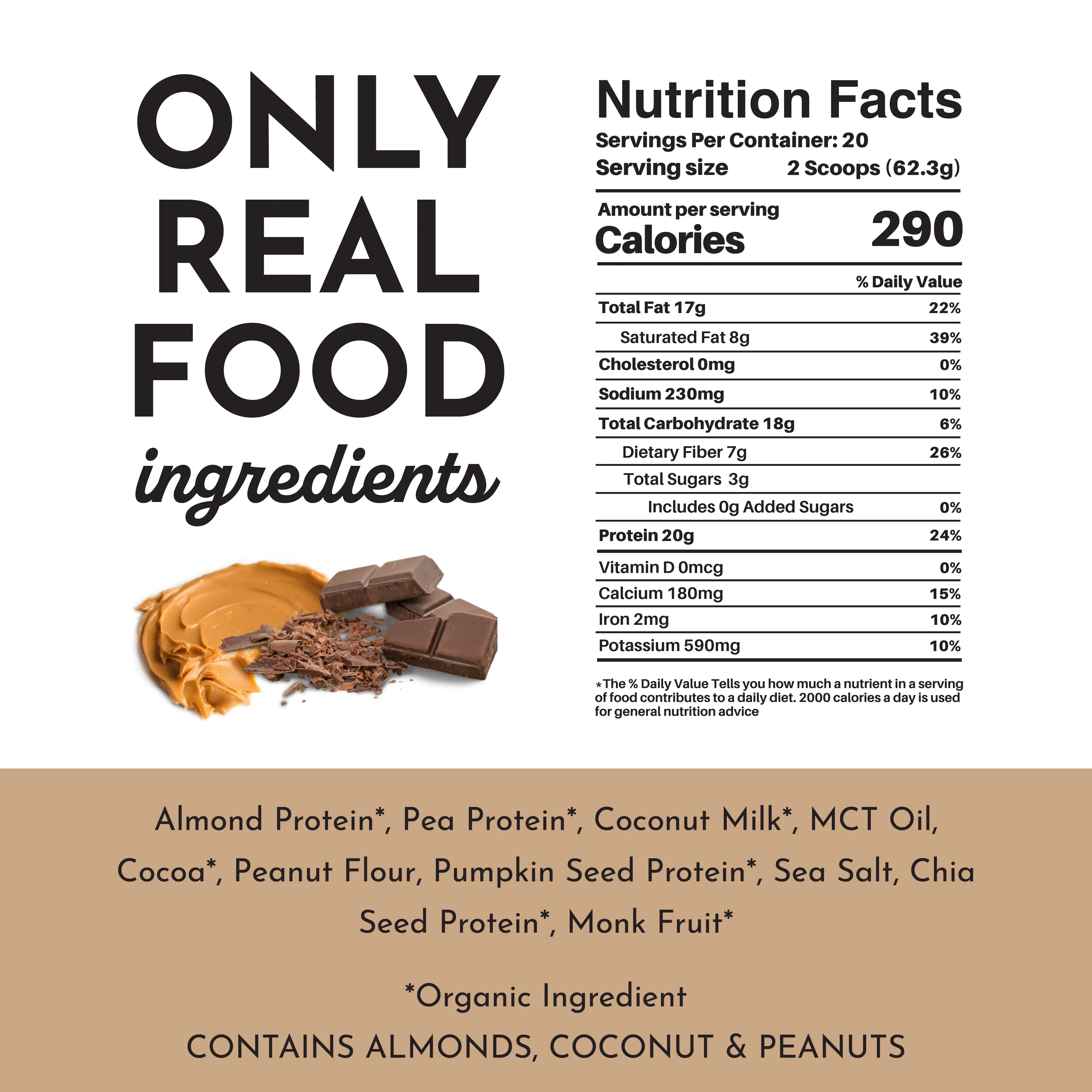IngredientsAlmond Protein*,Pea Protein*,Coconut Milk*,MCT Oil,Cocoa*,Peanut Flour,Pumpkin Seed Protein*,Sea Salt,Chia Seed Protein*,Monk Fruit*,*=Organic Ingredient