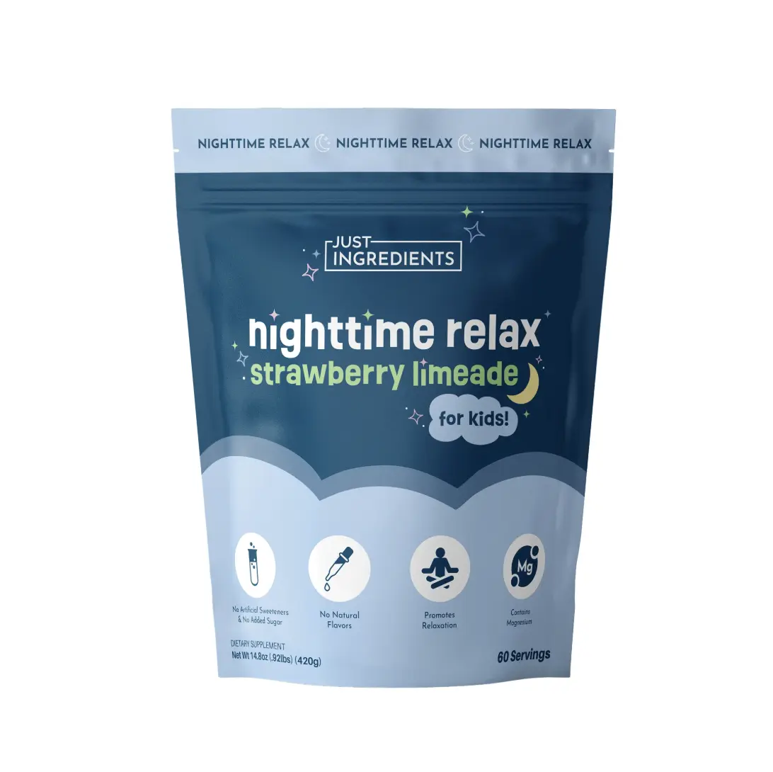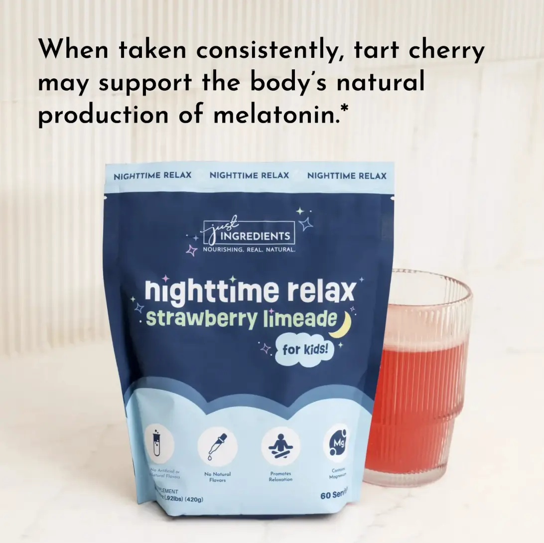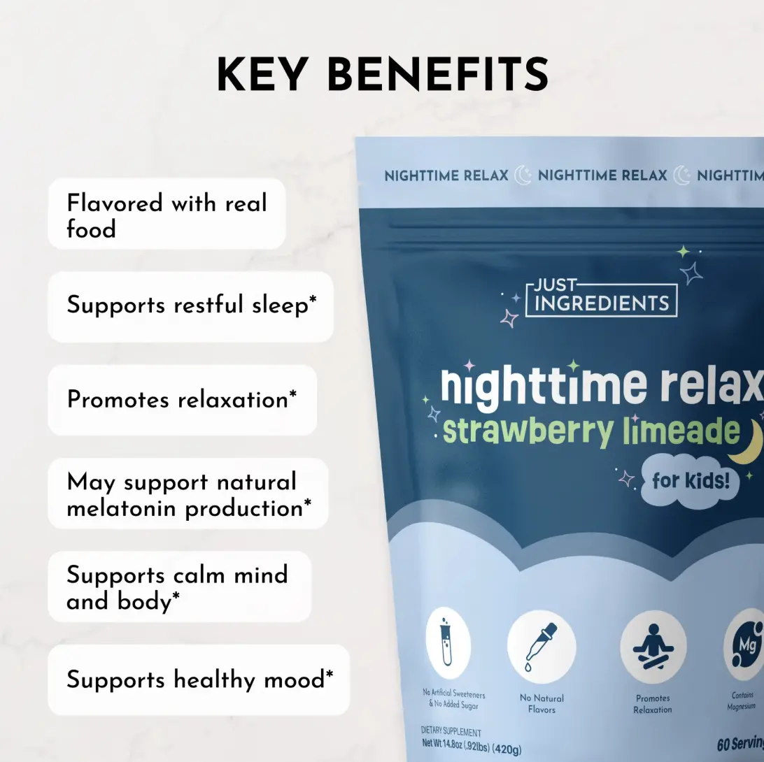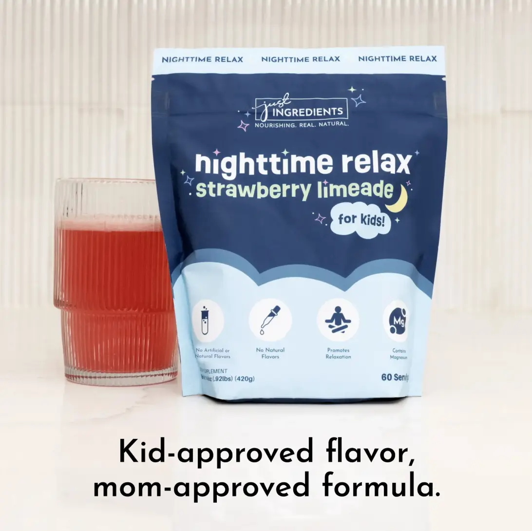 The same ingredients as our Strawberry Limeade Nighttime Relax, now in a dosage specifically for kids ages 4+! This delicious drink is packed with magnesium to help their little bodies relax, along with calming ingredients like tart cherry extract and inositol, this soothing drink can help kids unwind and drift off into a peaceful sleep.