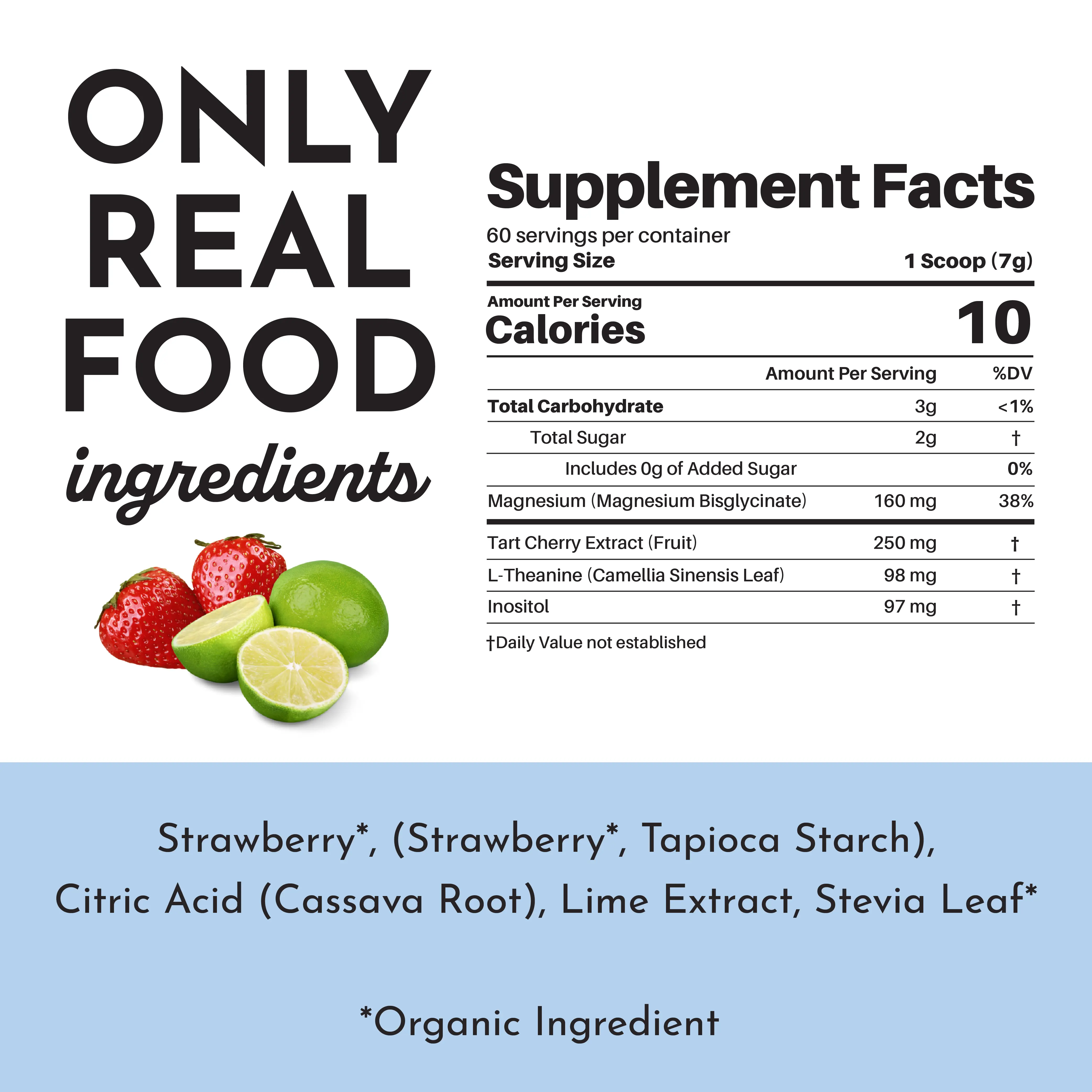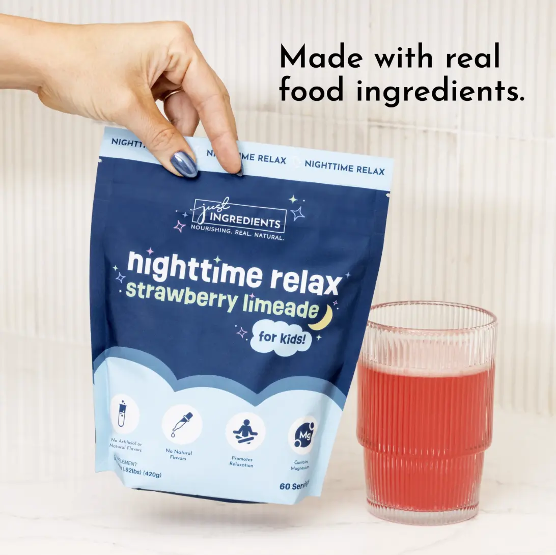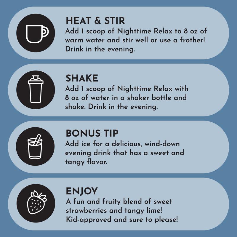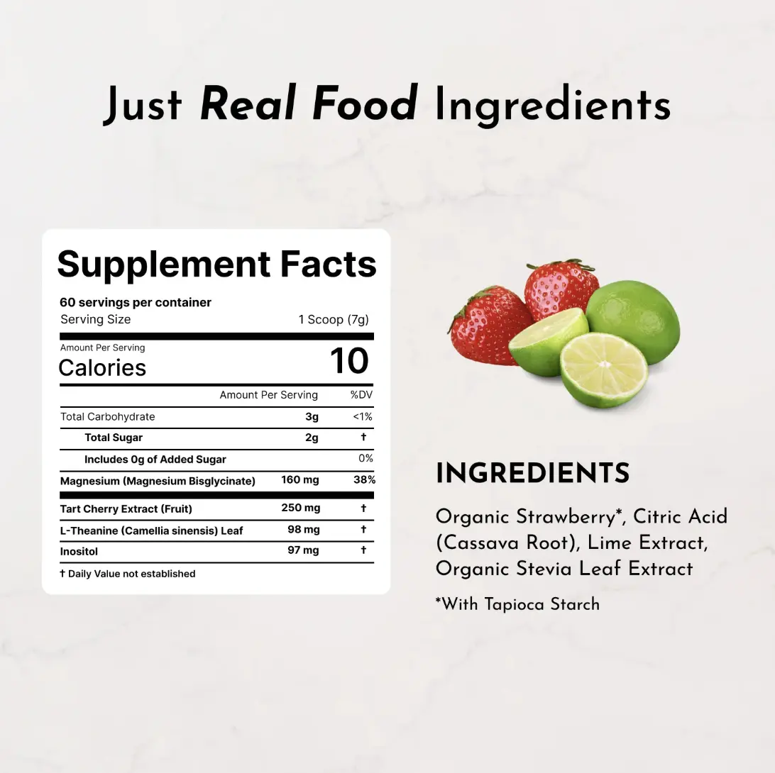 The same ingredients as our Strawberry Limeade Nighttime Relax, now in a dosage specifically for kids ages 4+! This delicious drink is packed with magnesium to help their little bodies relax, along with calming ingredients like tart cherry extract and inositol, this soothing drink can help kids unwind and drift off into a peaceful sleep.