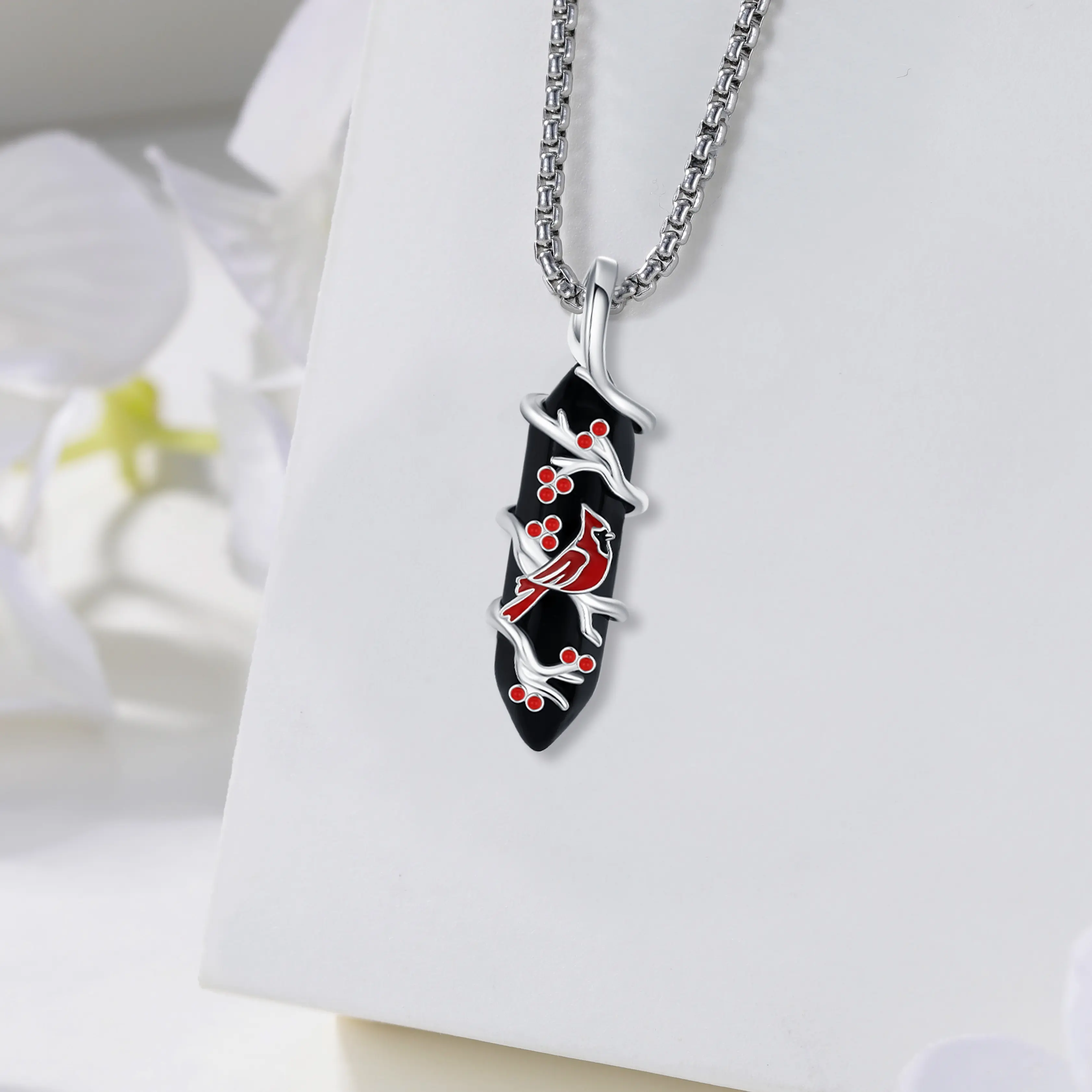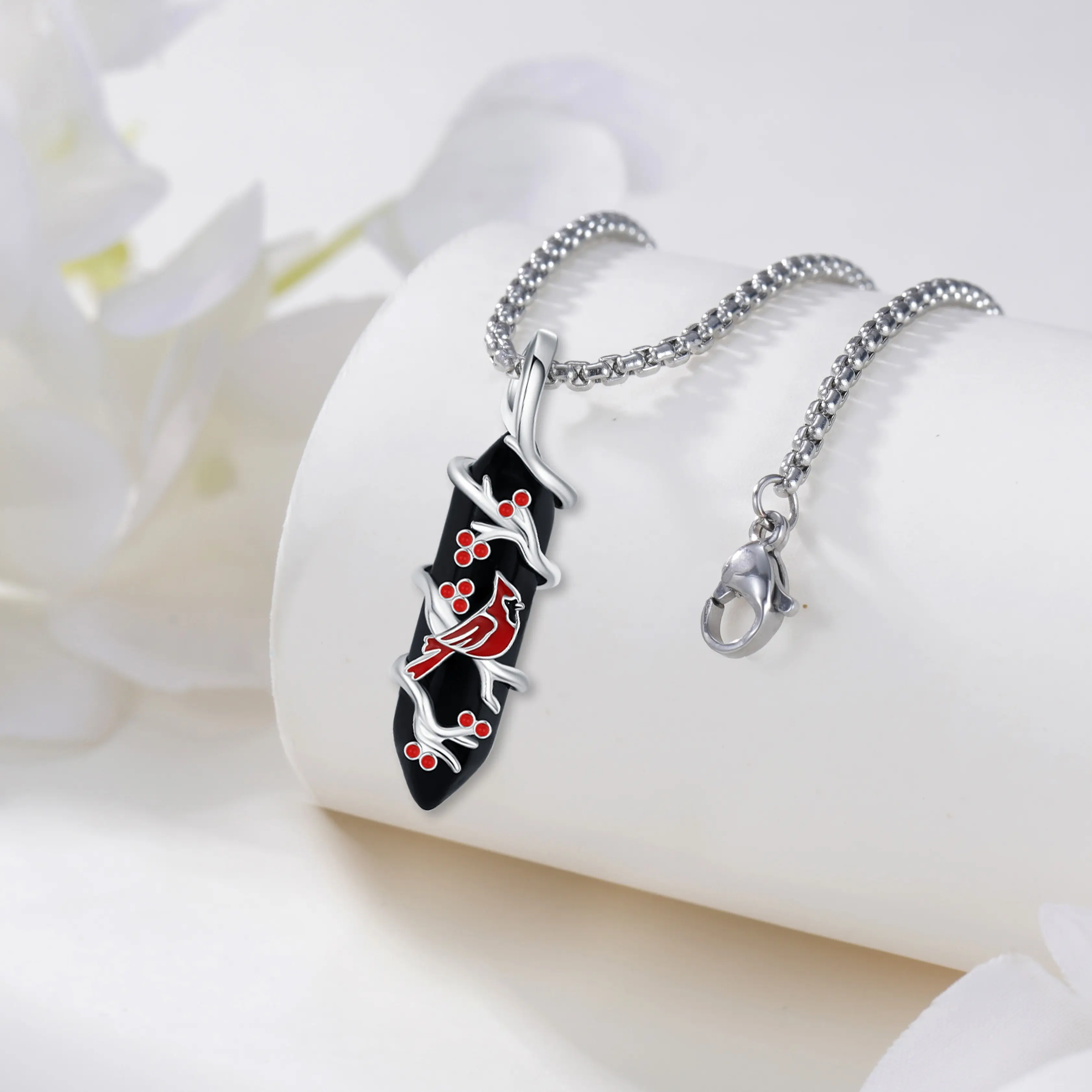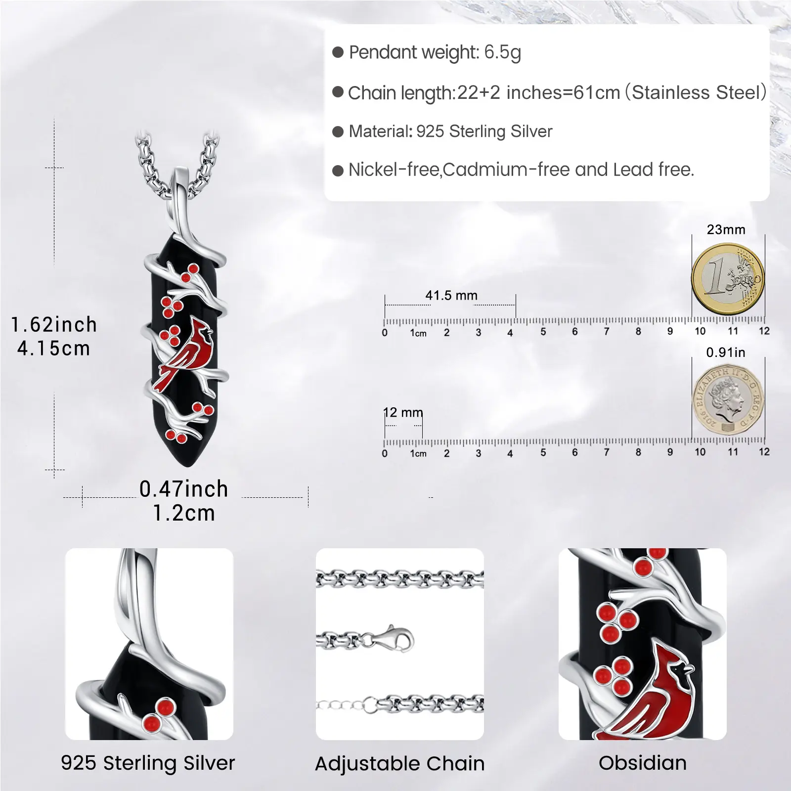 The pendant is made of 925 sterling silver and Obsidian, nickel-free, lead-free, cadmium-free, and hypoallergenic. Suitable for long-term wear. The chain is made of stainless steel.