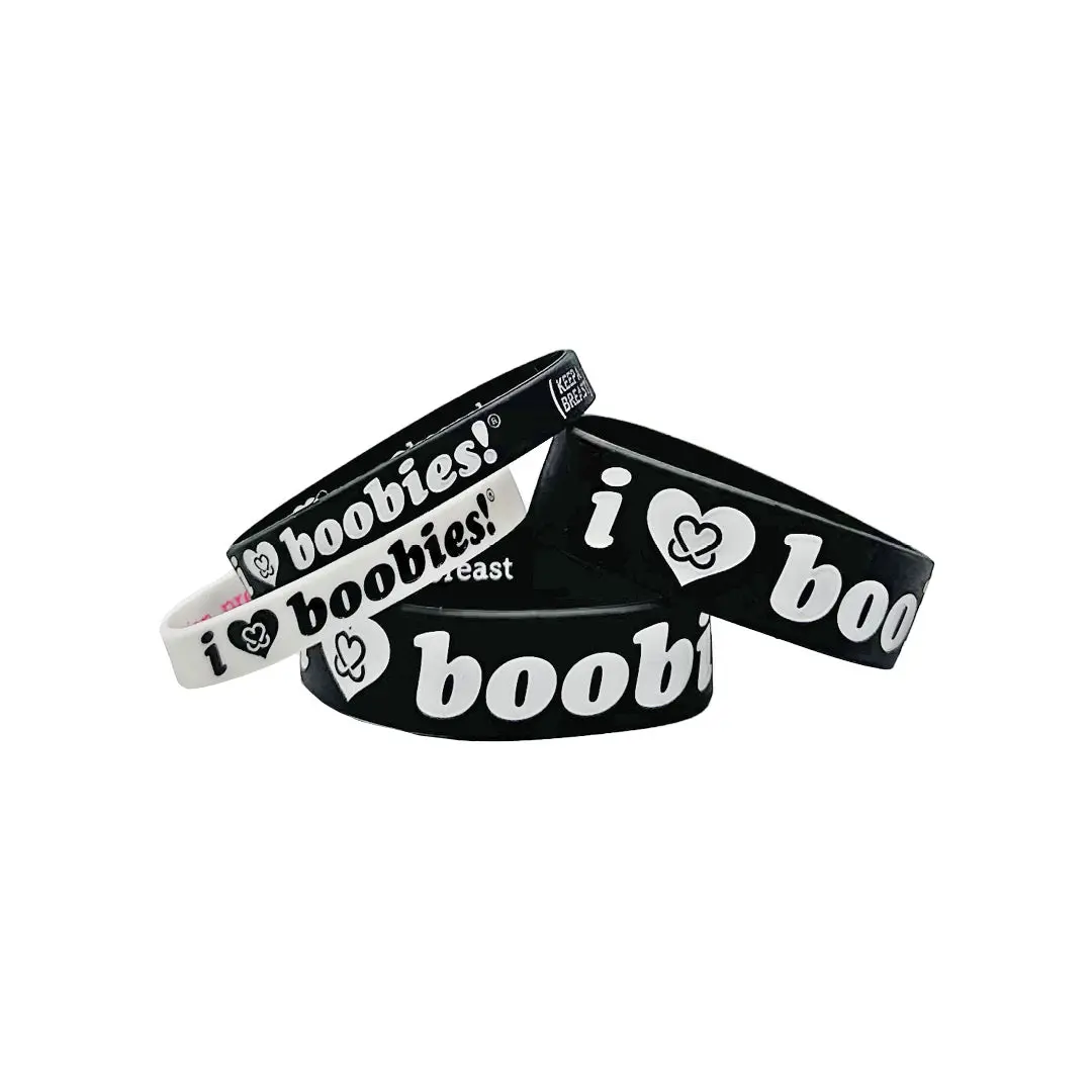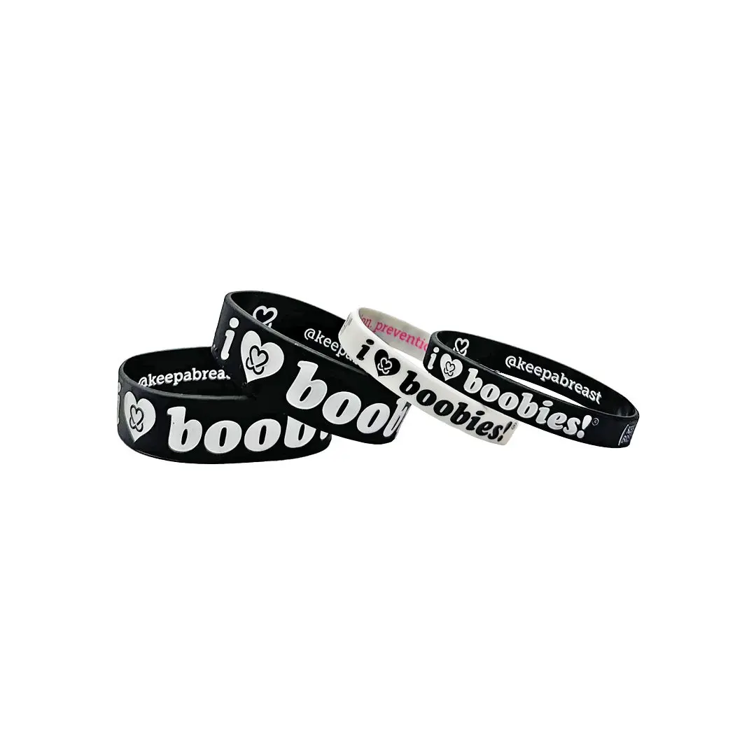 The classic i love boobies! bracelet colorway, in two different styles: two classic and two minis! Grab the bundle to share with your friends and fam and advocate for breast cancer early detection.