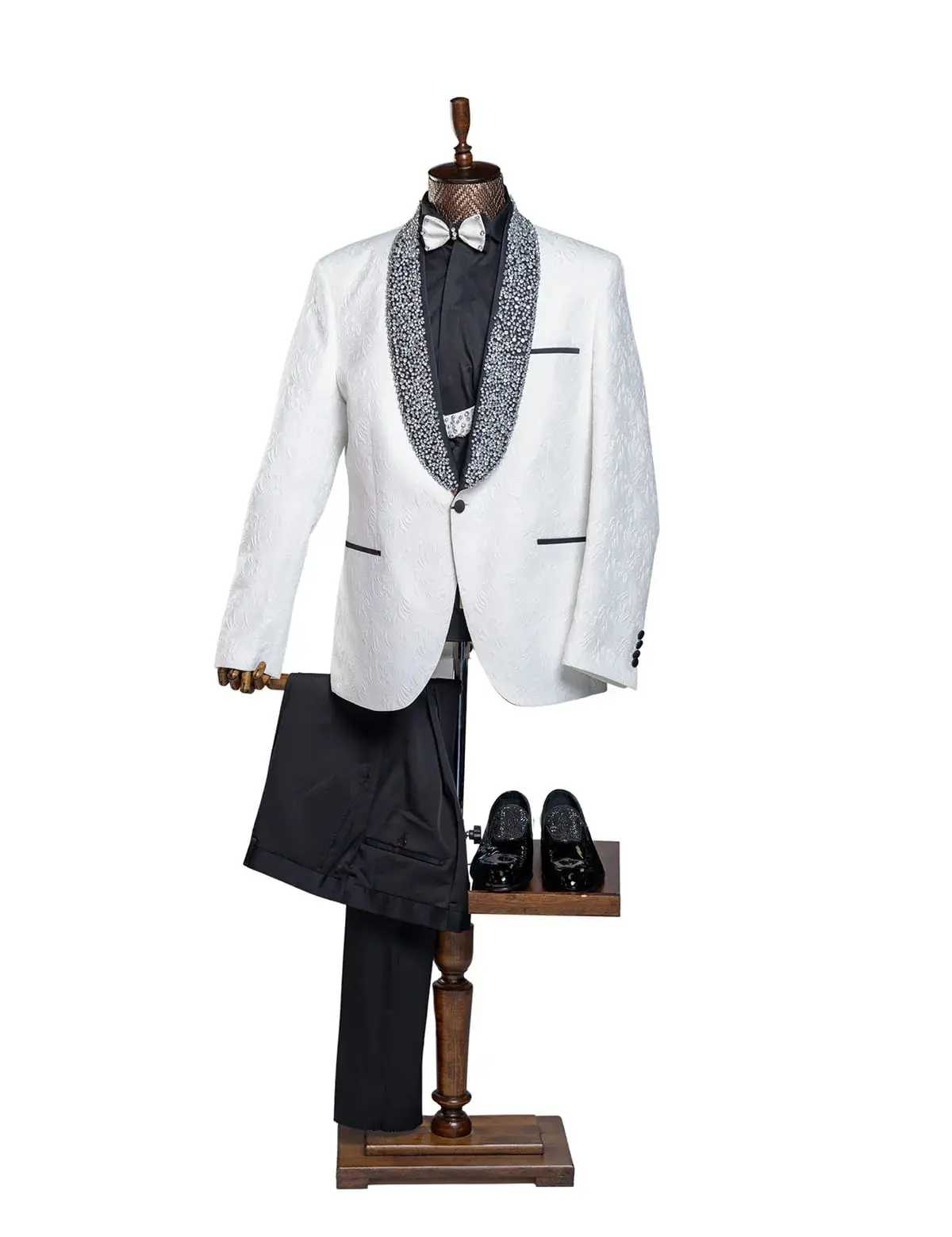 Package includes double back splits, one button and single breasted blazer, single breasted vest, bow tie and Pant!