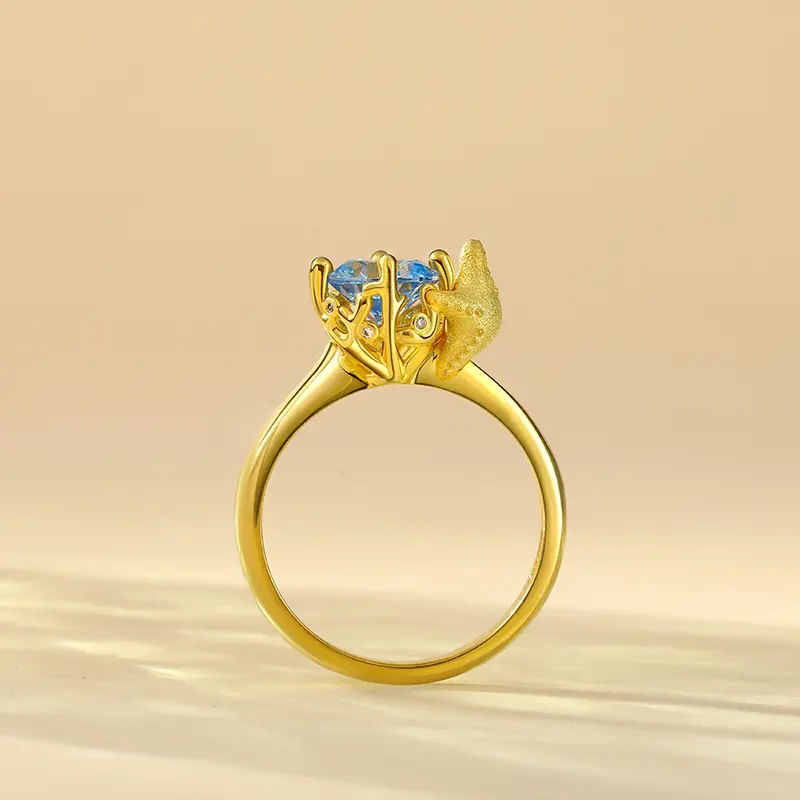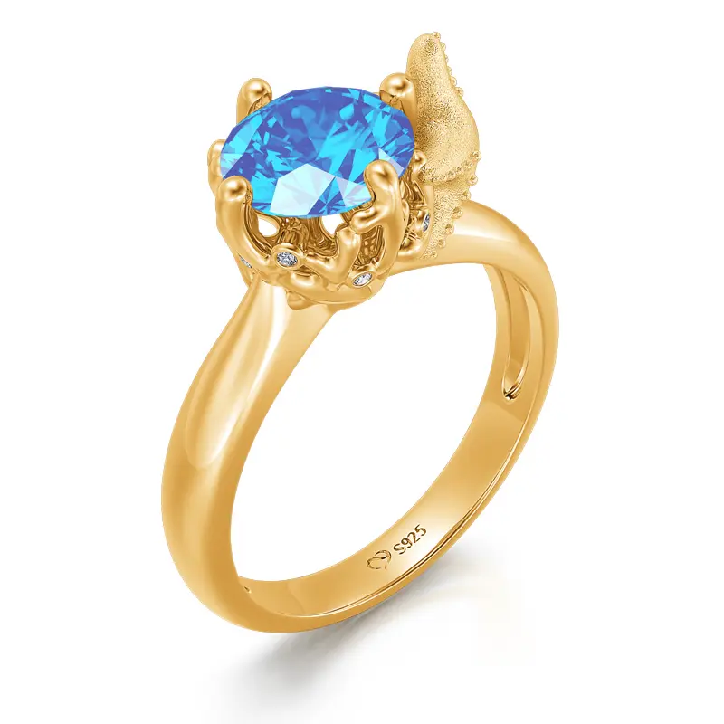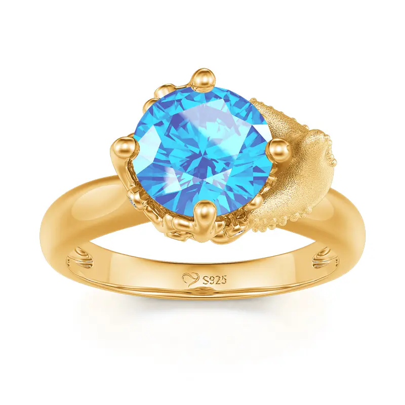 Crafted in sterling silver, this ring features a round-cut blue stone surrounded by corals and hugged by a starfish. While the starfish is an eternal symbol of renewal and regeneration, aquamarine stone evokes a peaceful oceanic feel. If you love marine life and want to hug the sea like the starfish, wear this cute ring on your finger. Jeulia pays tribute to mother nature and devotes to marine protection. Find out more in our Hug Me collection and Marine Collection.