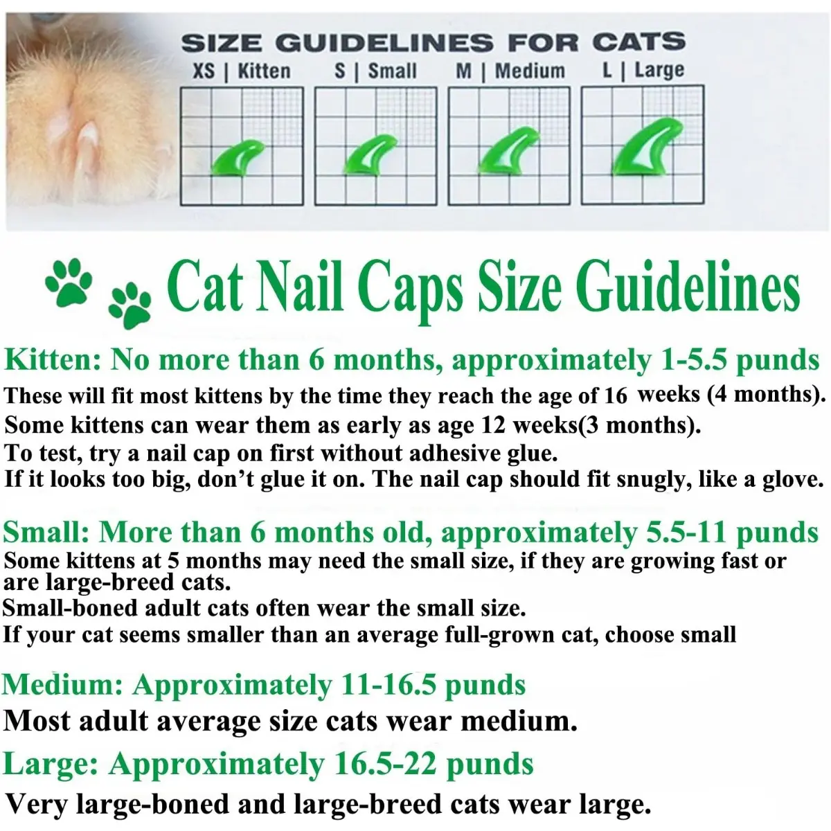 We suggest that you have one to assist you when applying. 1.Test size fit or not: Try on the nail cap without glue to ensure a proper snug fit. 2. Make sure fur around the paw are separated from the paw. 3.Trim cat nails and leave sufficient claw surface for the glue to adhere properly.(Kitten don't need) 4.Fill each nail cap a little glue(only cover the nail part), wait the glue half dried, then slide the cap on. (Please be careful and avoid dropping glue on your hands or your cat's fur, if you do, remove it with using nail varnish remover. ) 5. Wait until the glue total dried and begin the next one.