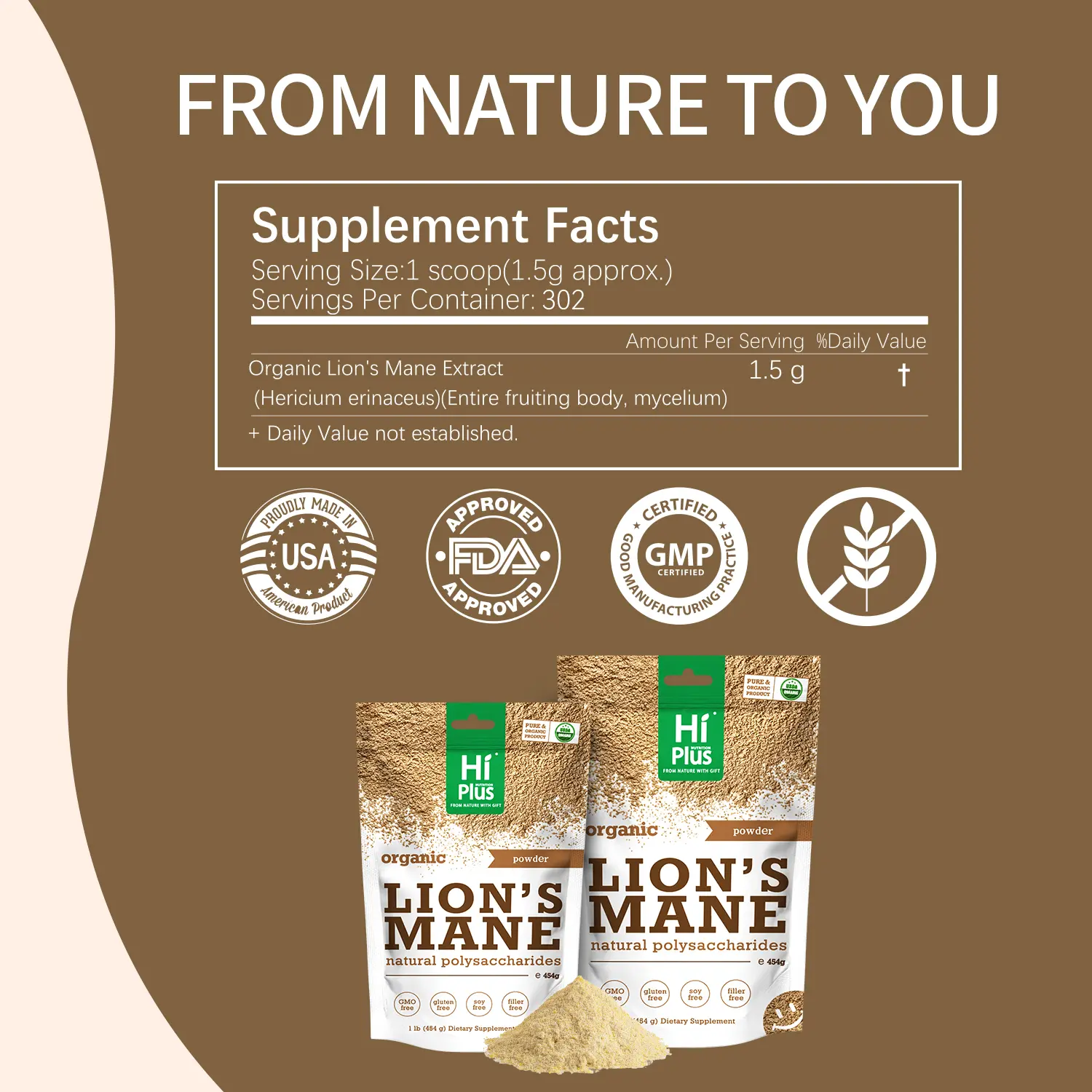 ·100% Organic and Natural Ingredients: Made with 100% organic and natural ingredients, HiPlus Lion‘s Mane Powder ensures a more natural and less processed product, aligning with your commitment to health and wellness.