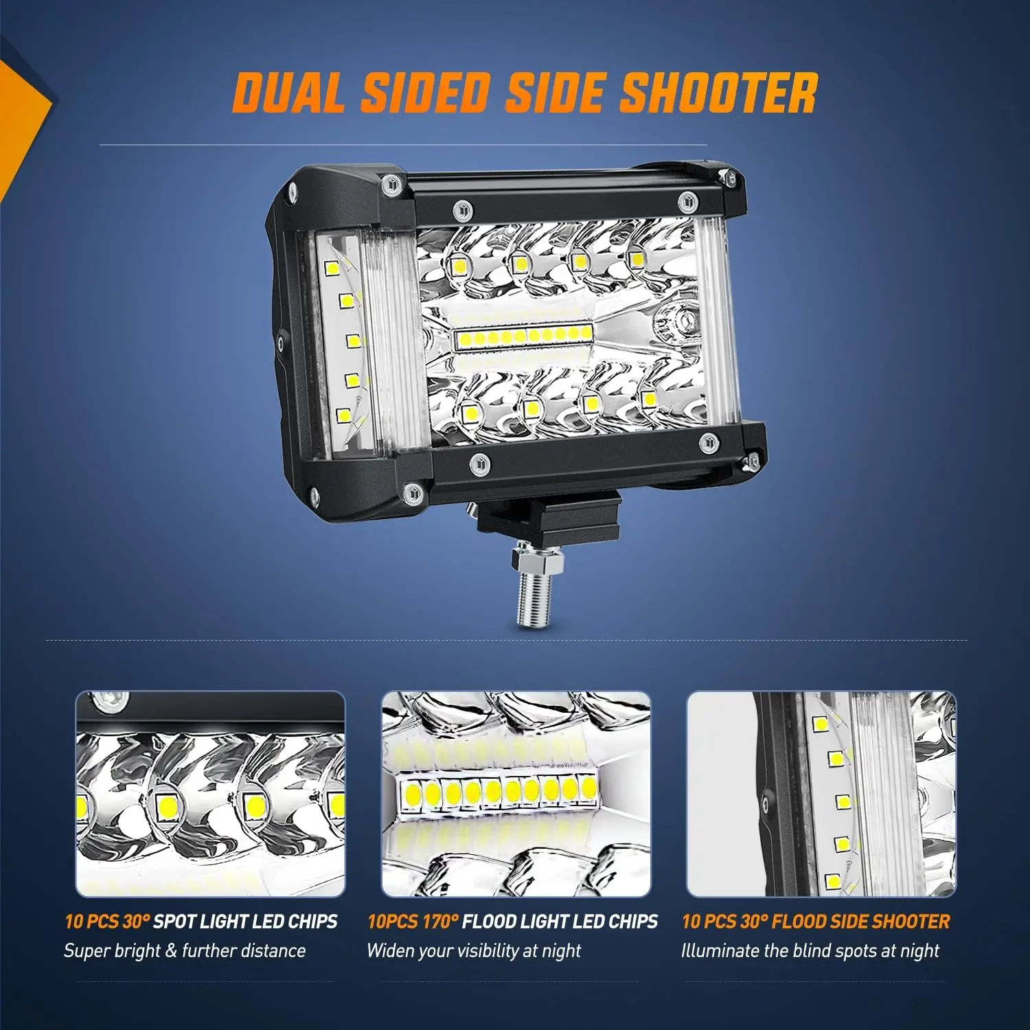 Designed with side lights at two ends, 170° flood beam and 30° spot beam, shoots out a 200° wider and further light coverage to clear darkness.