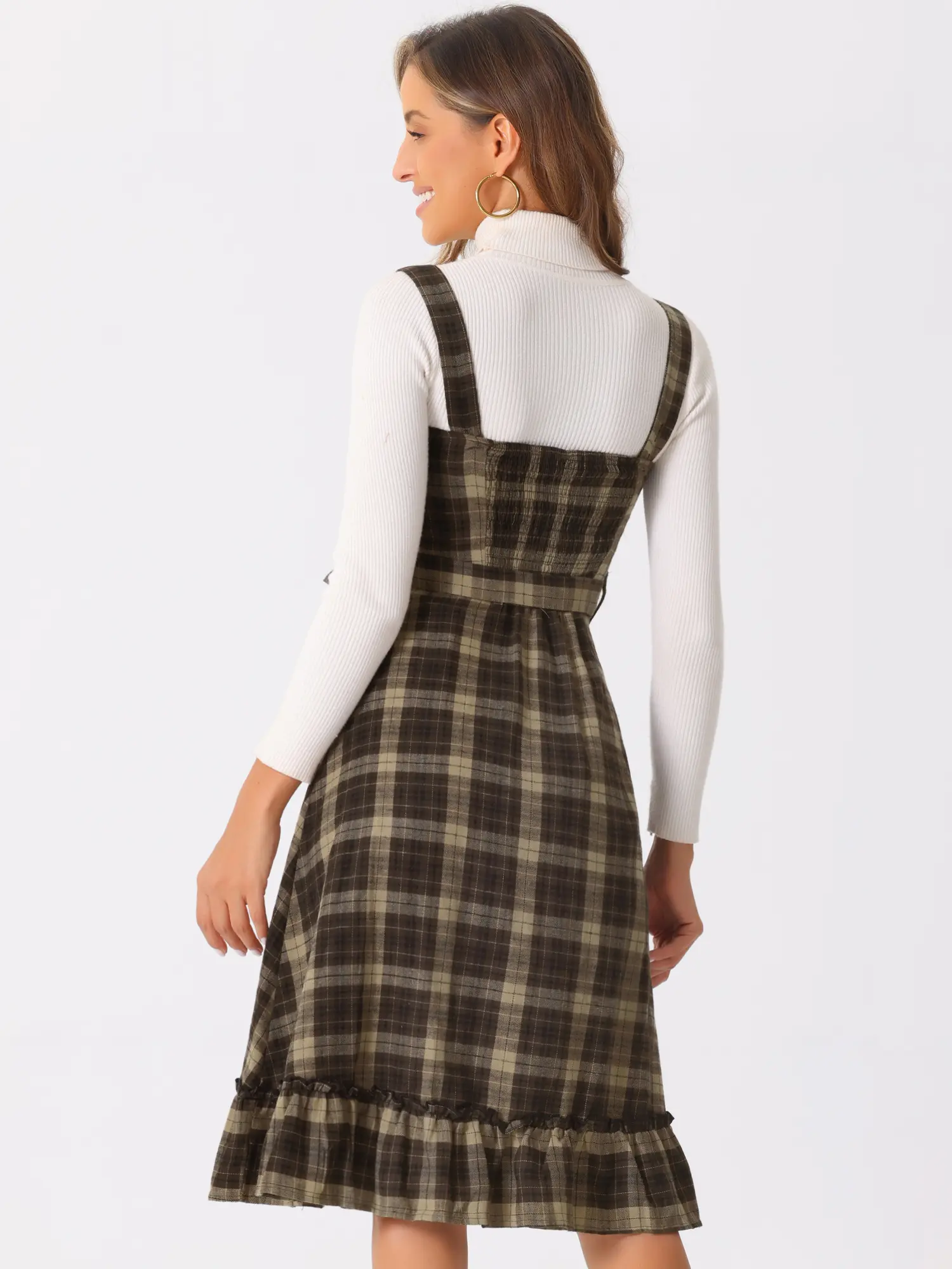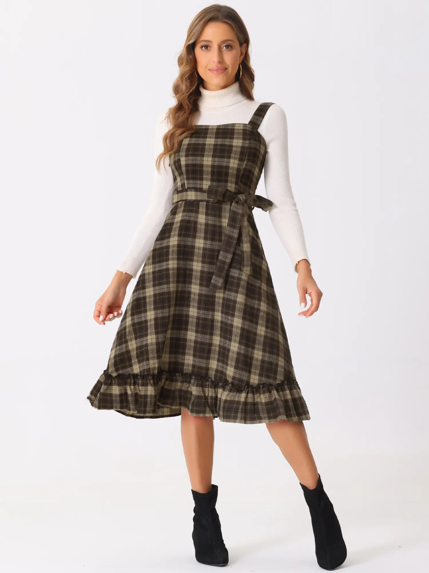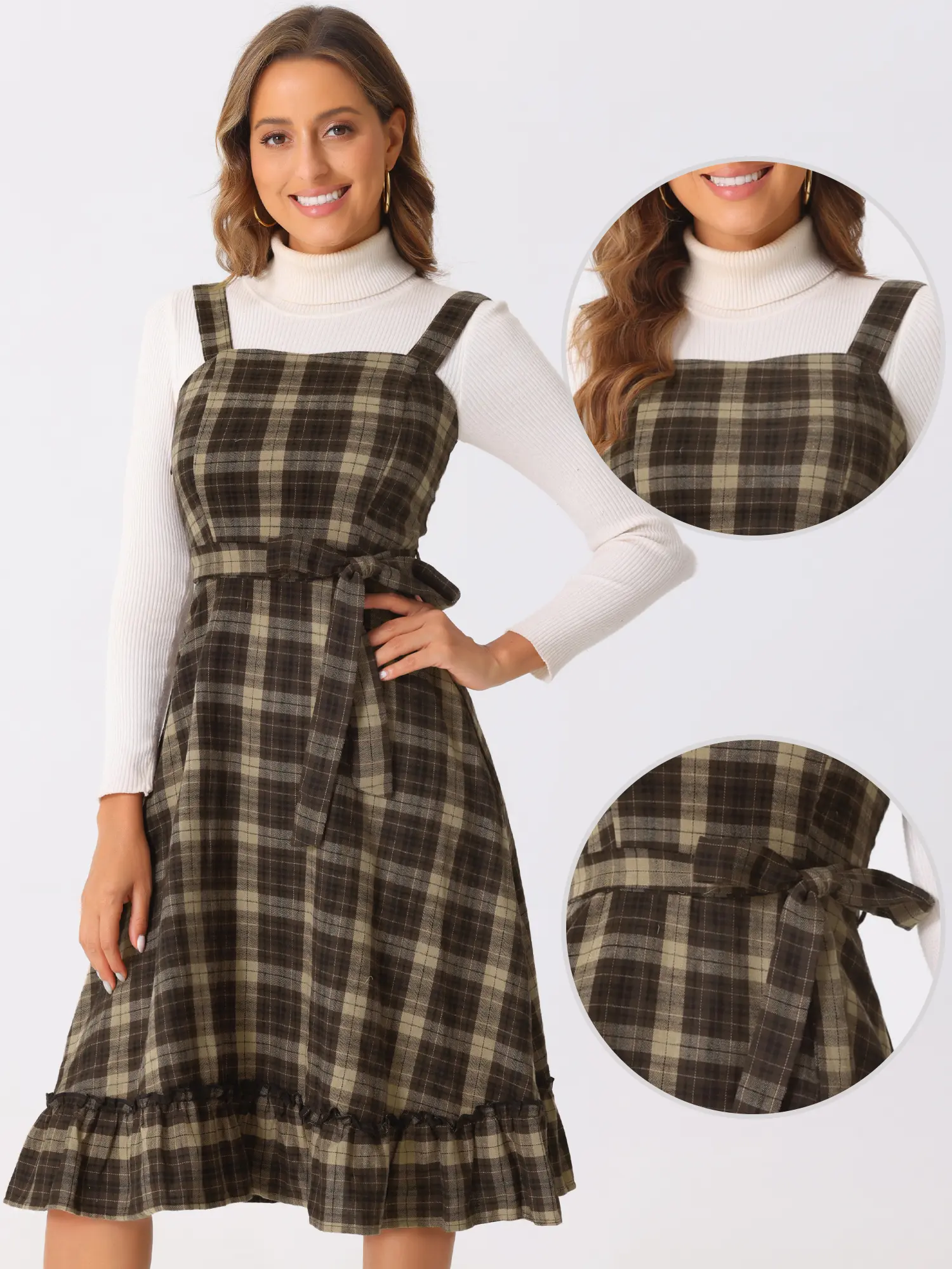 INSPIRE CHIC Plaid Dress for Women Ruffled Sleeveless Vintage Tie Waist A-Line Pinafore Overall Dresses
