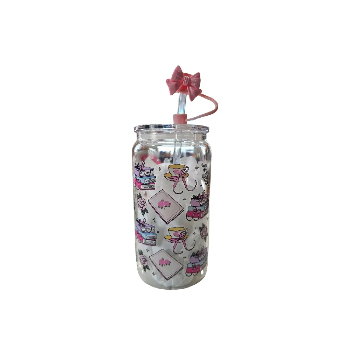 1 16oz glass cup with straw and straw topper