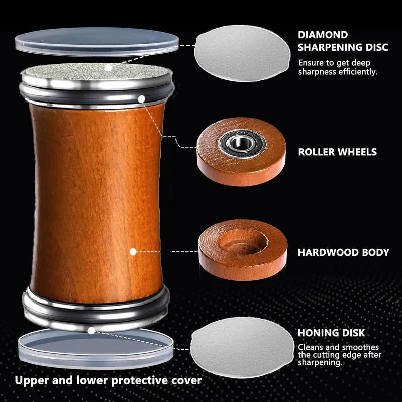 Precision and Sustained Sharpness: knife sharpener is favored for its ease of use, consistency, and long-lasting sharpness, offering a convenient solution for home knife sharpening. This knife sharpener set comes with a wood roller, a wood base, a user manual, with 4 pieces of diamond and ceramic disc.