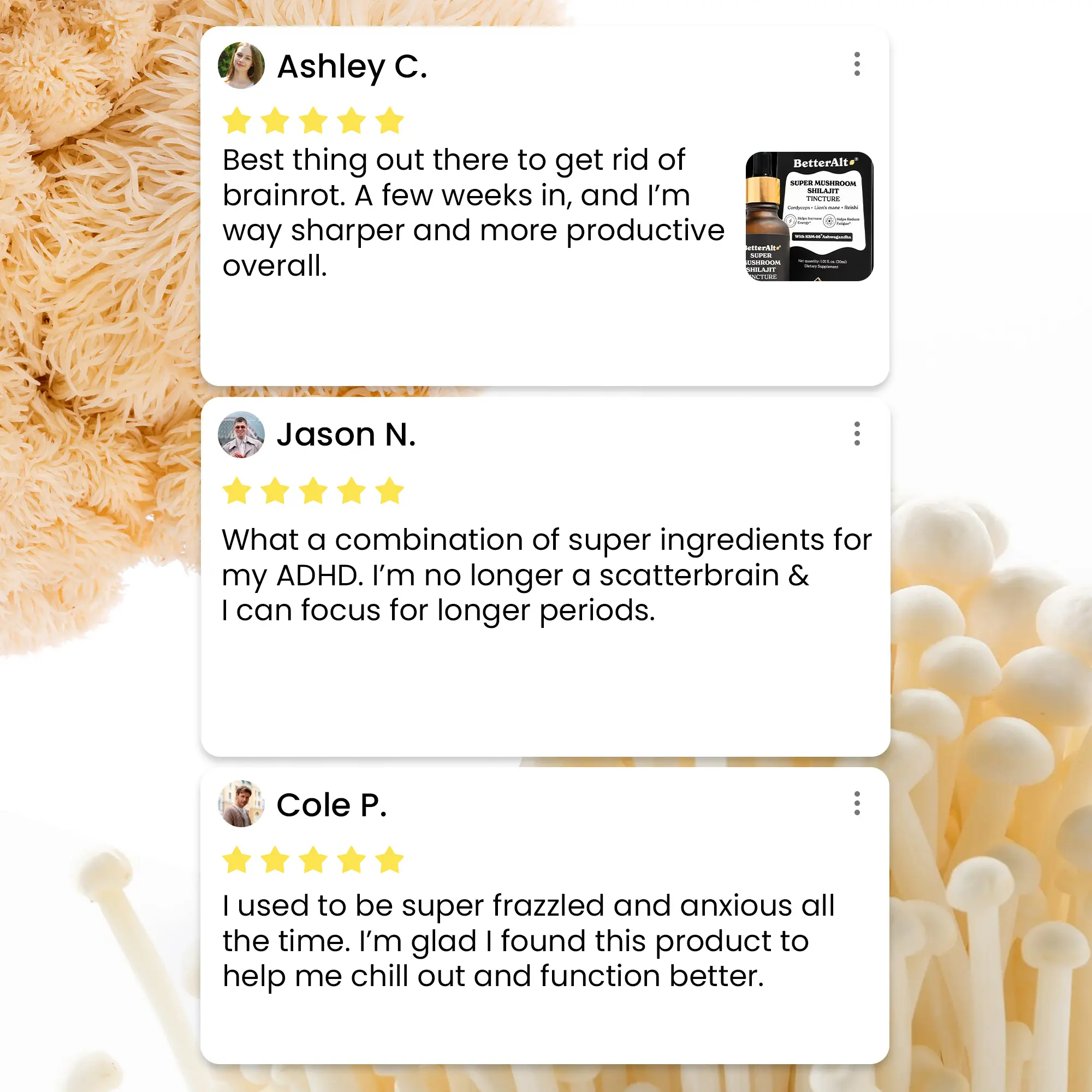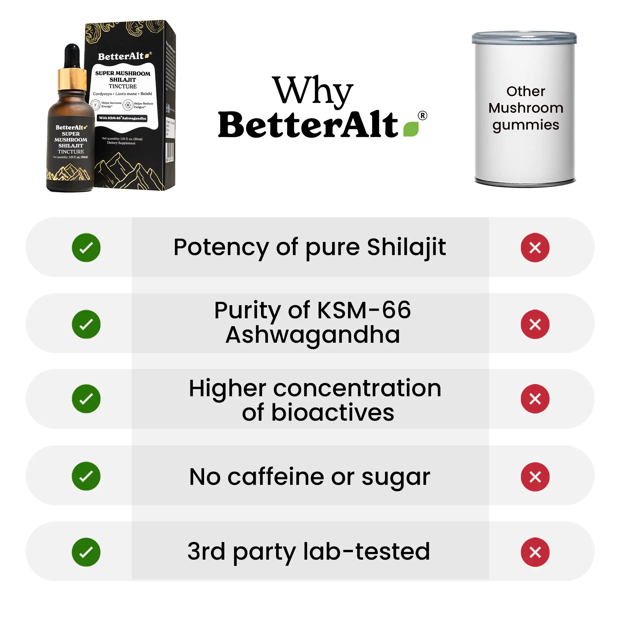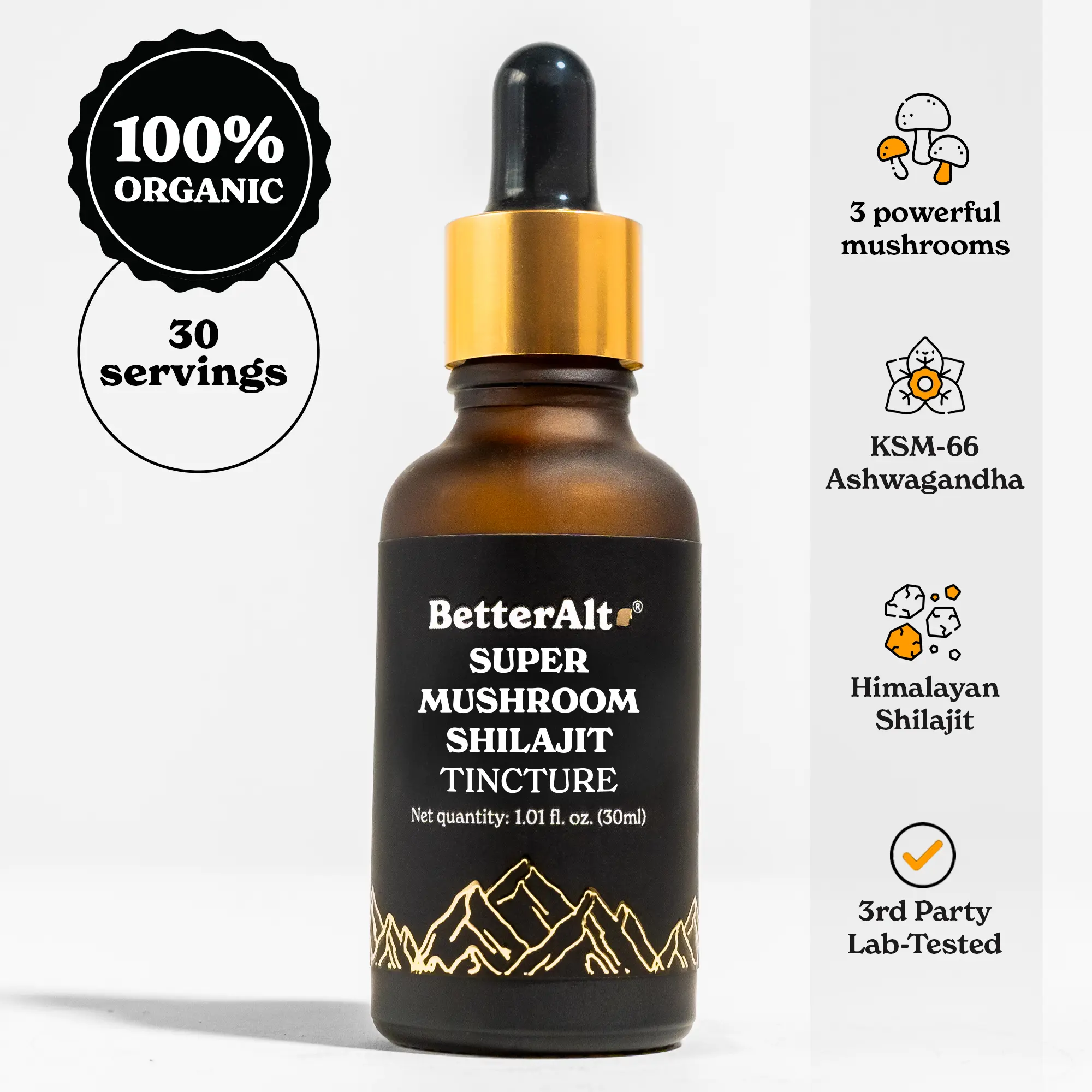 ·BetterAlt’s GOLD+ Mushroom, Shilajit & Ashwagandha Drops are a powerful blend of Himalayan Shilajit, KSM-66 Ashwagandha, and functional mushrooms, designed to help support energy, focus, and endurance.*