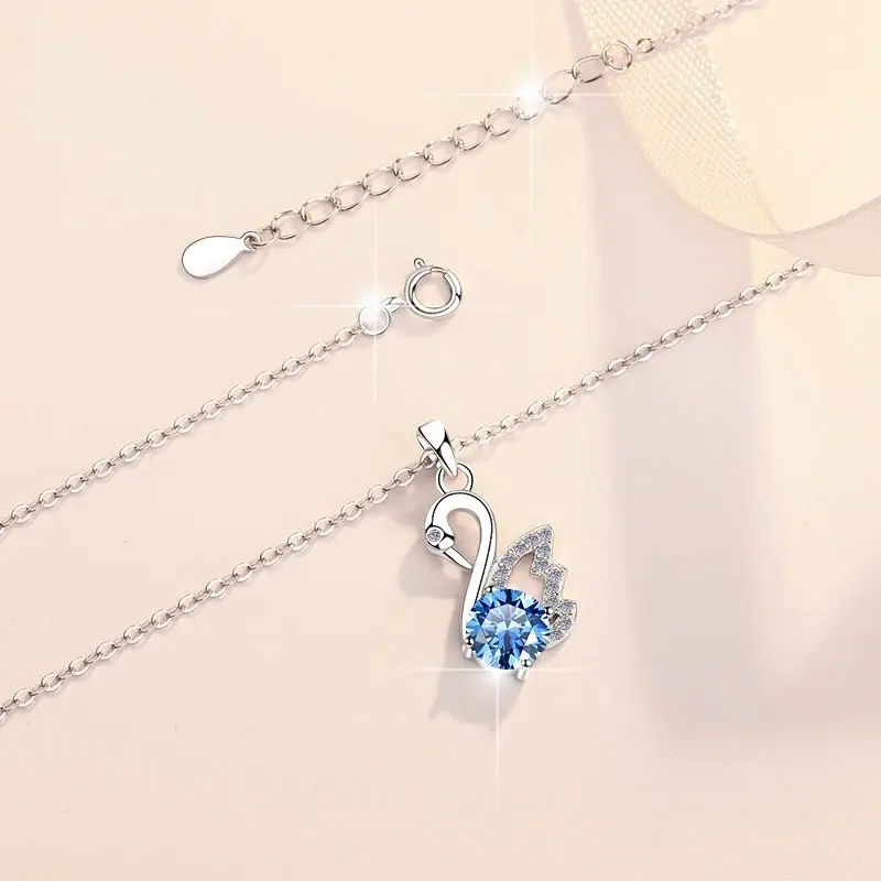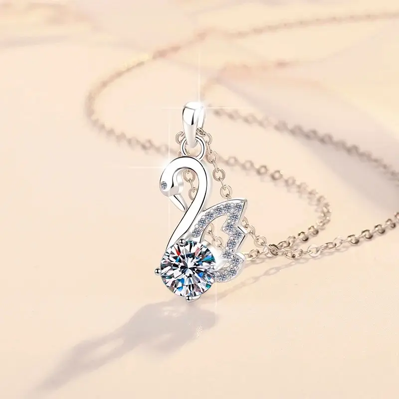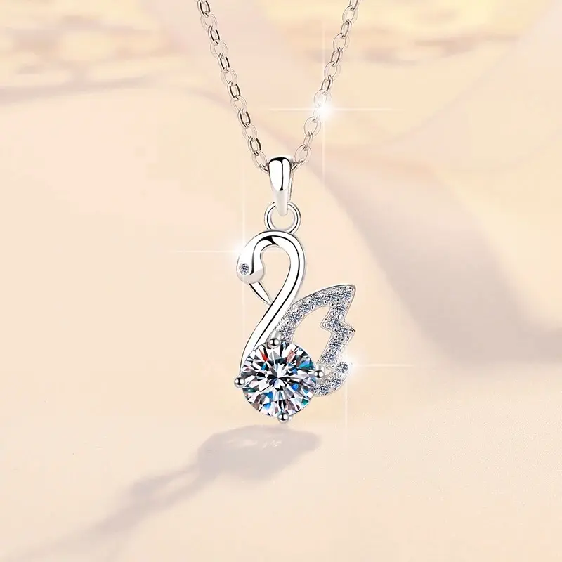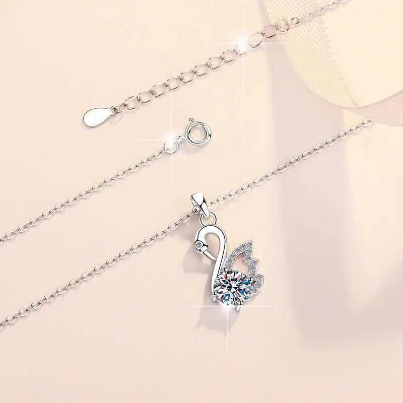 This exquisite 1.0 Ct Moissanite Diamond Swan Pendant is perfect for both men and women. With a GRA certified 1CT Moissanite as the main stone and a princess cut, this pendant exudes elegance. Made with S925 sterling silver and featuring a 45cm link chain, it also boasts gold, rhodium, and platinum plating for a luxurious touch. Eco-friendly and nickel-free, this pendant is truly a quality piece.