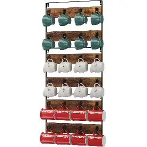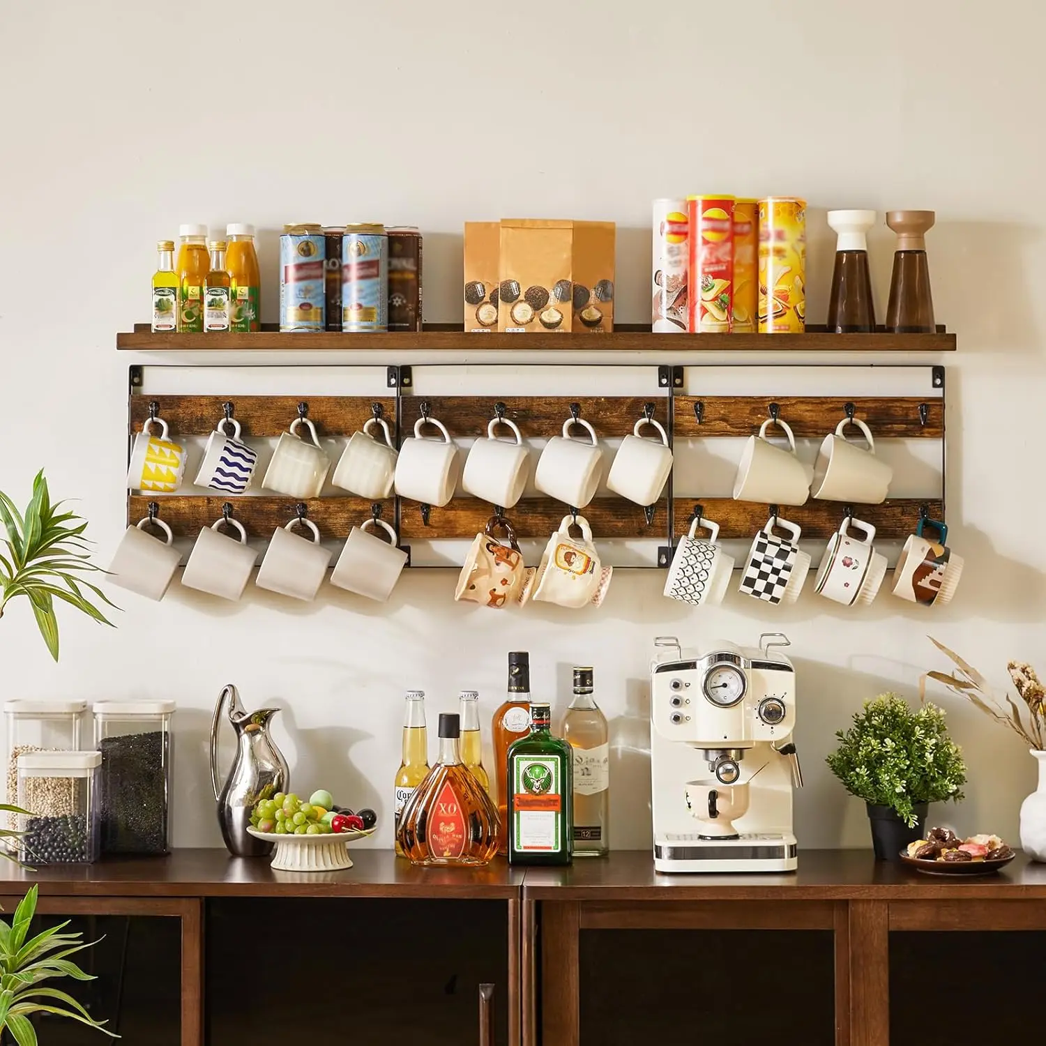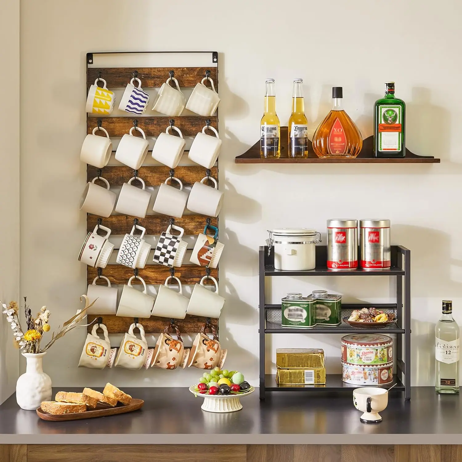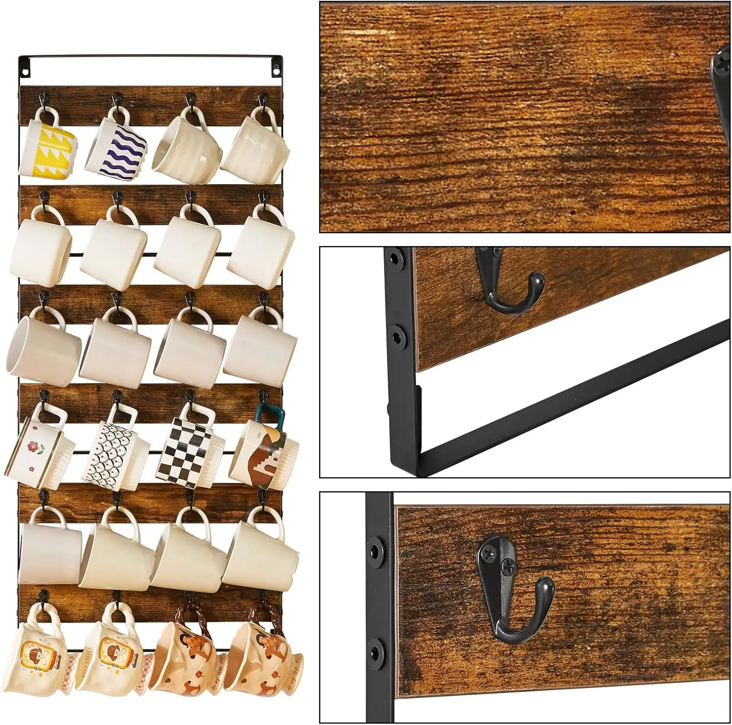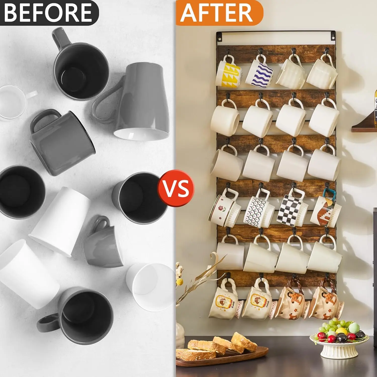 【LARGE CAPACITY】Store and display up to 24 mugs , tea cups, glasses on the rustic hooks and features with 5 total tiers,this wall mug holder not only make the most use of wall space,but also organize your coffee mugs in place for easy access,adds welcoming touch to kitchen or dining room.