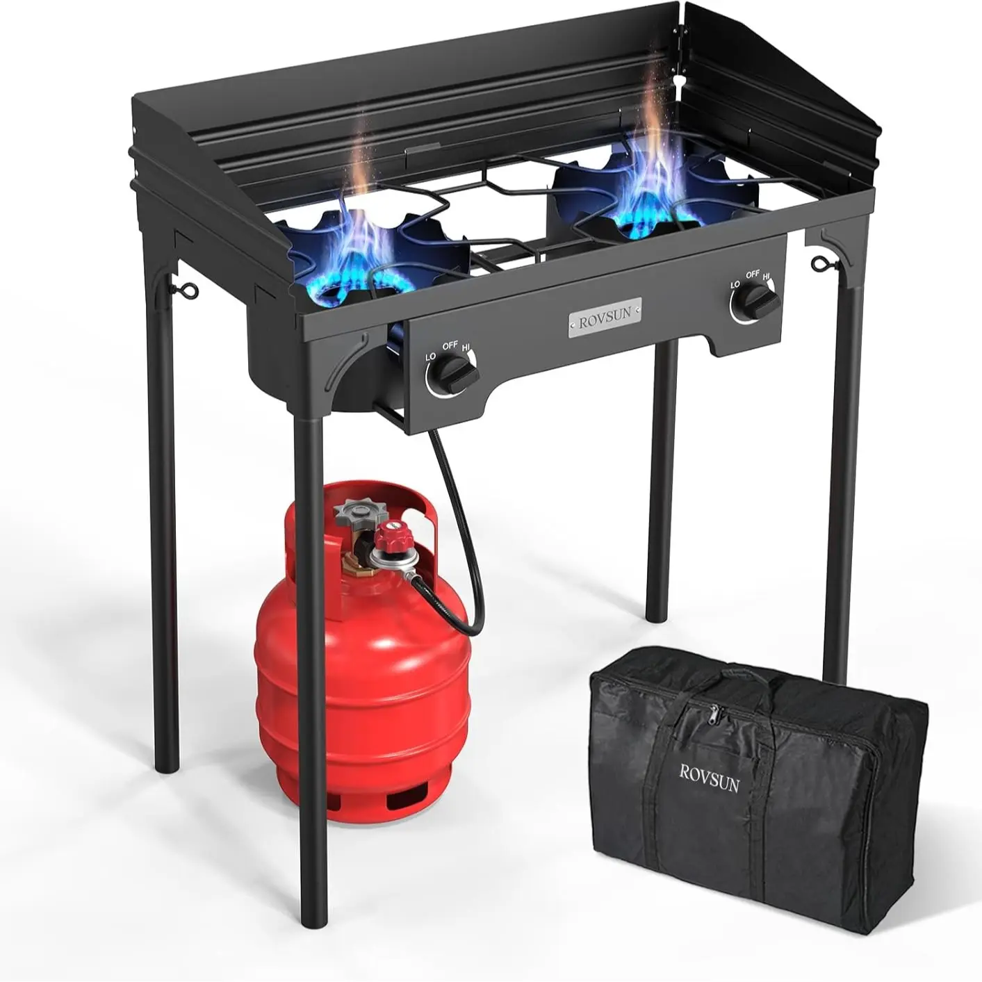 Experience the ultimate in outdoor cooking with our powerful double burner gas stove, designed for versatility and convenience. This stove is equipped with a cast iron head, outputting a whopping 150,000 BTU of cooking power, making it perfect for a variety of cooking tasks.