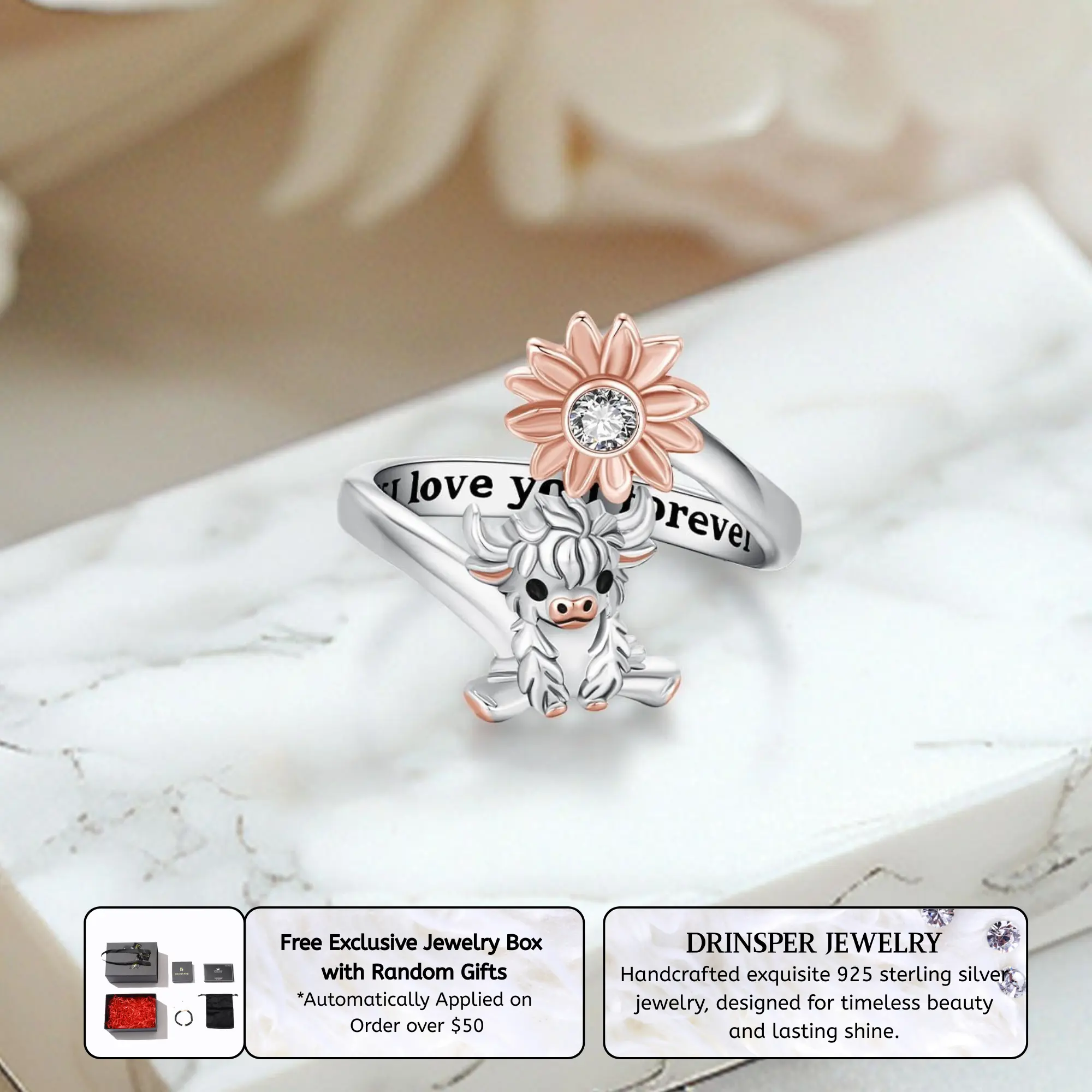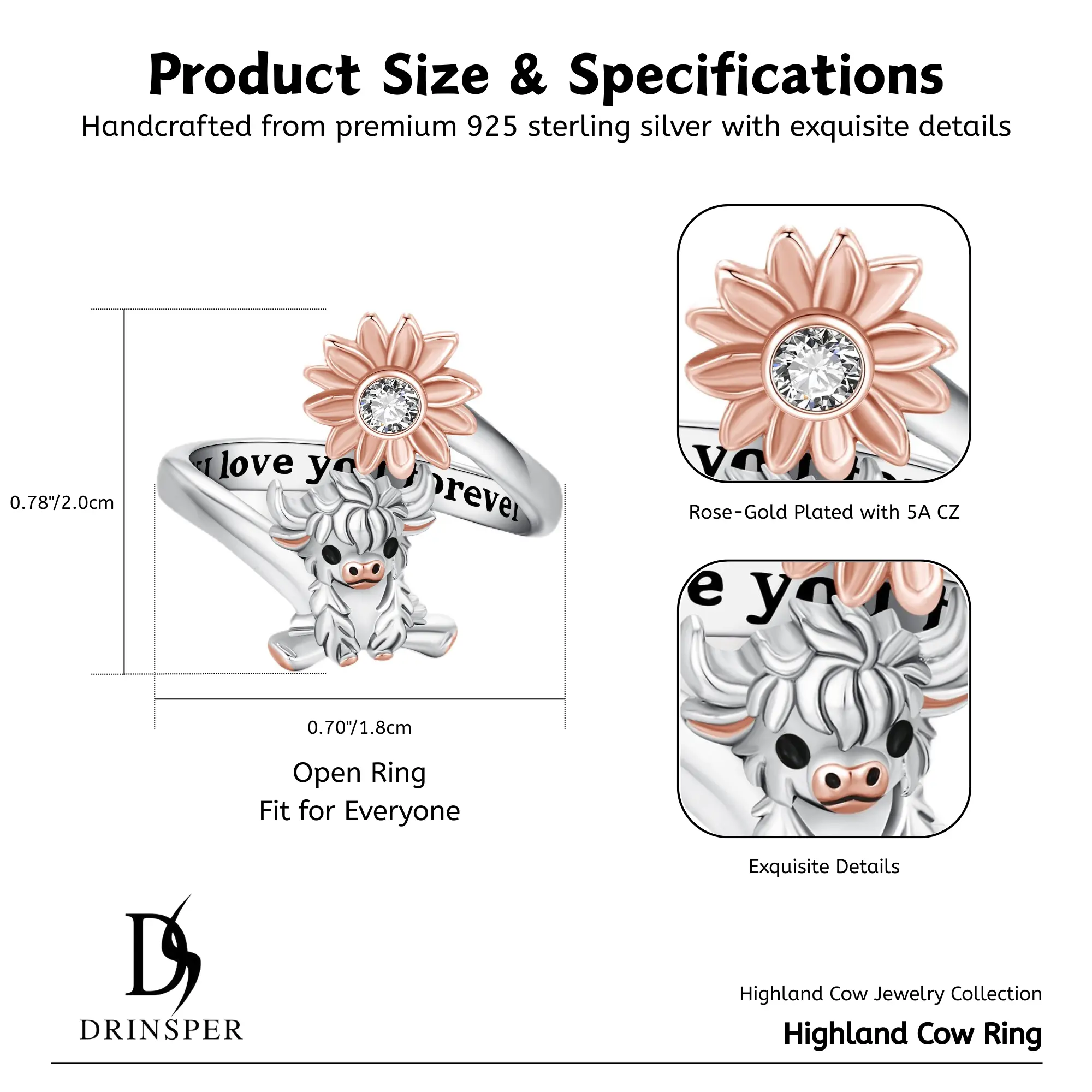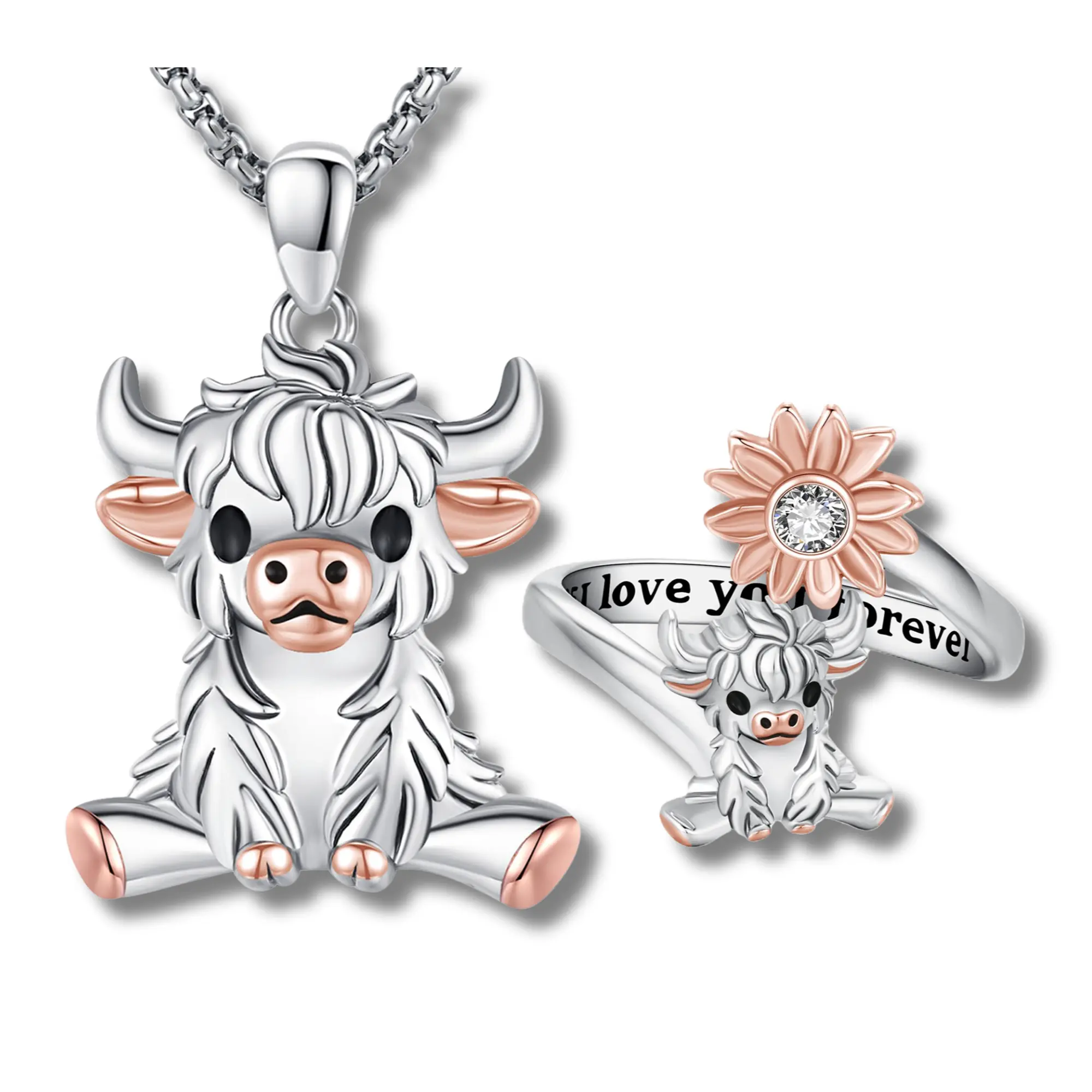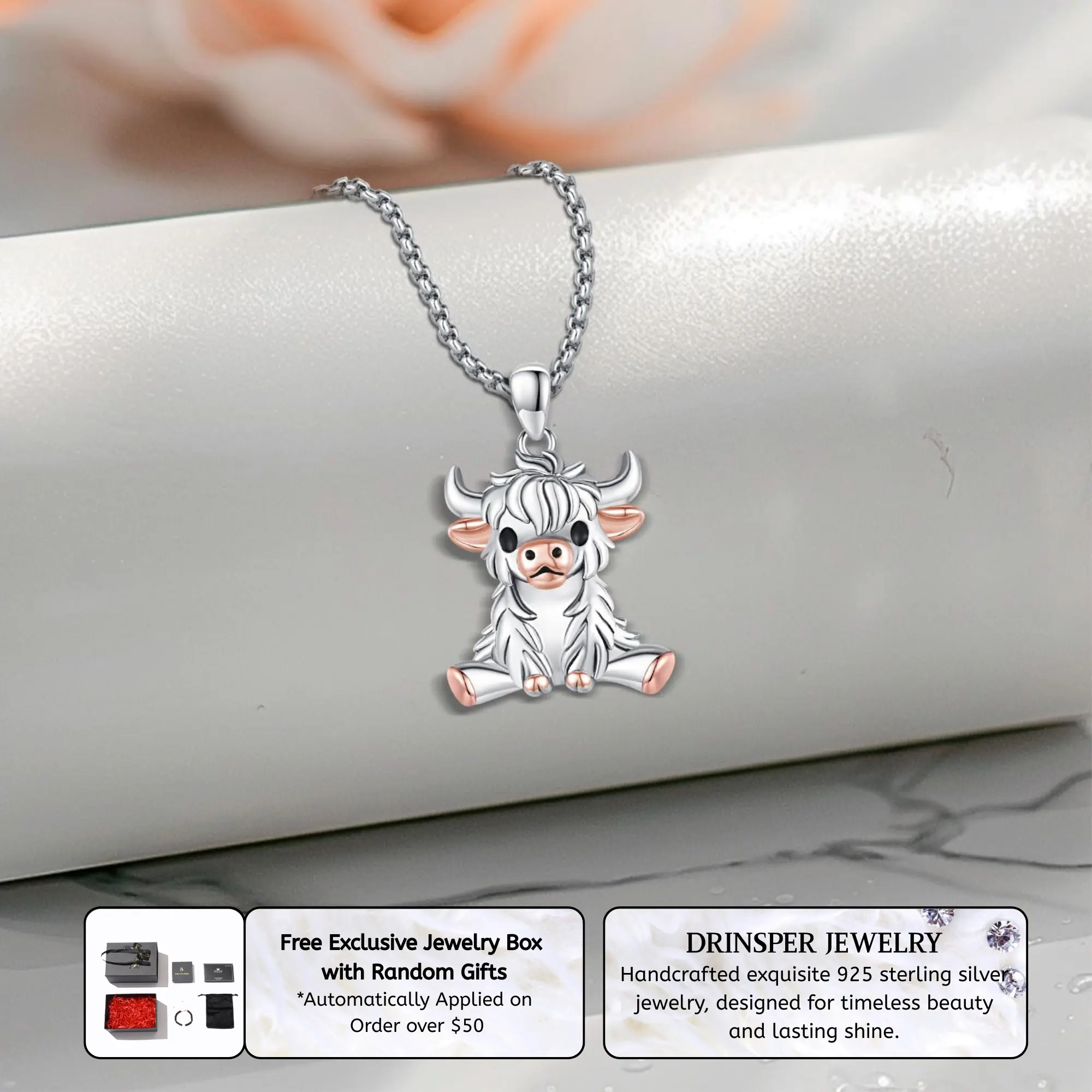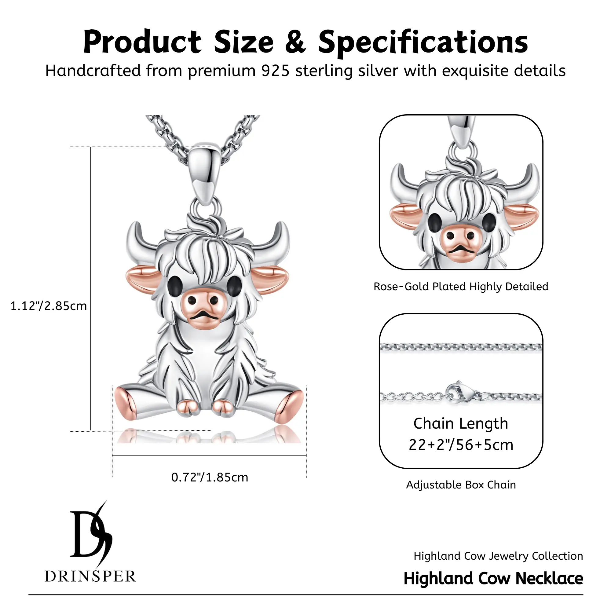 DRINSPER Highland Cow Jewelry 925 Sterling Silver Pendant Necklace & Ring Cute Highland Cow Open Ring Highland Cow Jewelry