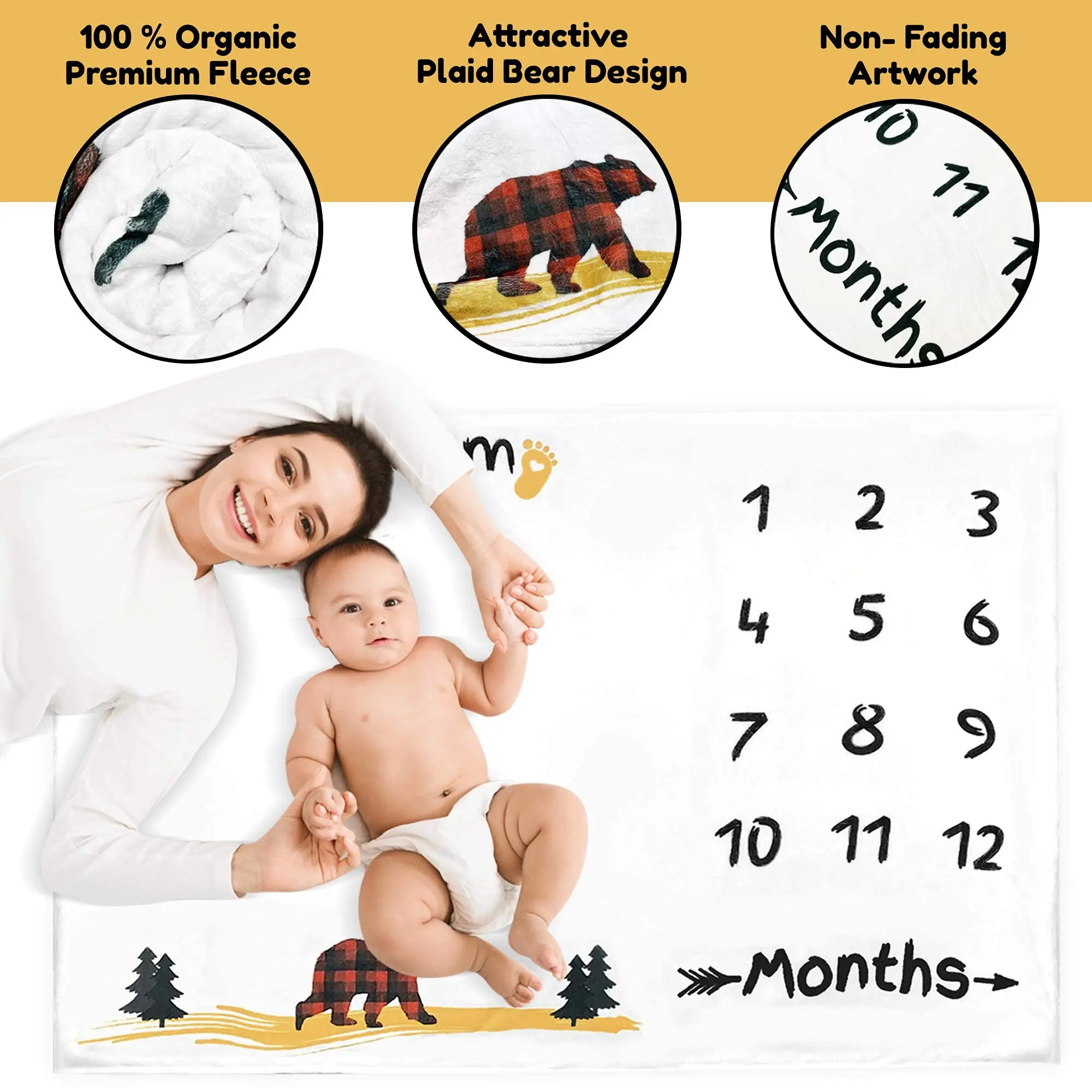 Plaid Bear Baby Milestone Blanket - Rustic Adventure Monthly Milestone Blanket for Boys and Girls, 100% Organic Premium Fleece