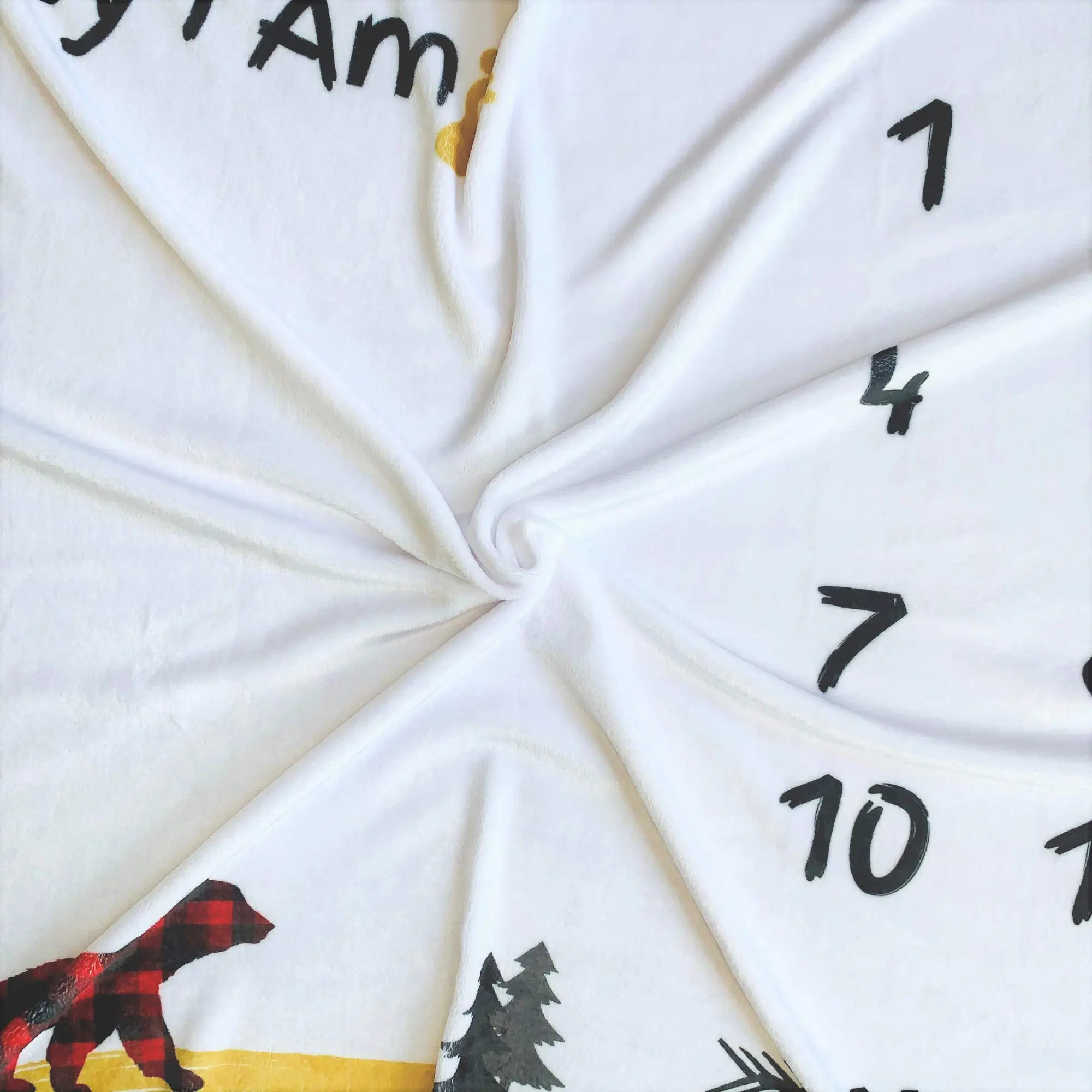Rustic Plaid Bear Design: Celebrate your baby’s milestones with this cozy adventure-themed milestone blanket, featuring a charming plaid bear, forest trees, and a rustic outdoor vibe.