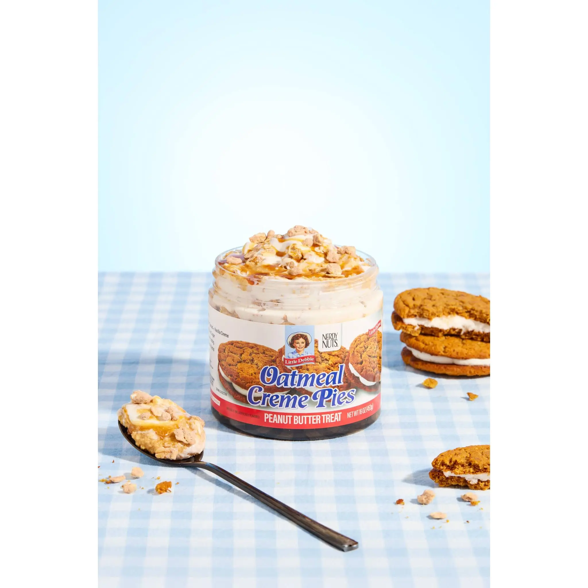 “Smunchy” sweet vanilla creme flavored peanut butter is swirled with dark brown sugar & cinnamon, layered on a light molasses flavored syrup, topped with nostalgic marshmallow frosting & brown sugar cinnamon oat clusters!