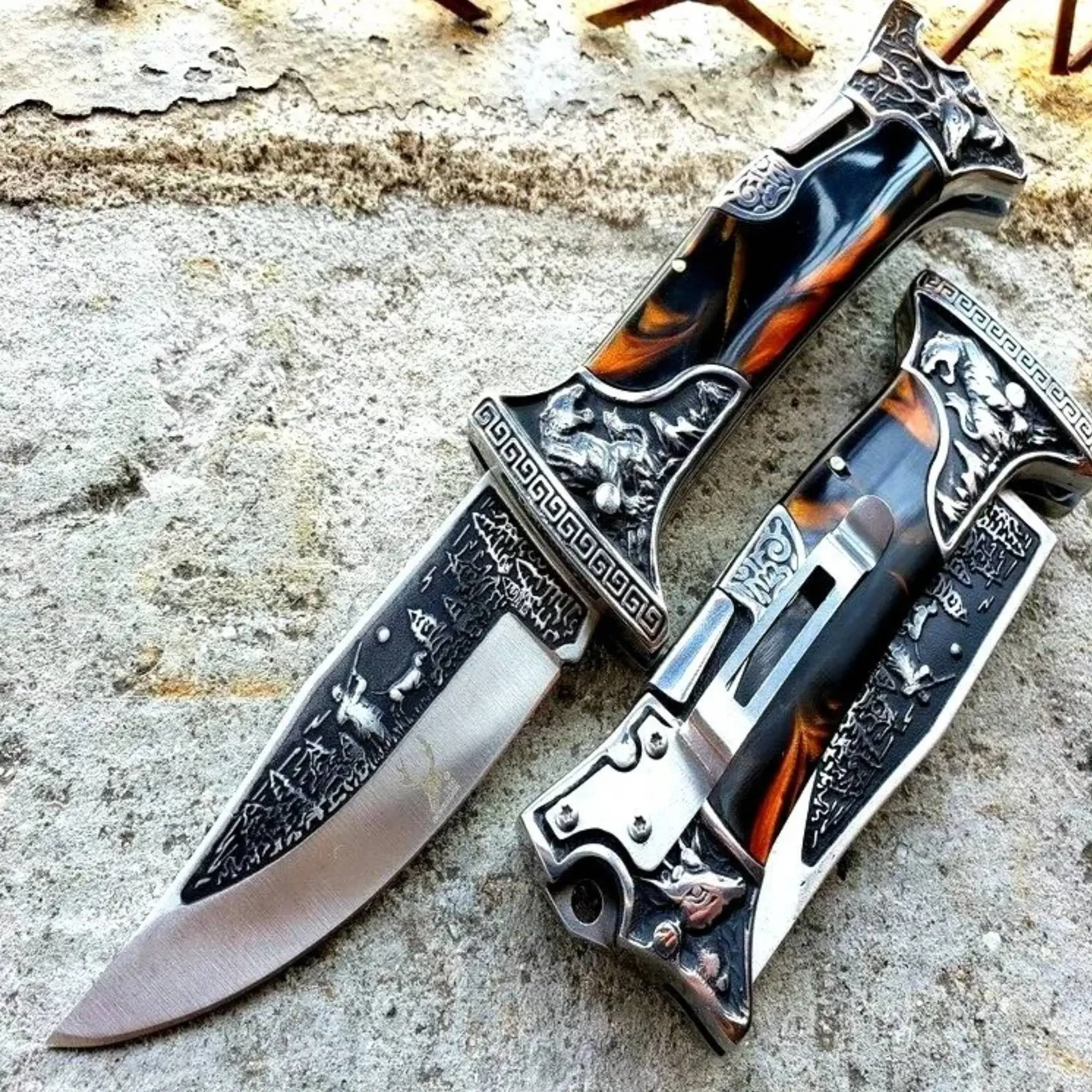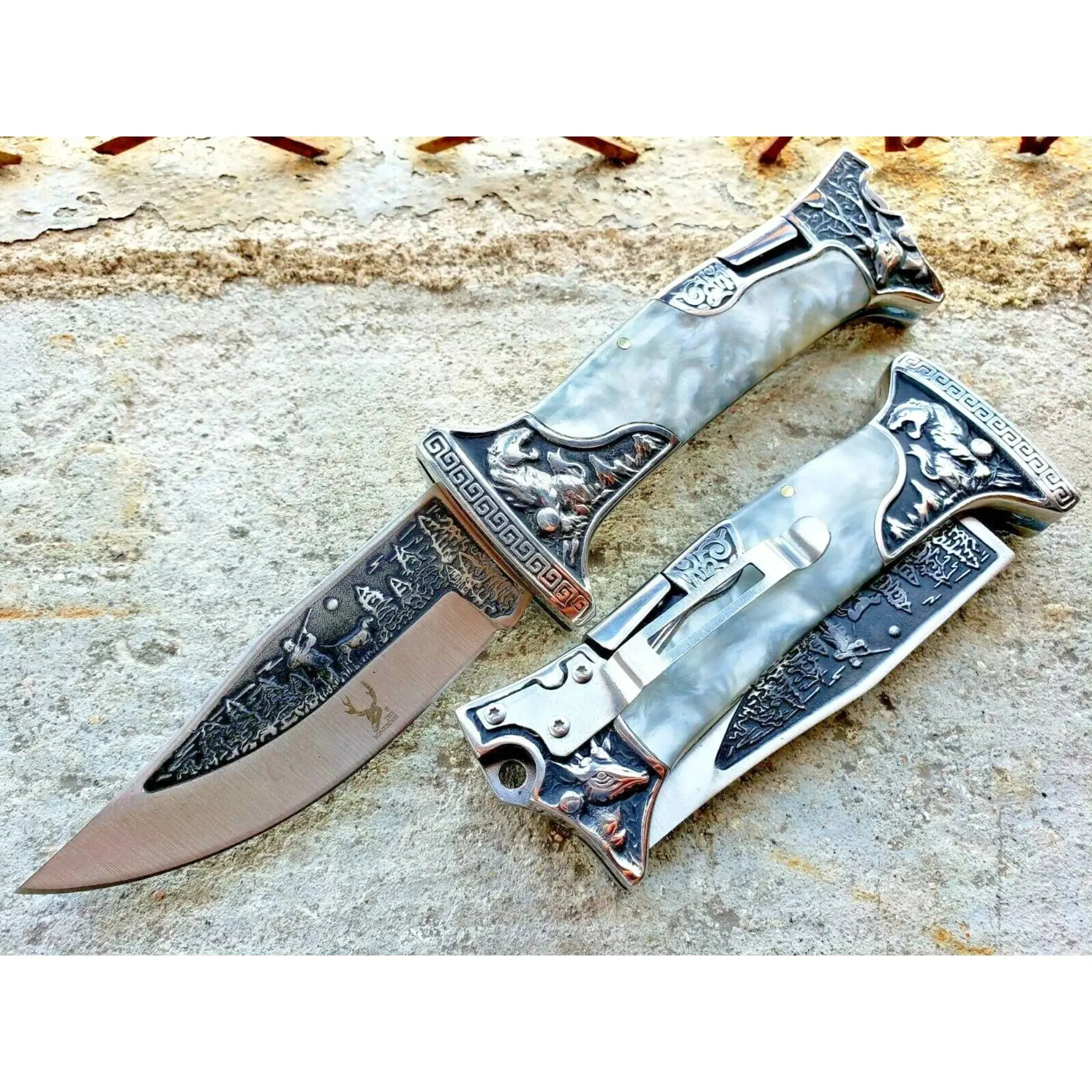 Weight: less than 1lb Crafted Using Quality 3CR13 Stainless Steel Belt Clip Folding Knife Marble Handle Engraved Design