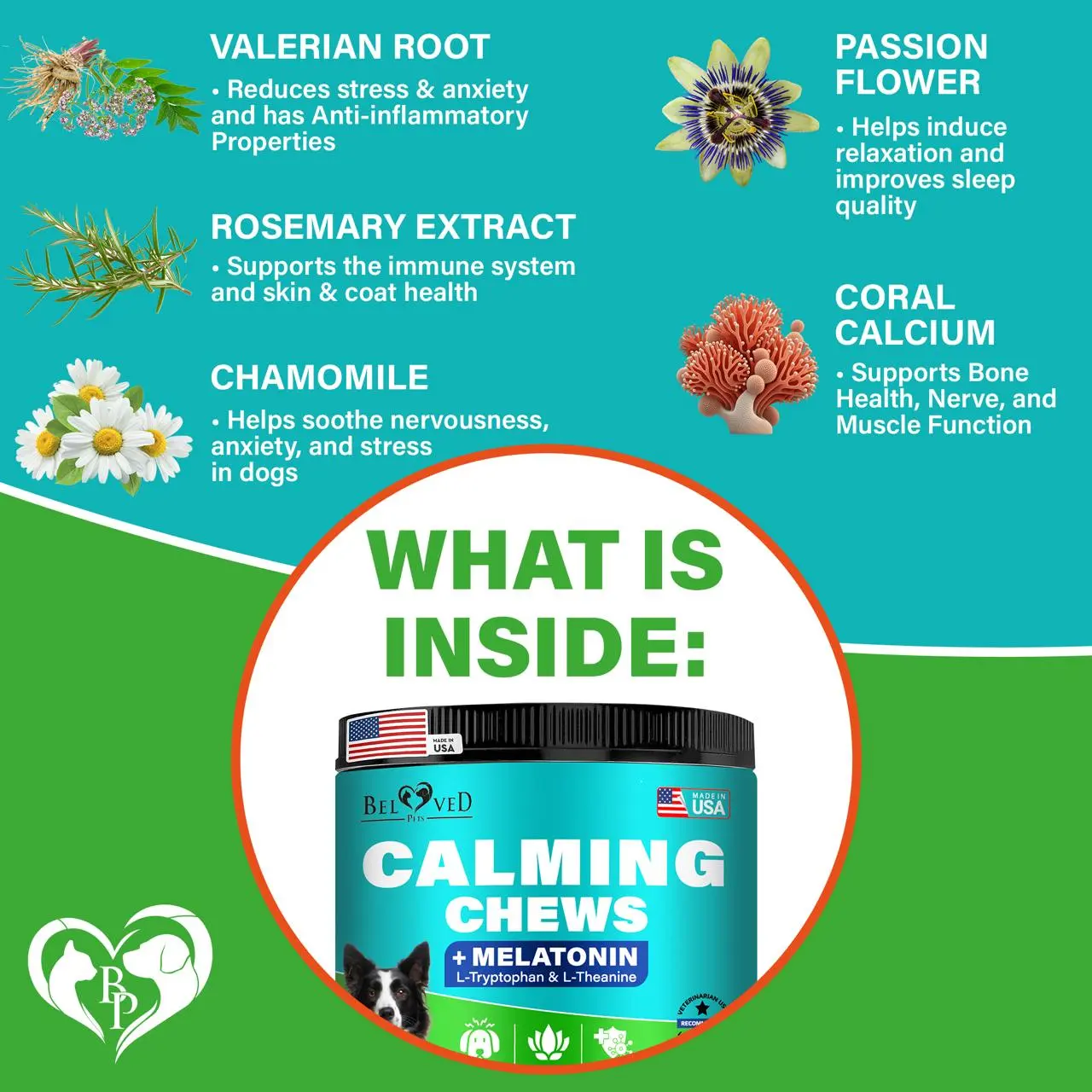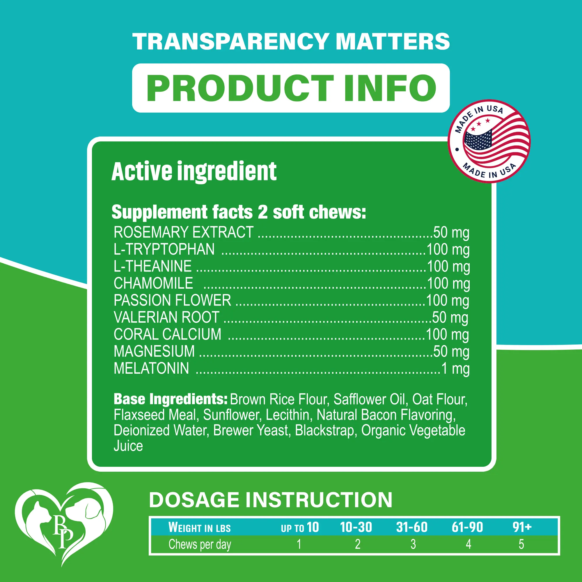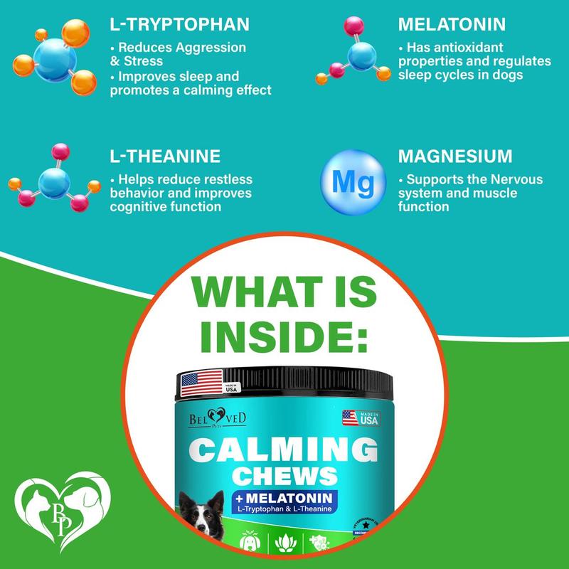 Product description: these chews are designed for pets who experience nervousness in challenging situations like travel, grooming, or loud noises. Suitable for dogs and cats of all sizes, these chews help encourage a relaxed and balanced demeanor, making them ideal for everyday use or occasional stressful moments.