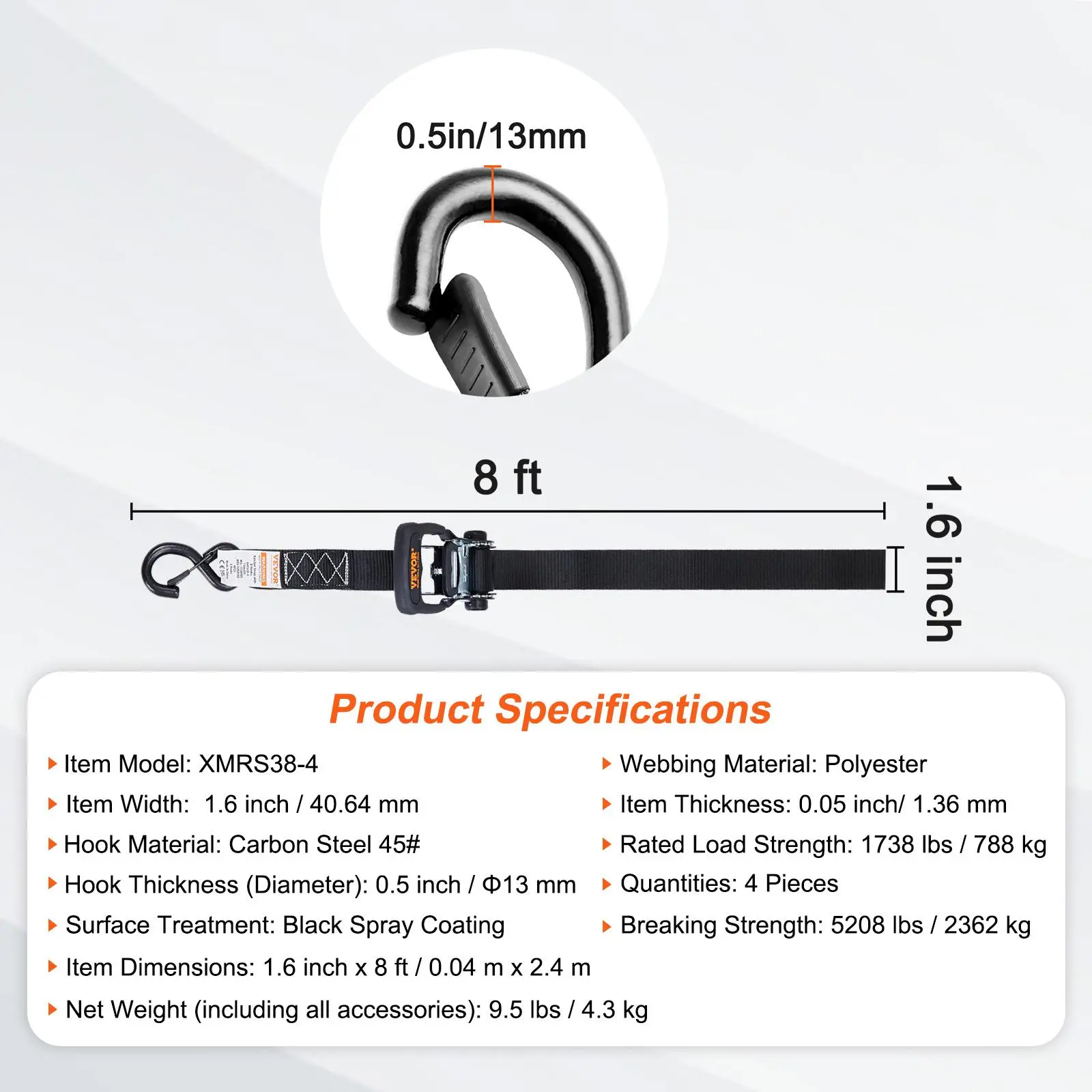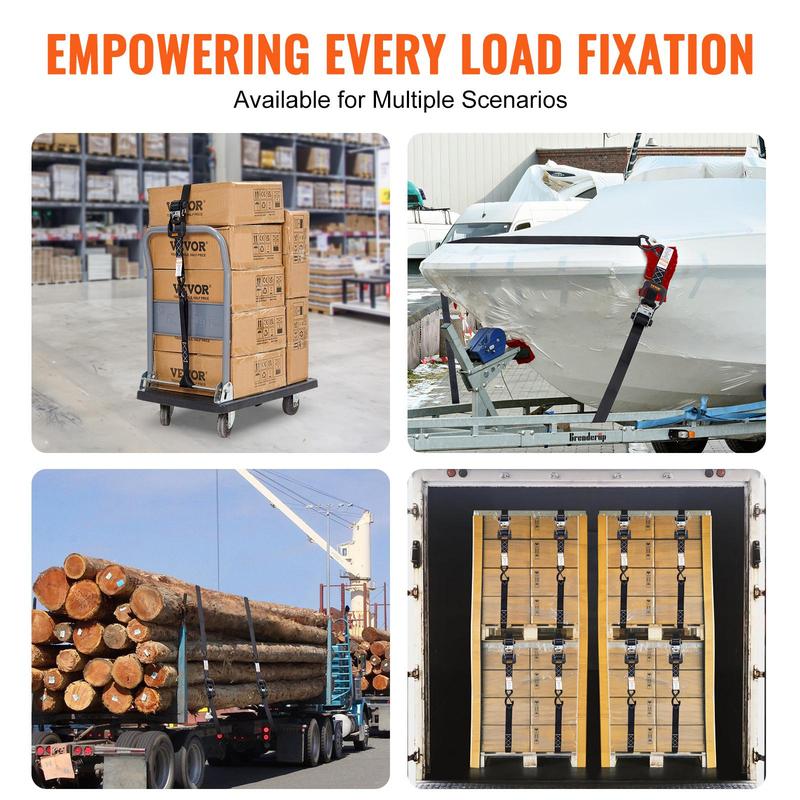 • Versatile Application: VEVOR ratchet straps provide durable and reliable security for transporting various small and large objects, including motorcycles, canoes, kayaks, ATVs, boxes, boats, furniture, lawn equipment, heavy machinery, and other cargo via truck beds, trailers, or roof racks.