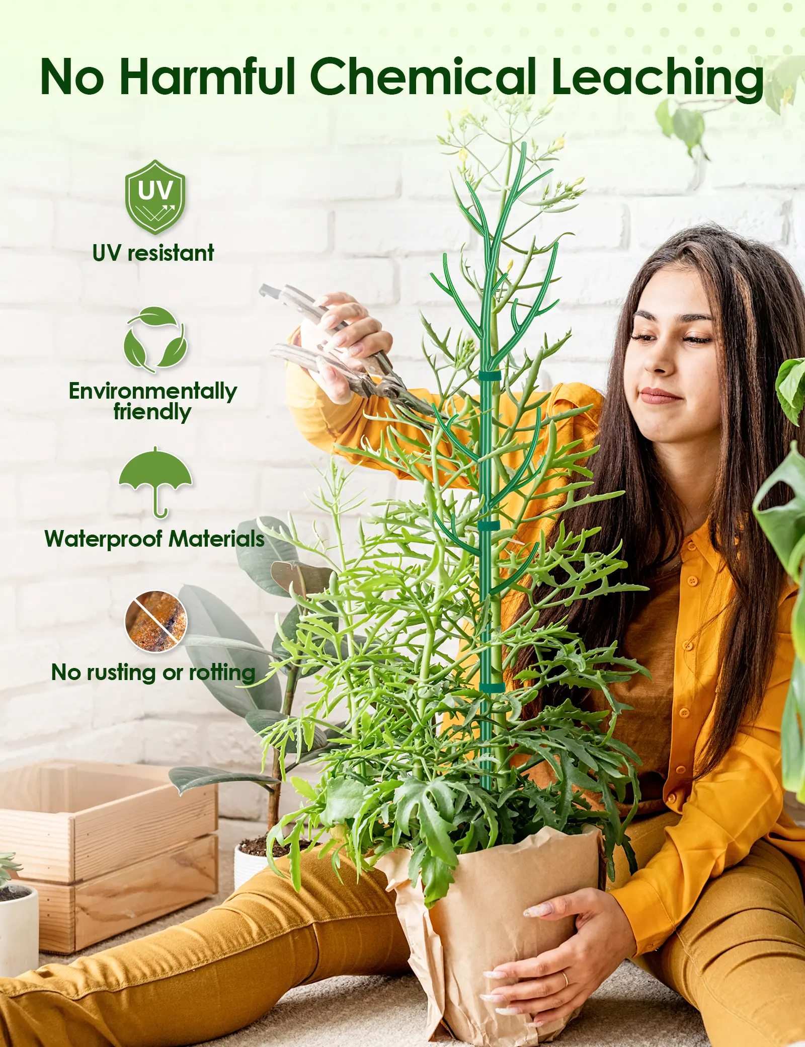 ✔️ High-Quality Plastic, No Rot or Rust: These plant stakes are made of plant-friendly plastic that doesn't leach harmful chemicals, is UV-resistant, won't fade, and is environmentally friendly. Unlike wooden stakes, they prevent root rot in plants. Unlike moss poles, they don't shed moss, won't wither, and don't emit any peculiar odors.