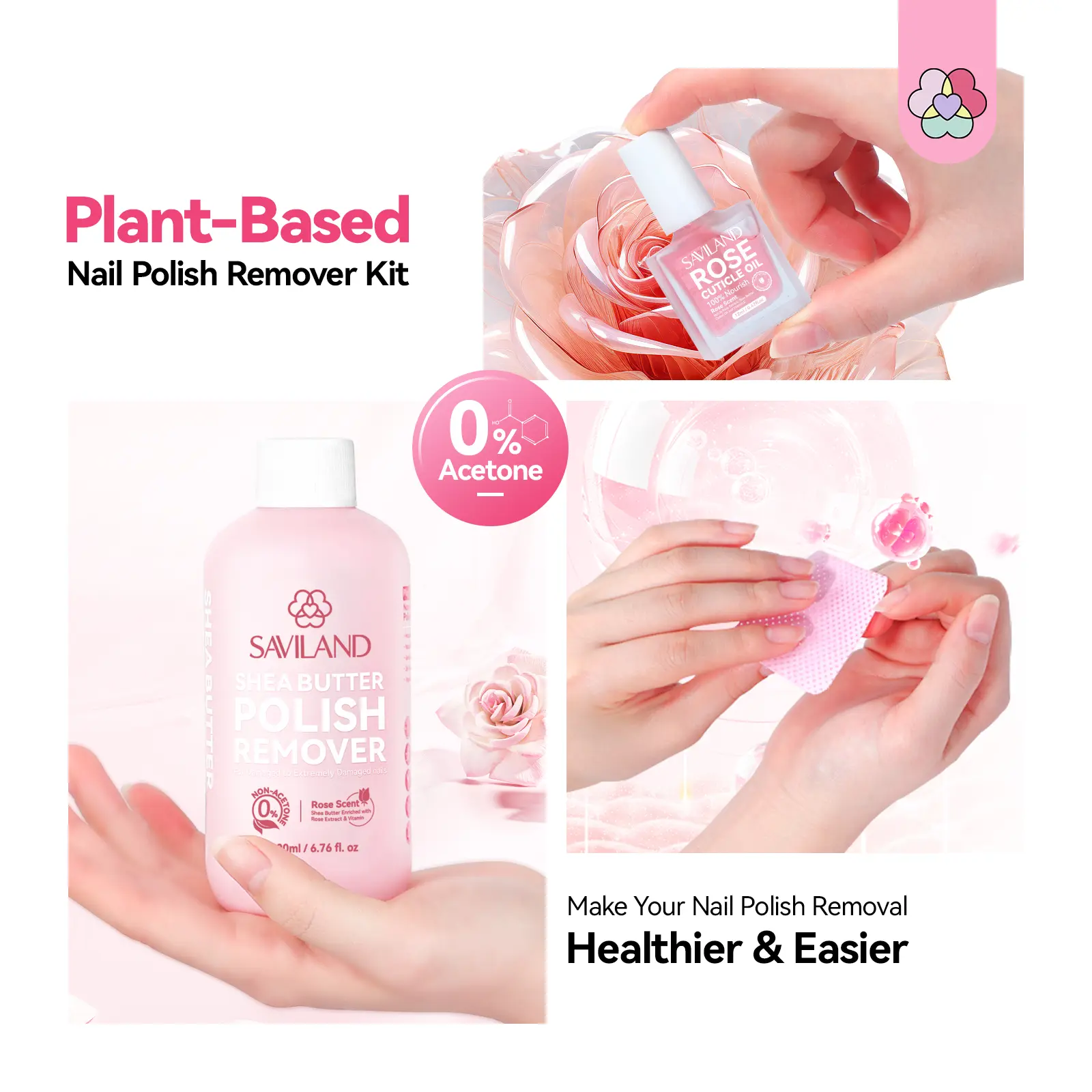 ·Acetone-Free & Natural: The SAVILAND Remover Kit, enriched with Shea Butter, Castor Oil, Vitamin E, and Rose Extract, is gentle on sensitive nails and has a pleasant rose scent. It is free from the harsh odors of traditional acetone removers.