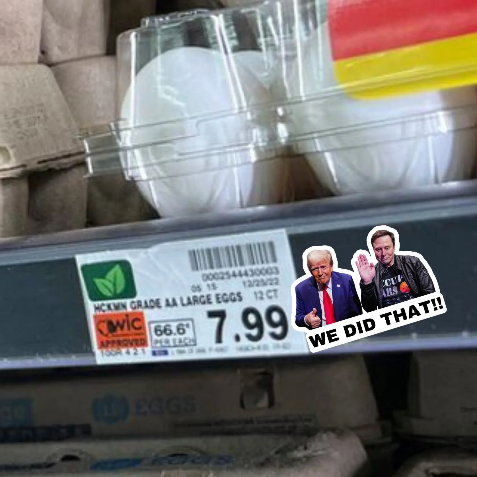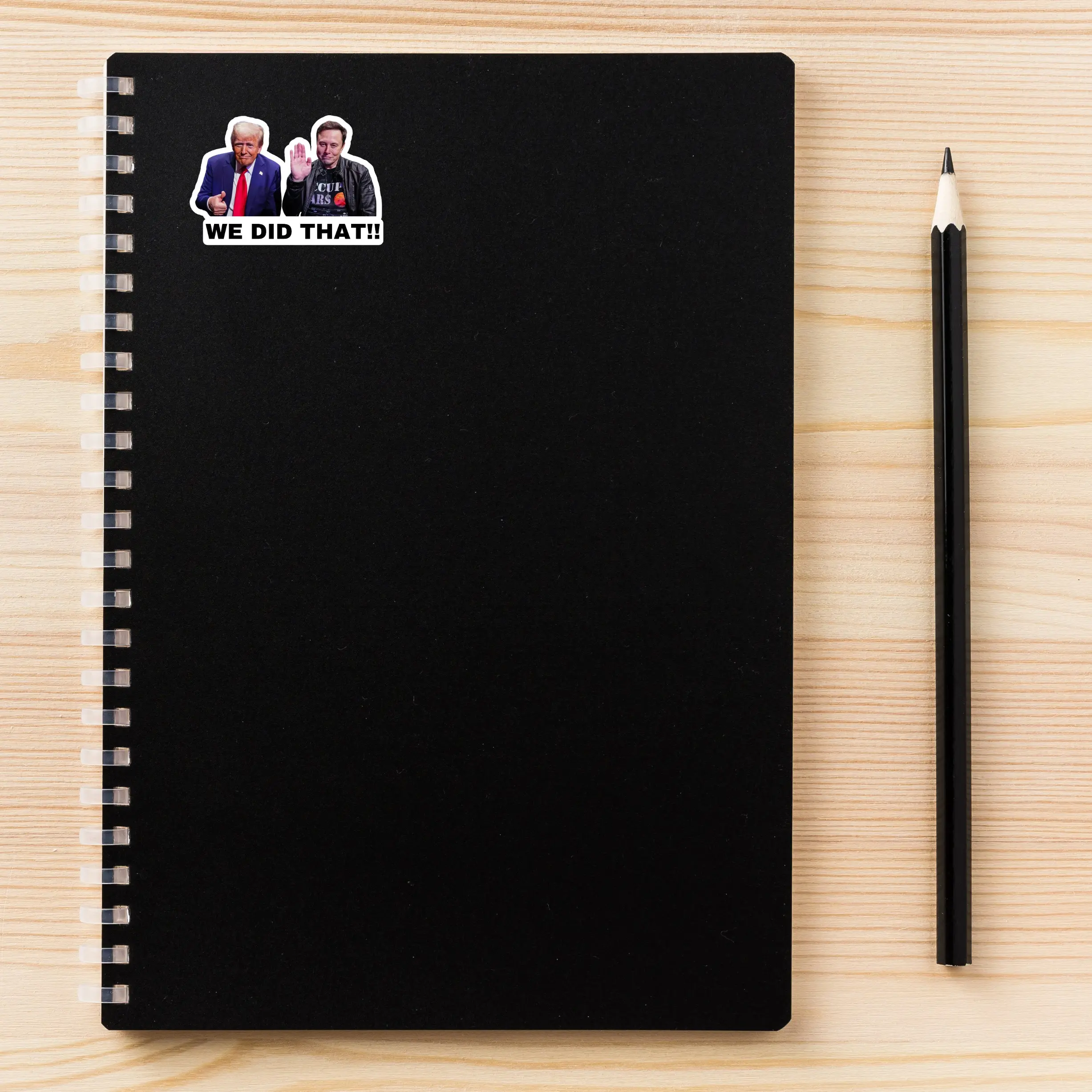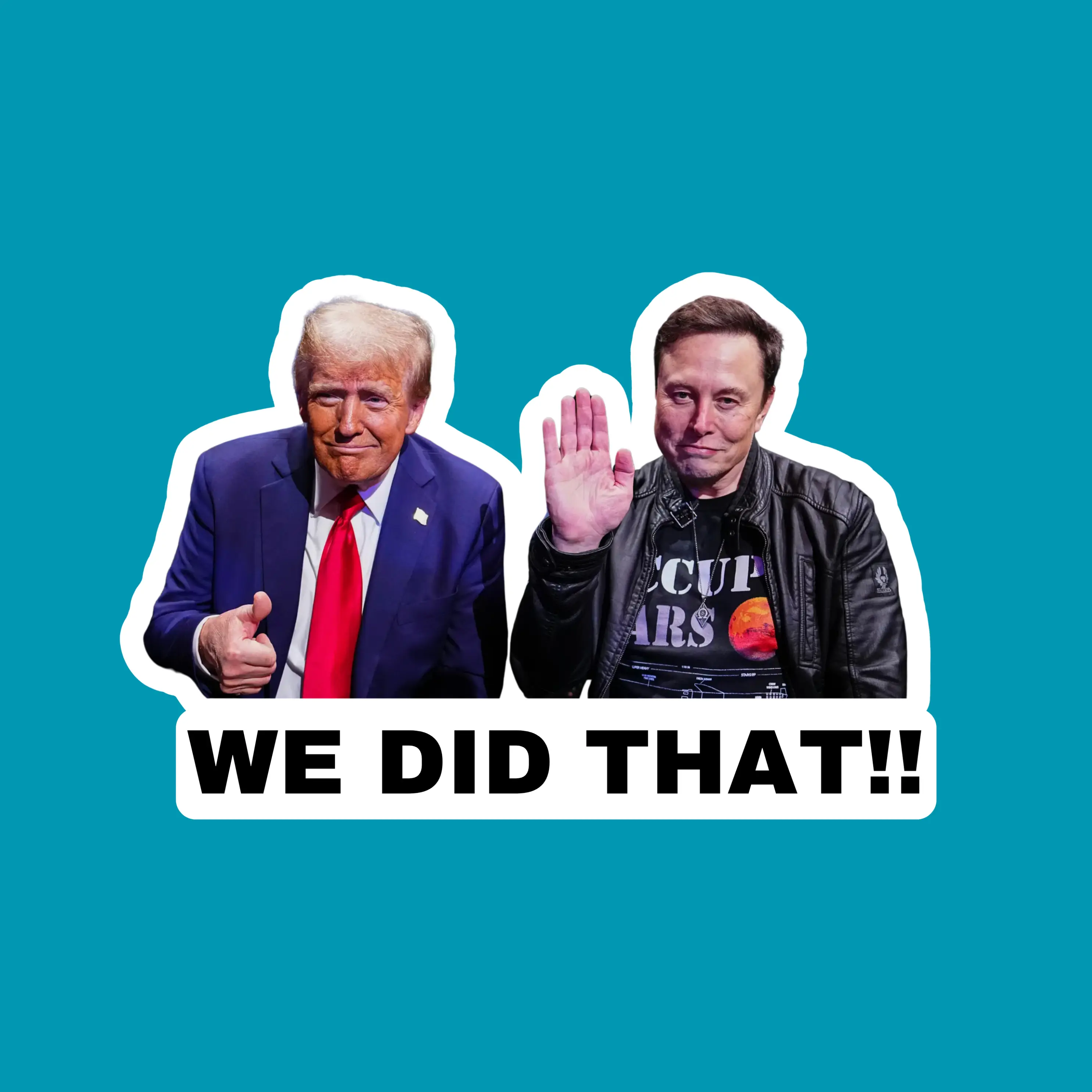 Make a bold statement with this Donald Trump and Elon Musk 'We Did That’ 2" x 1" inch sticker, featuring Trump and Elon awkwardly smiling with “We Did That!!” underneath.