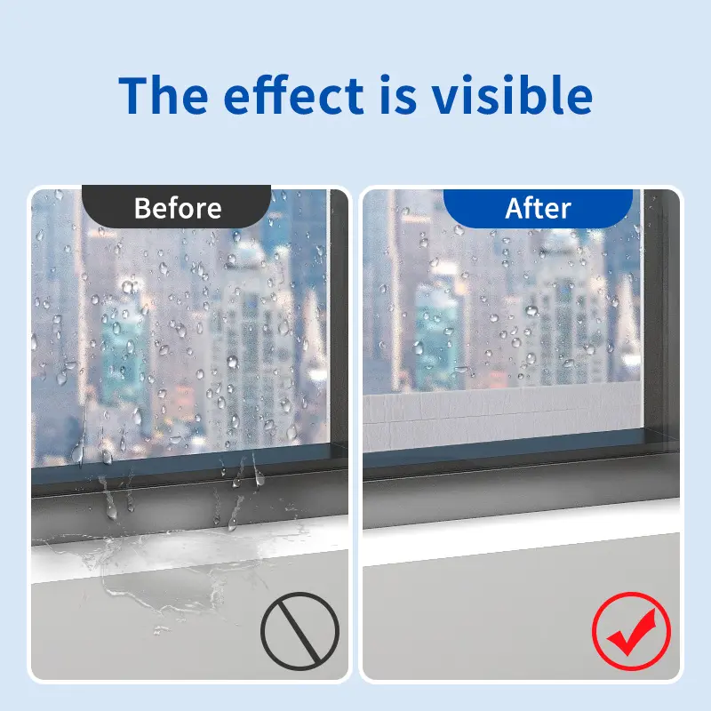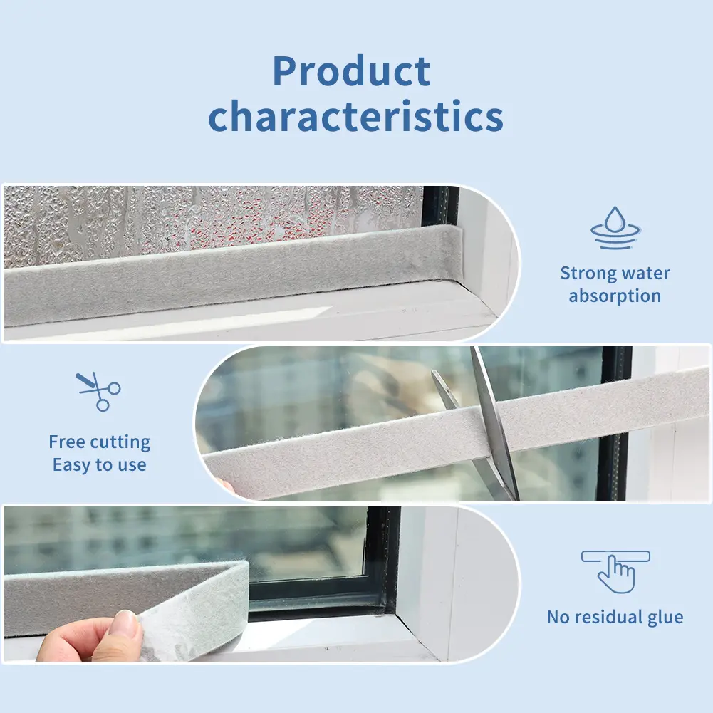 The condensation absorbent strip is a high density non-woven suede with strong water absorption and fast water absorption speed. The product is 0.17 inches thick and has a large water storage capacity. It can absorb 130g of condensed water per 1m, which can keep your windowsill dry without wiping it every day.