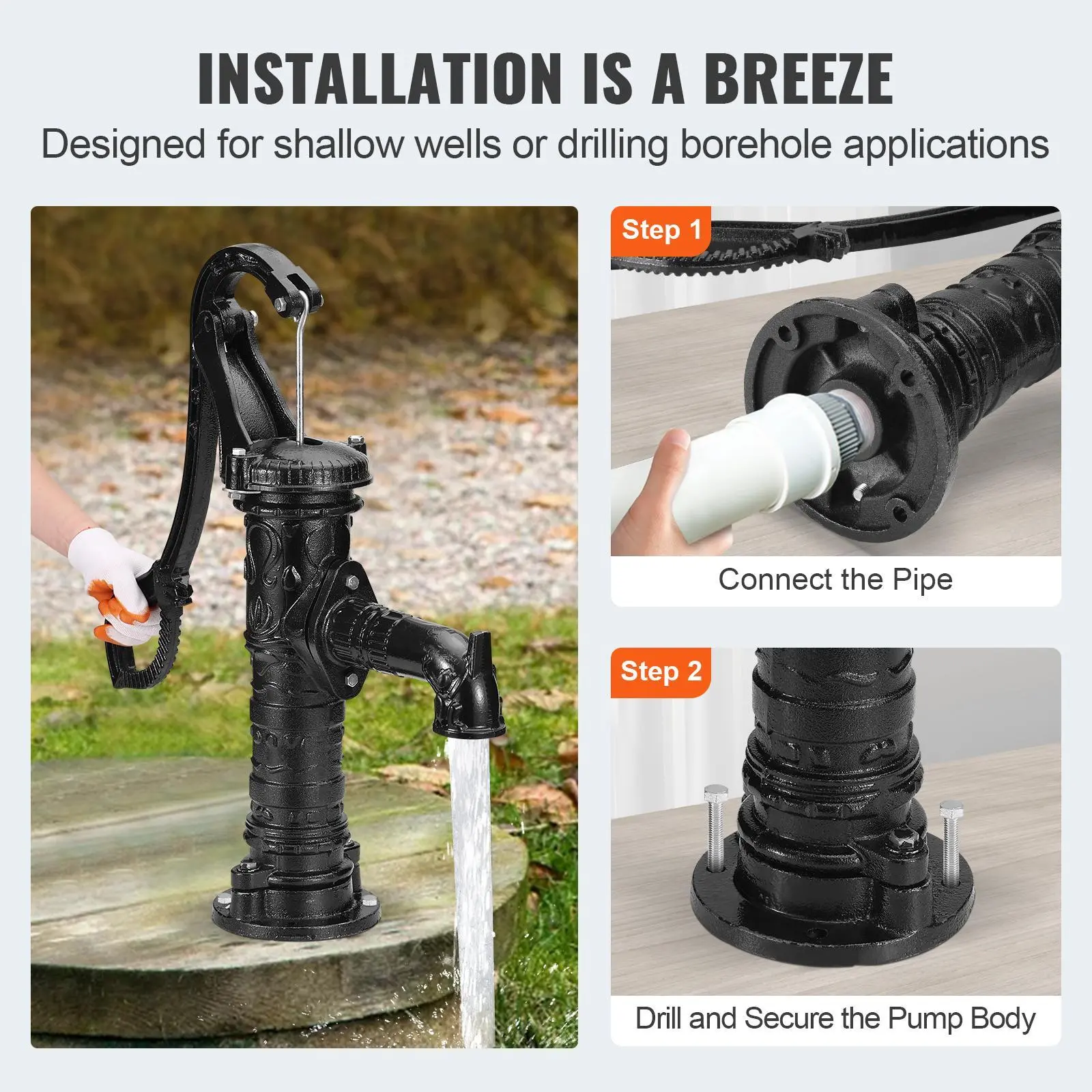 • Cast Iron, Built to Last: Our manual pitcher pump is forged from premium cast iron and coated with a rust-resistant layer to ensure longevity. Its thickened pipe wall can withstand the impact of a 20-pound hammer. Designed to withstand the elements, our manual well water pump is your steadfast ally, ready to serve in any setting.