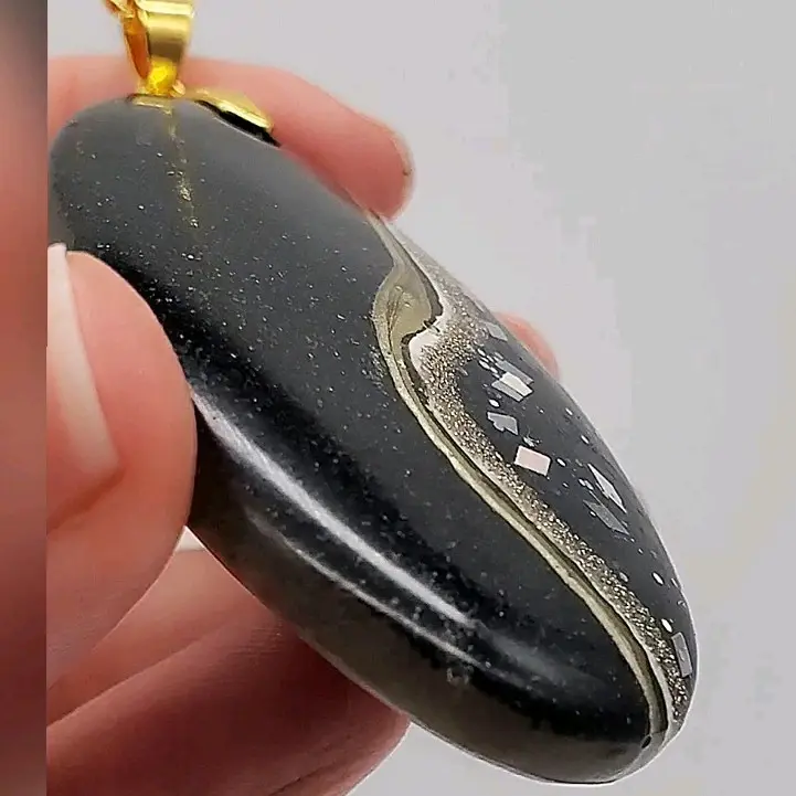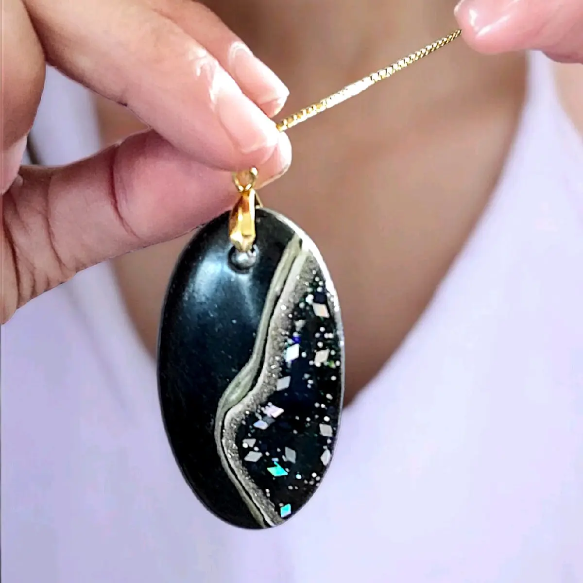 Pendant made of 100% orgonite with shungite and black tourmaline, which offers grounding, detoxification, and neutralization.