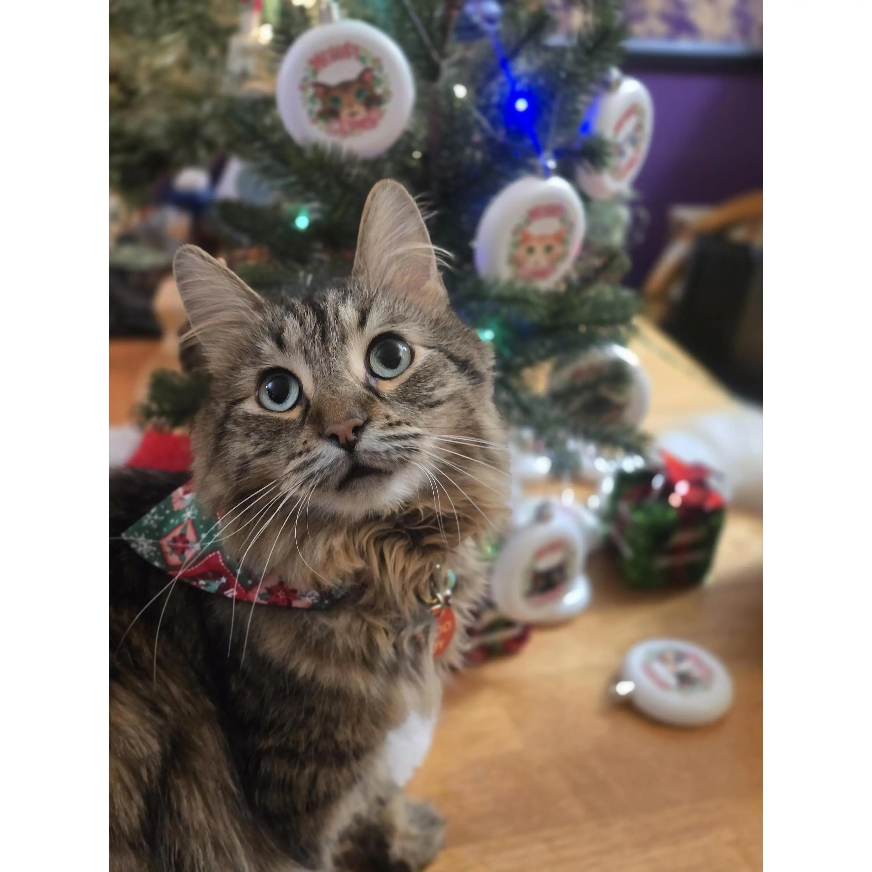What is better than hearing a bell come into the room on Christmas day? Maybe it's a cat wearing it!