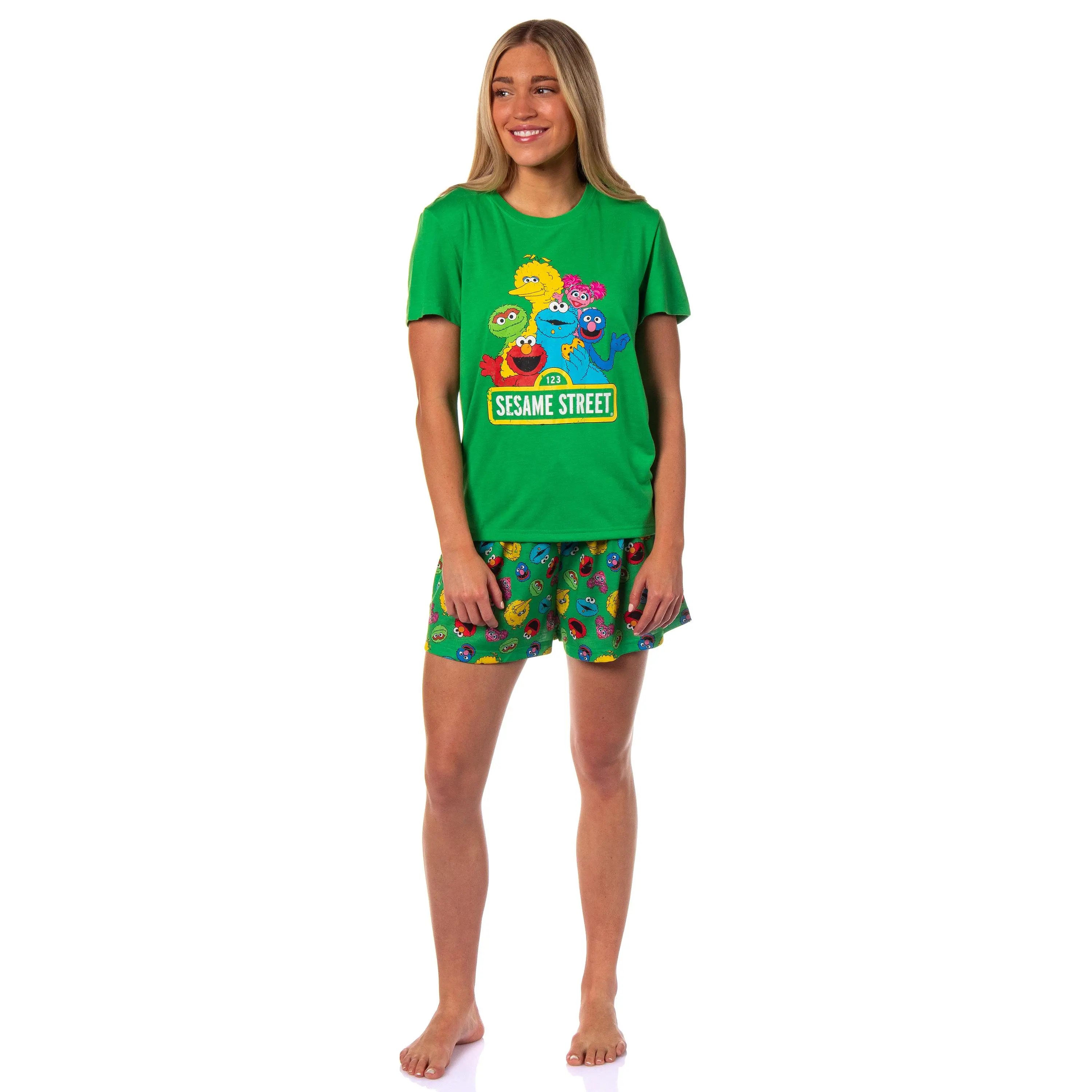 This pajama set is a playful and cozy ensemble that brings the joy of Sesame Street's lovable characters, Elmo, Oscar The Grouch, Big Bird, Abby Cadabby, Grover Monster and Cookie Monster, right into your bedtime routine. Designed for comfort and fun, this pajama set is for adults who cherish the magic of Elmo's world. Crafted from soft and breathable materials, It is made of 100% polyester for a comfortable fit. Wash cold and tumble low to maintain the vibrant colors of the pajama set. The pajama is a short and top set. These are the best! THIS IS SESAME STREET MERCHANDISE - Make bedtime an adventure with Elmo by your side. The pajama set is more than just sleepwear; it's a reminder that bedtime can be a whimsical journey filled with smiles and warmth. Embrace the playful spirit of Sesame Street and make your nights as delightful as can be! SIZING / SOFT EVERYDAY FABRIC BLEND - Designed for a relaxed fit, this pajama set is for lounging around the house, binge-watching your favorite episodes, or enjoying a cozy night in with loved ones. The breathable fabric makes it ideal for year-round wear. It is listed in women's sizing (XS-3X). For visual reference our model is 5 feet 6 inches tall and is wearing a size M. For best fit please follow our sizing chart in the listing. DETAILED ELMO'S WORLD CHARACTER THEME - This pajama set is a playful and cozy ensemble that brings the joy of Sesame Street's lovable characters, Elmo, Oscar The Grouch, Big Bird, Abby Cadabby, Grover Monster and Cookie Monster, right into your bedtime routine. The pajama set features the fun characters on the chest and a tossed print of their faces on the shorts THESE LET YOU LOUNGE AROUND IN COMFORT WITH GREAT FEATURES - You will feel the difference in quality when you slip these on. These pajama shorts have a tie and an elastic-stretch waistband for a snug fit at the waistline! The shirt features a classic comfy crewneck fit FOR ANY OCCASION - Get ready to snuggle up in style with this charming pajama set that captures the playful spirit of Sesame Street. for a gift to adult fans of looking to show off their love for the series