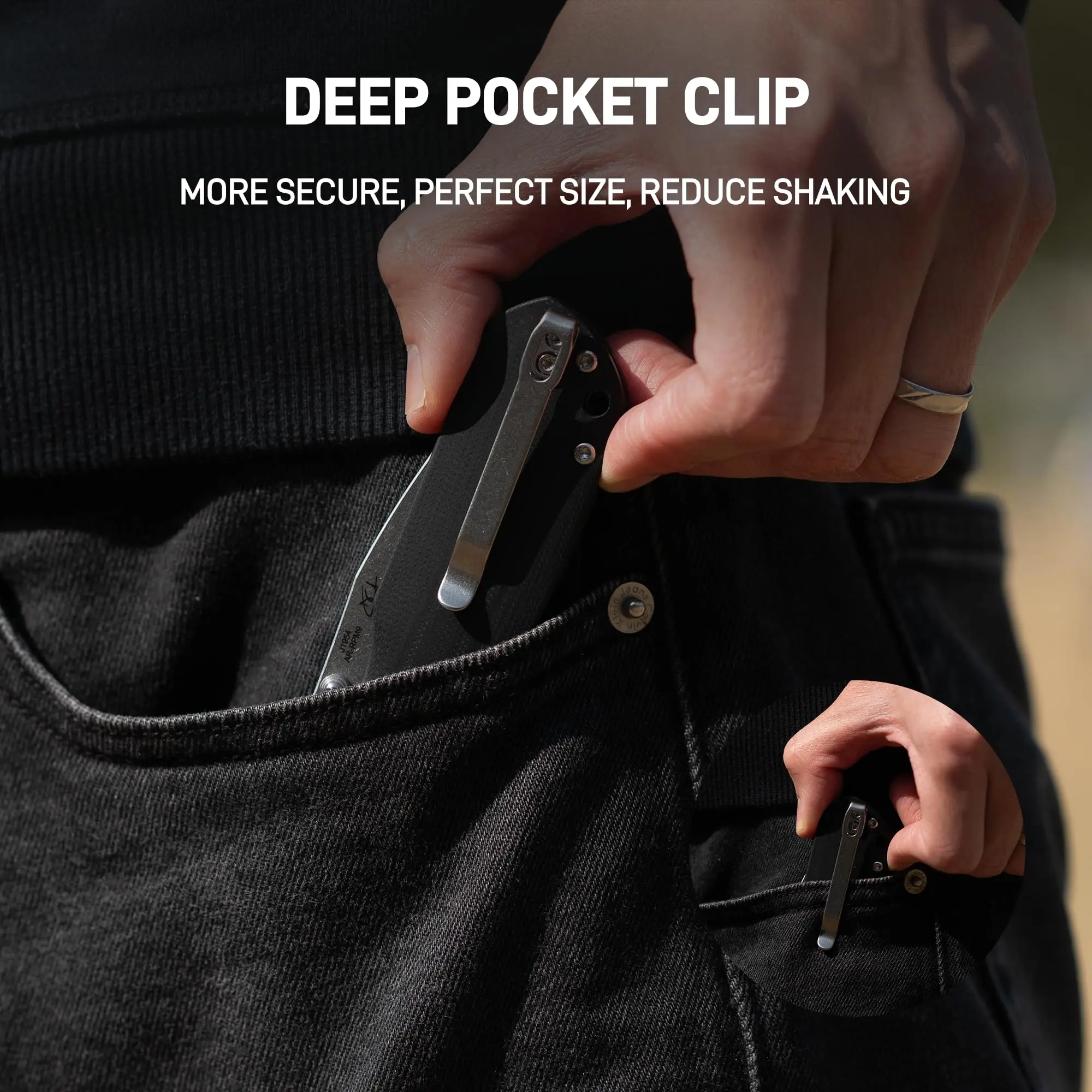 ·Excellent Locking Mechanism: Featuring a crossbar Lock design with ceramic ball-bearing pivot construction, this pocket knife ensures security, ambidextrous use, and finger-safe closing operation. Equipped with a deep pocket clip for convenient carry on the go