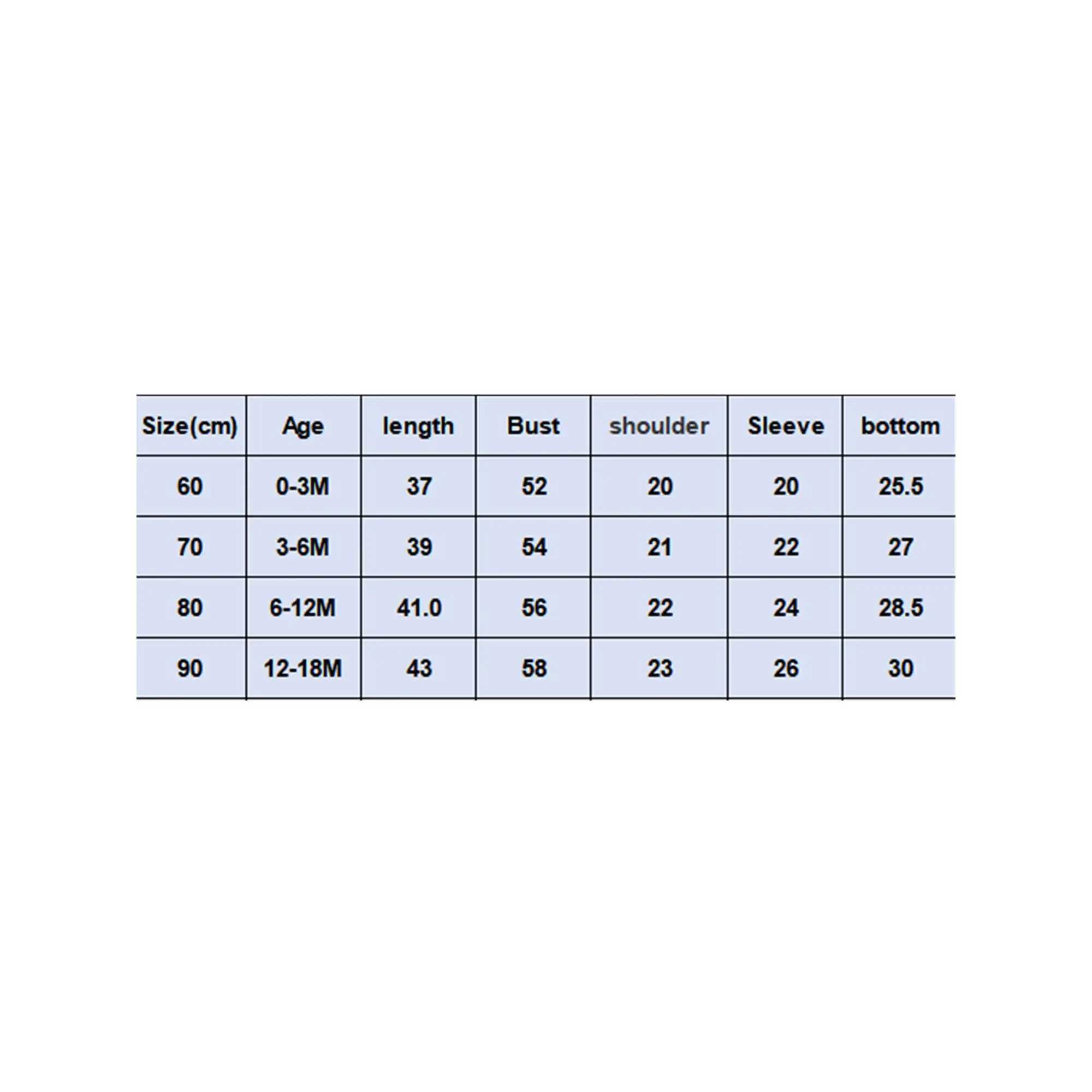 60 Length: 14.57 Bust: 20.47 Sleeve: 7.87 Shoulder: 7.87 Advised Age: 0-3 Months