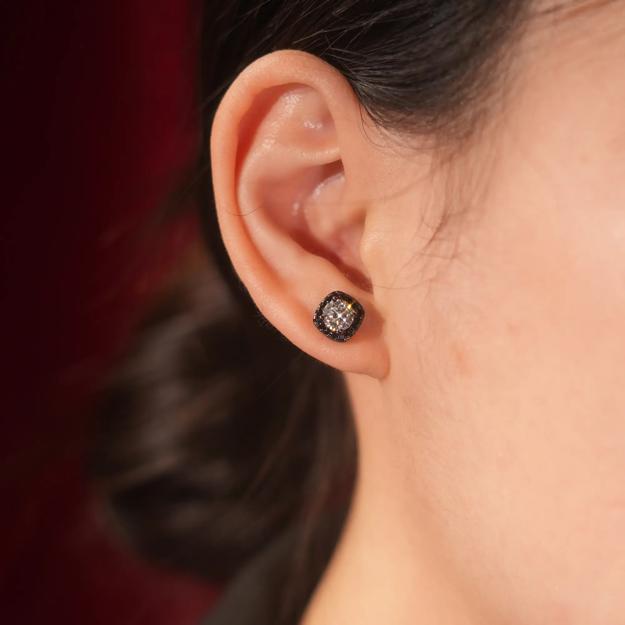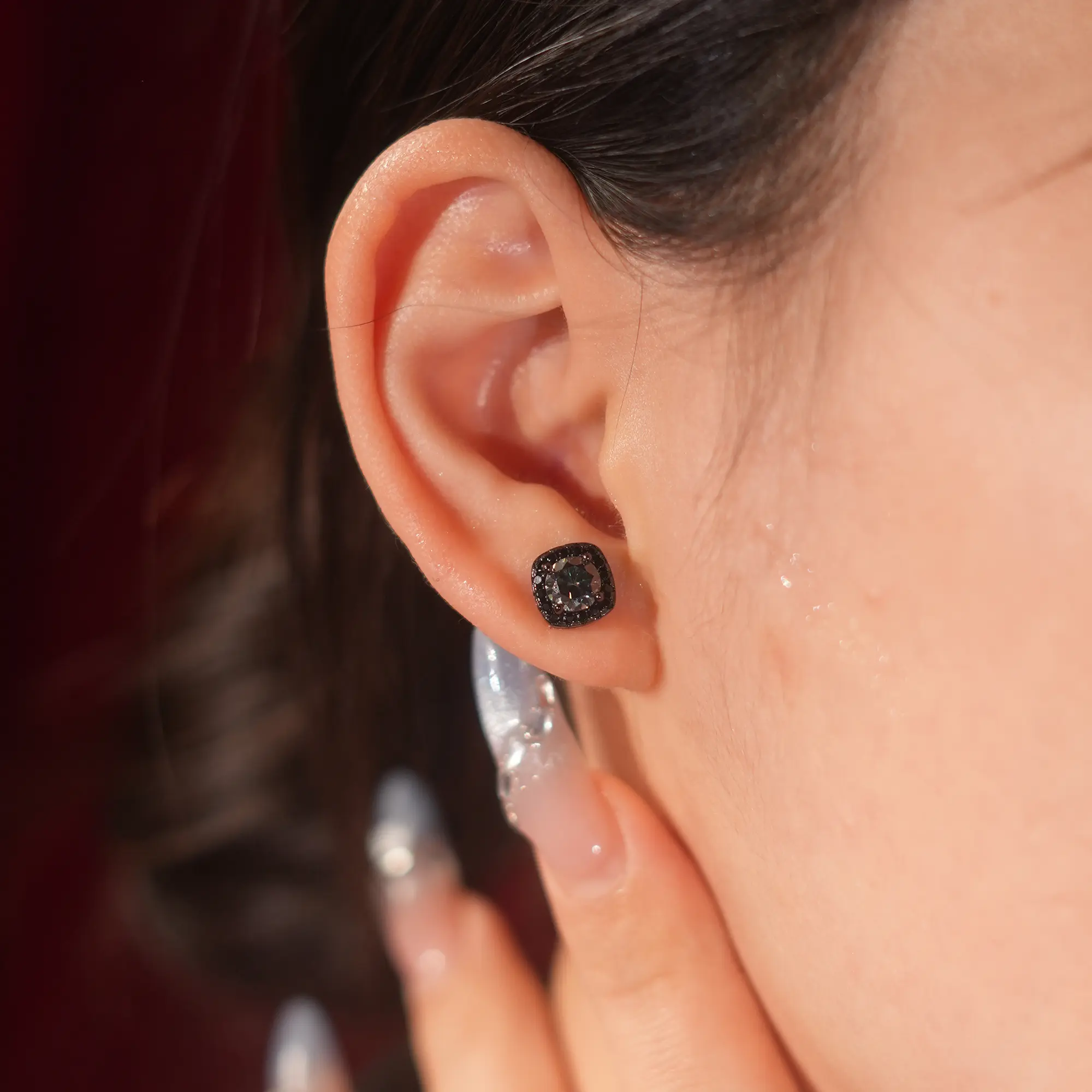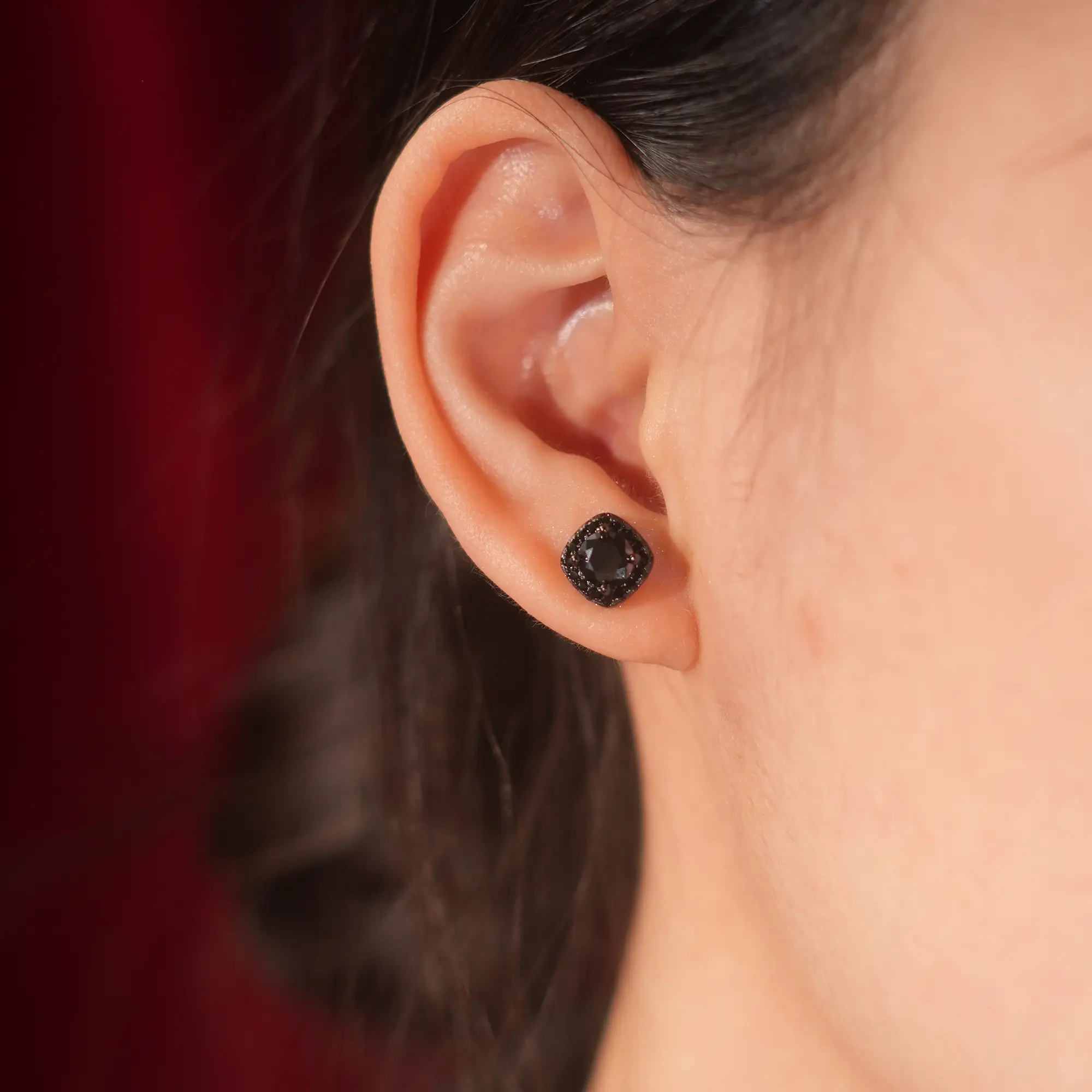 Discover the elegance of the Livestream-3 1CT Total Black Square Halo Synthetic Moissanite Earrings, designed to add a touch of sophistication to any outfit.