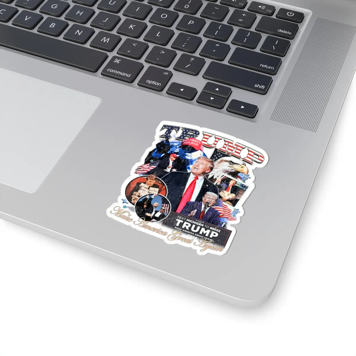 A Donald Trump Make America Great Again sticker that is perfect for those looking to display their political views proudly. This sticker is ideal for laptops, journals, windows, and more, offering a scratch-resistant surface with vibrant colors. Relevant for supporters of Donald Trump and patriotic Americans, suitable for political events and Independence Day celebrations.