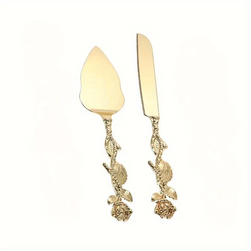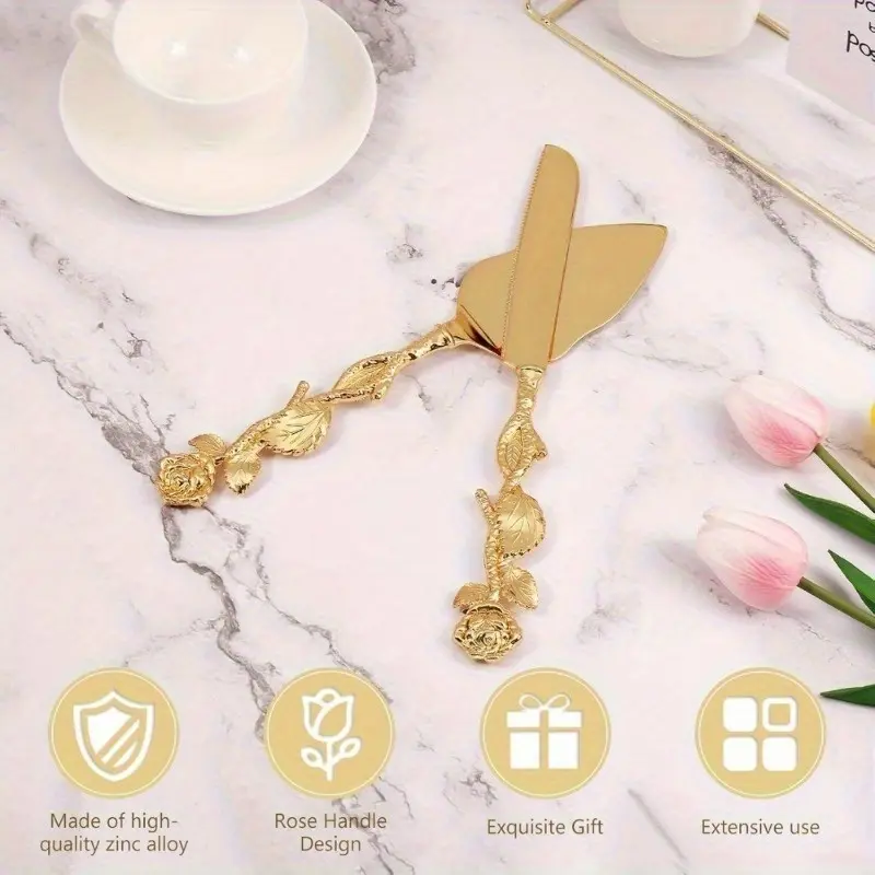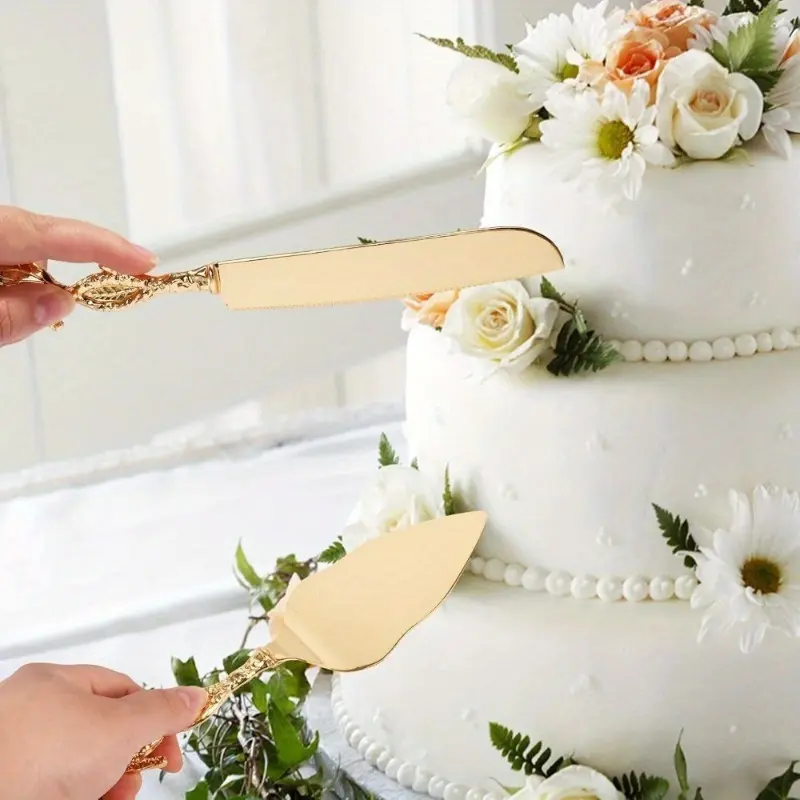WIDELY APPLICATION: The cake knife set is made of premium one-piece zinc alloy, which is durable, safe to use and stands the test of time. The cake knife and server both have suitable sizes. Beside of cutting a wedding cake, the server set is perfect for serving cake, pie, crepe or any other dessert.