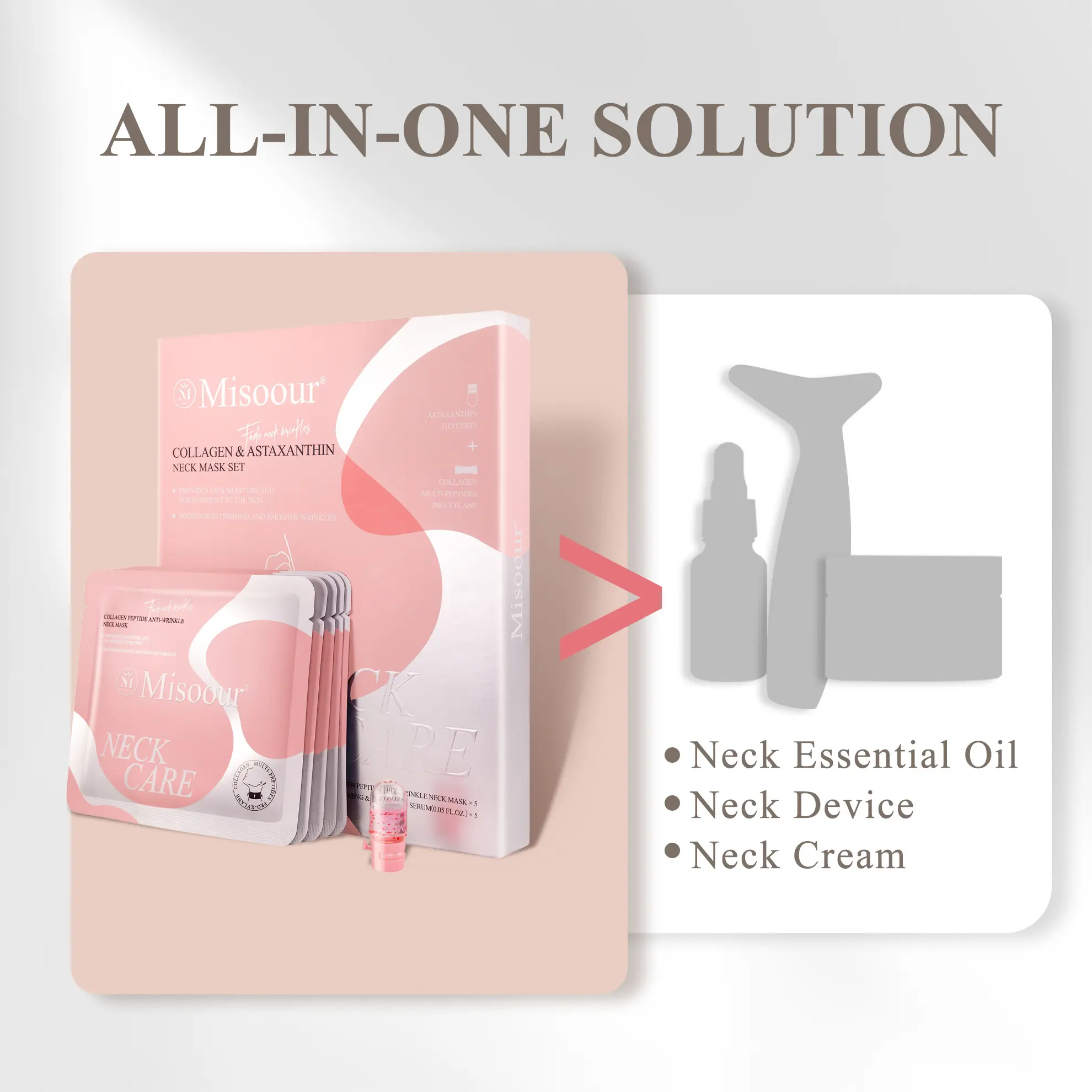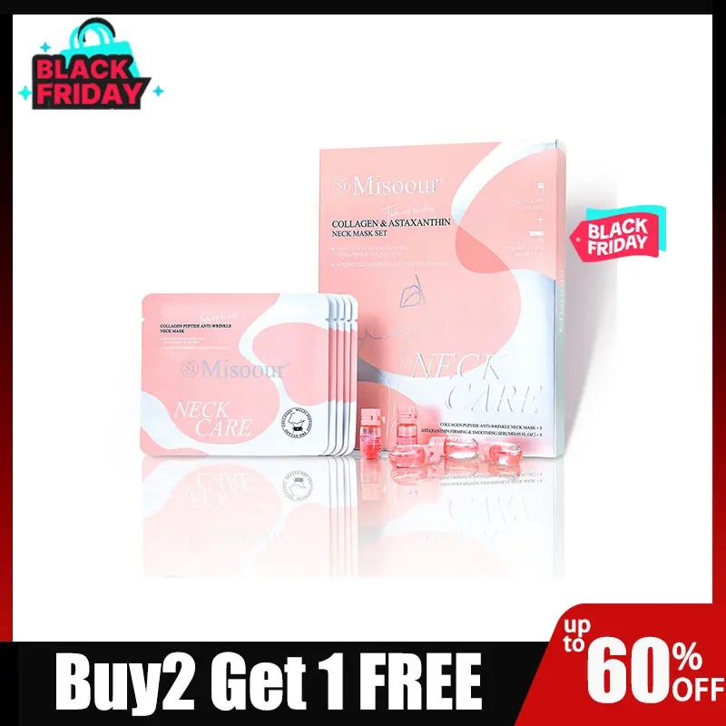 ¡1 Misoour Neck Mask Set Includes: Astaxanthin Firming & Smoothing Serum X 5Collagen Peptide Anti-Wrinkle Neck Mask X5Equivalent to 5 Professional Neck Facial Treatments in one convenient set!
