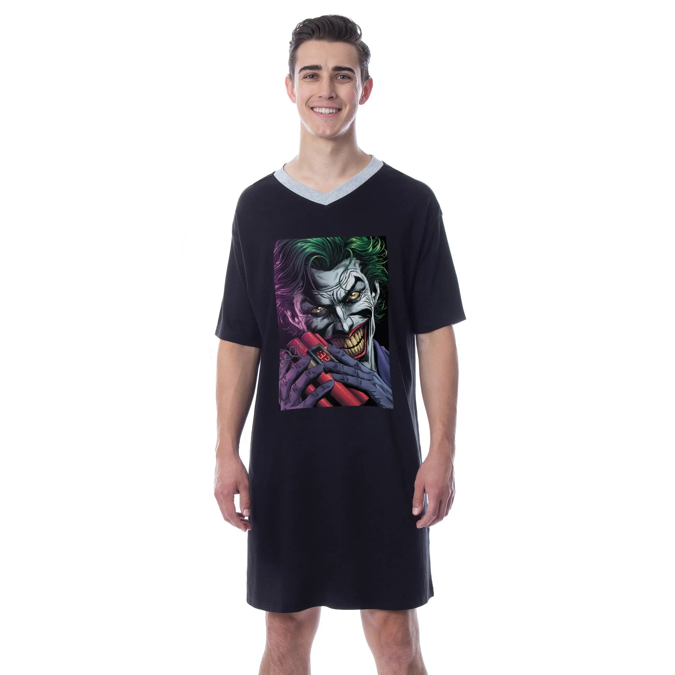 HA! HA! HA! Known as Batman's archenemy, The Joker is one of DC Comics' most villains. Though there are several variations of his origins, one thing remains true in all his adaptations--he's sure to cause trouble for the legendary crime-fighter of Gotham. This pajama shirt features The Joker holding some TNT in a comic style across the chest. The pajama is a soft 60% cotton and 40% polyester blend. THIS MERCHANDISE IS - Intimo specializes in top-notch, sleepwear for men, women, boys, and girls. Intimo is the industry leader in pop culture products and apparel that deal with the entertainment industry in comic books, tv shows, movies, music, sports, and what's trending. SIZING / SOFT FABRIC BLEND - The sleep dress is made of a super-soft 60% cotton and 40% polyester fabric blend. It is listed in men's sizing. CLASSIC DESIGN - This pajama shirt features The Joker holding some TNT in a comic style across the chest. It's for curling up in and enjoying all your favorite DC Comics media! THIS MERCH LET'S YOU LOUNGE AROUND IN COMFORT WITH GREAT FEATURES - You will feel the difference in quality when you slip this on! This pajama nightgown has a v-neck style top, as well as a knee-length rise and short sleeves. GIFT FOR ANY OCCASION - Magnificent design for everyday use. This pajama is designed with true fans in mind. It makes a great gift for Birthdays, Christmas, Valentine's Day, Easter, Father's Day, Mother's Day, or any other special occasion! In fact, it makes a gift for YOURSELF, because you might be the biggest fan of all.
