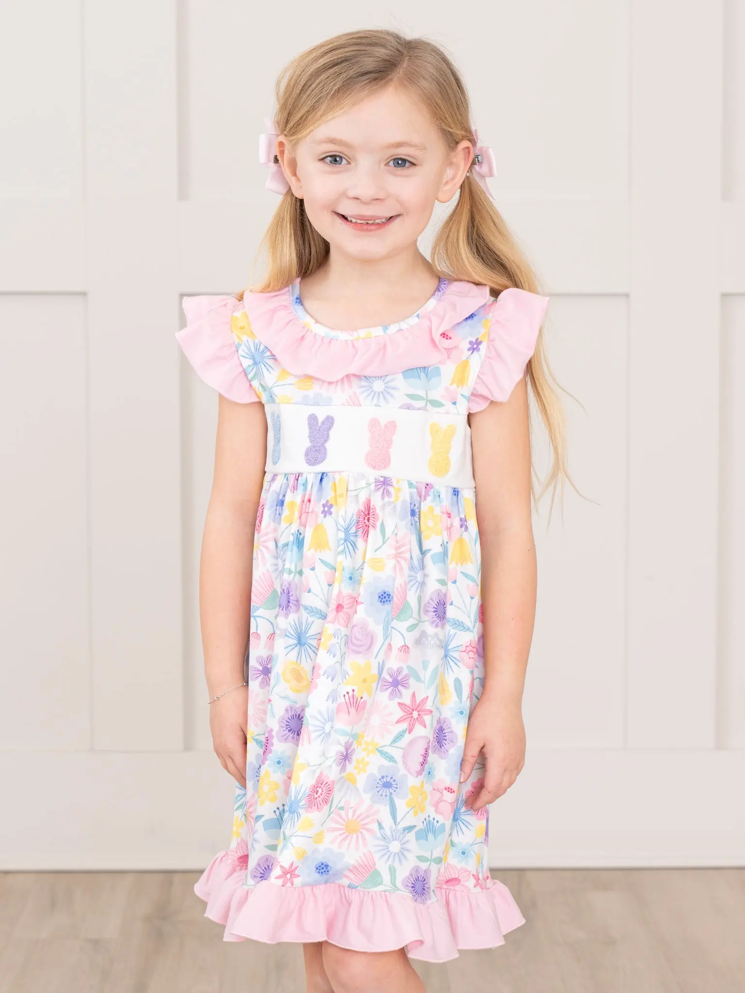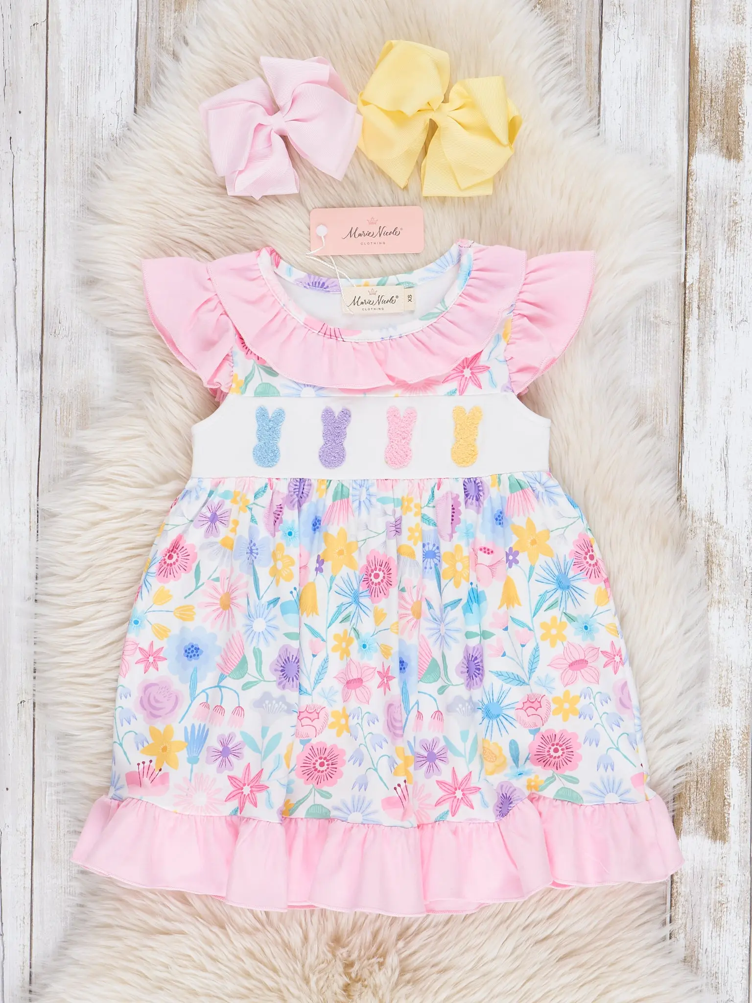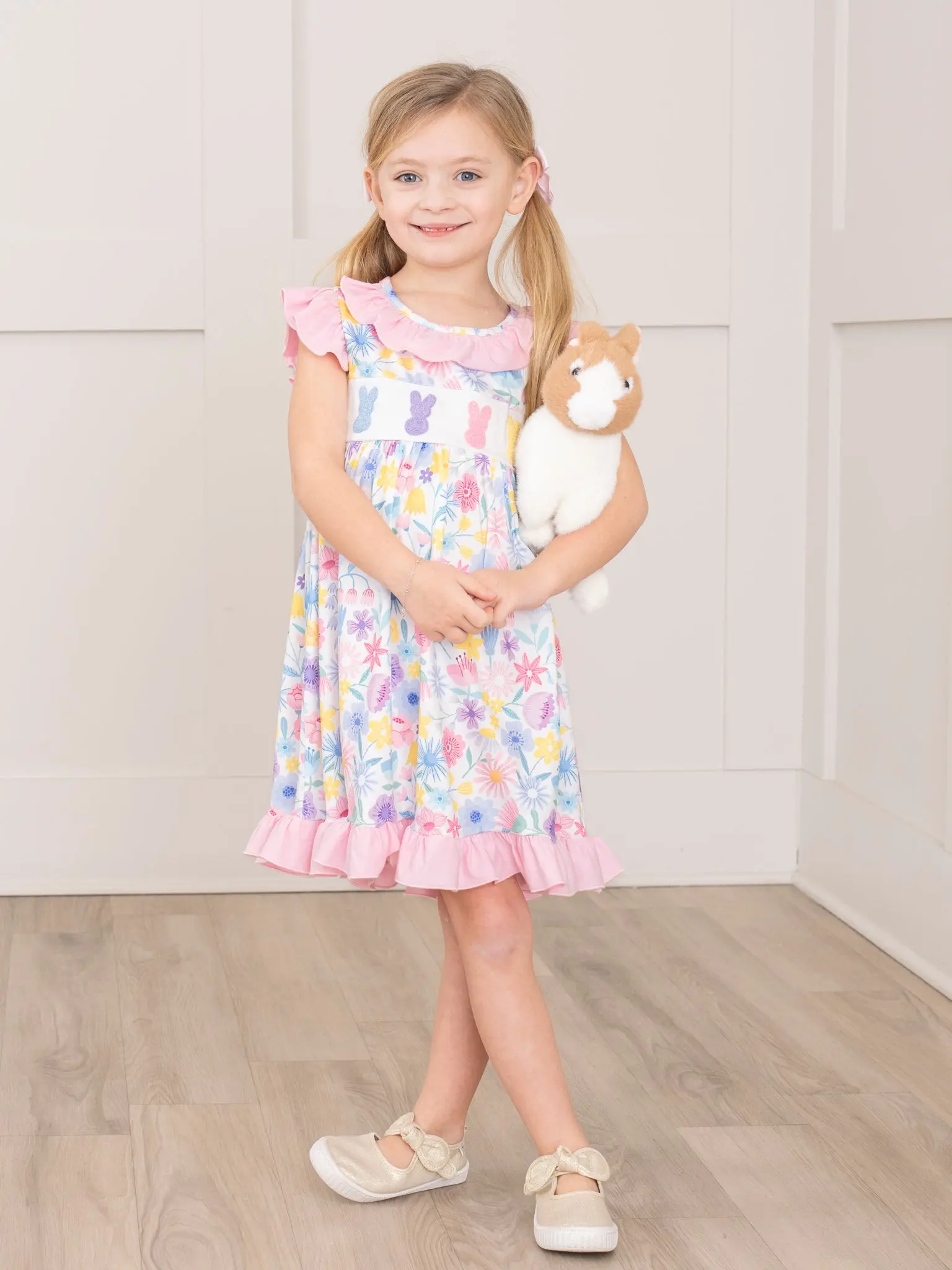 Hop into spring with this adorable Bunny Garden Embroidered Ruffle Dress! Made with a whimsical watercolor garden print and cute embroidered chenille bunnies, this dress is perfect for Easter or any springtime occasion.