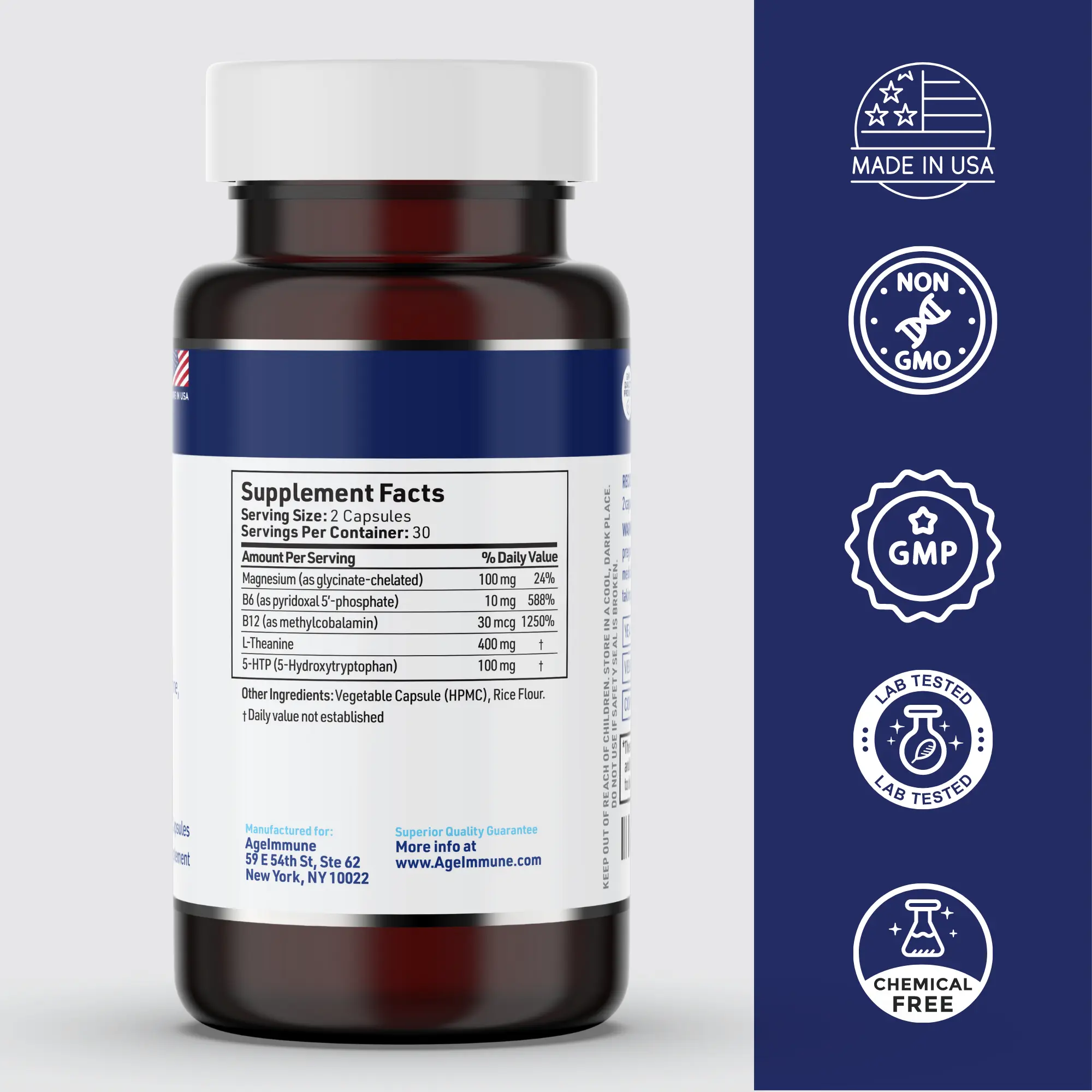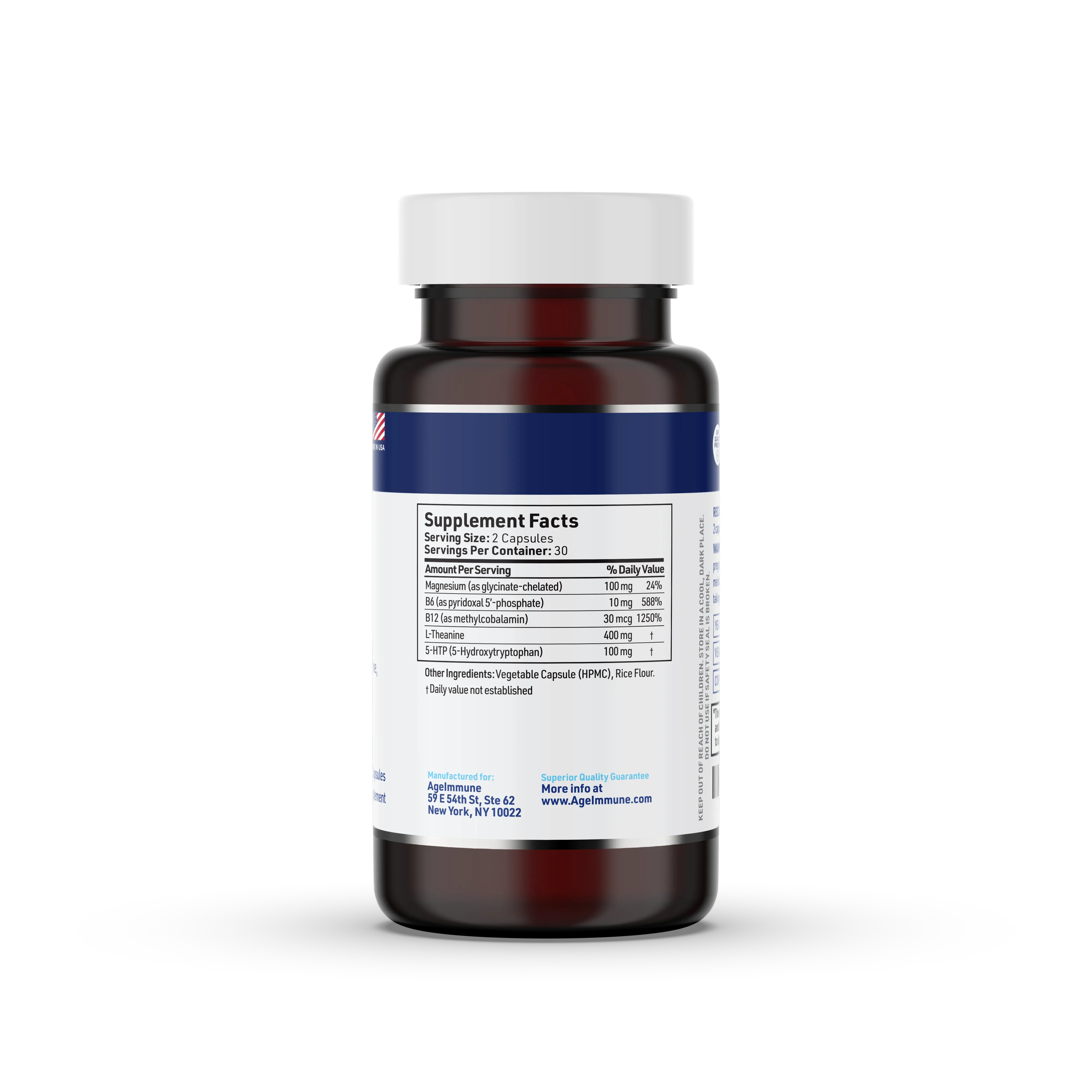·For teenagers and adults suplements formula to help handle stress and relax: Magnesium 100mg, B6 10mg, B12 30mcg, L-Theanine 400mg, 5-HTP 100mg.